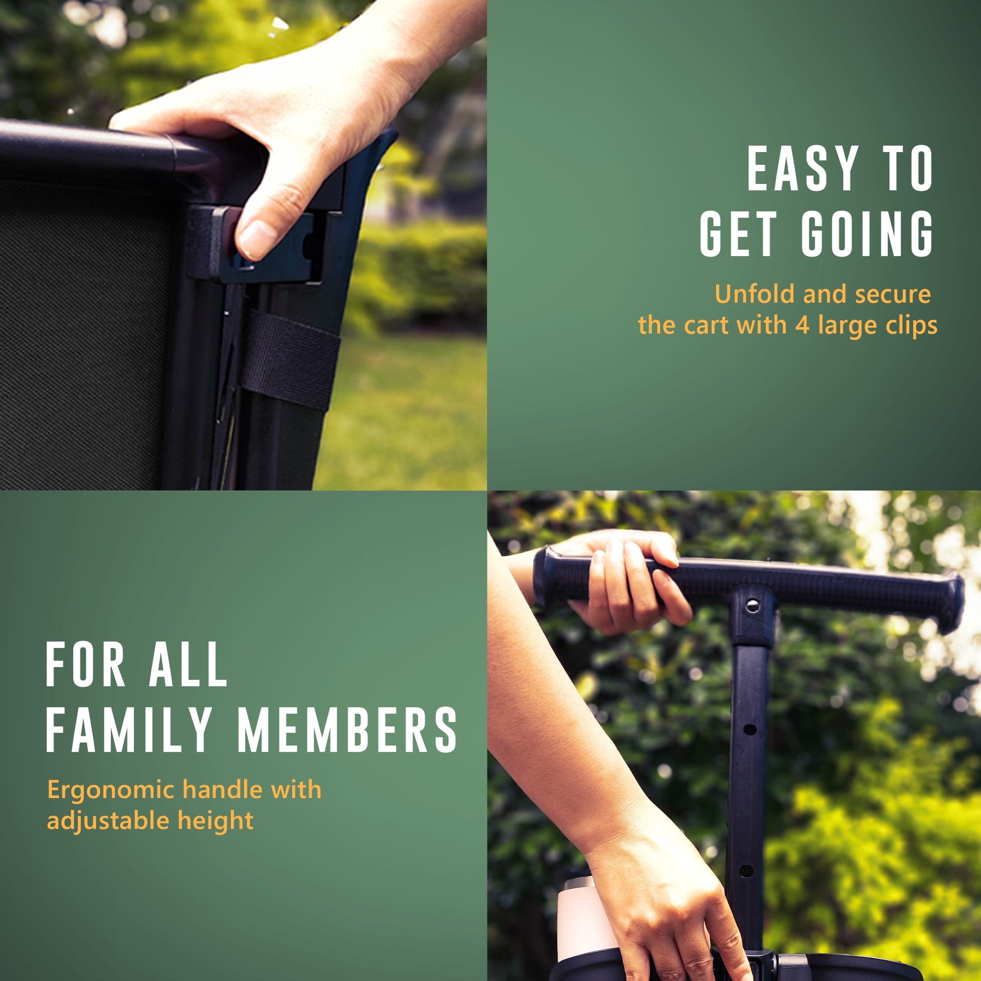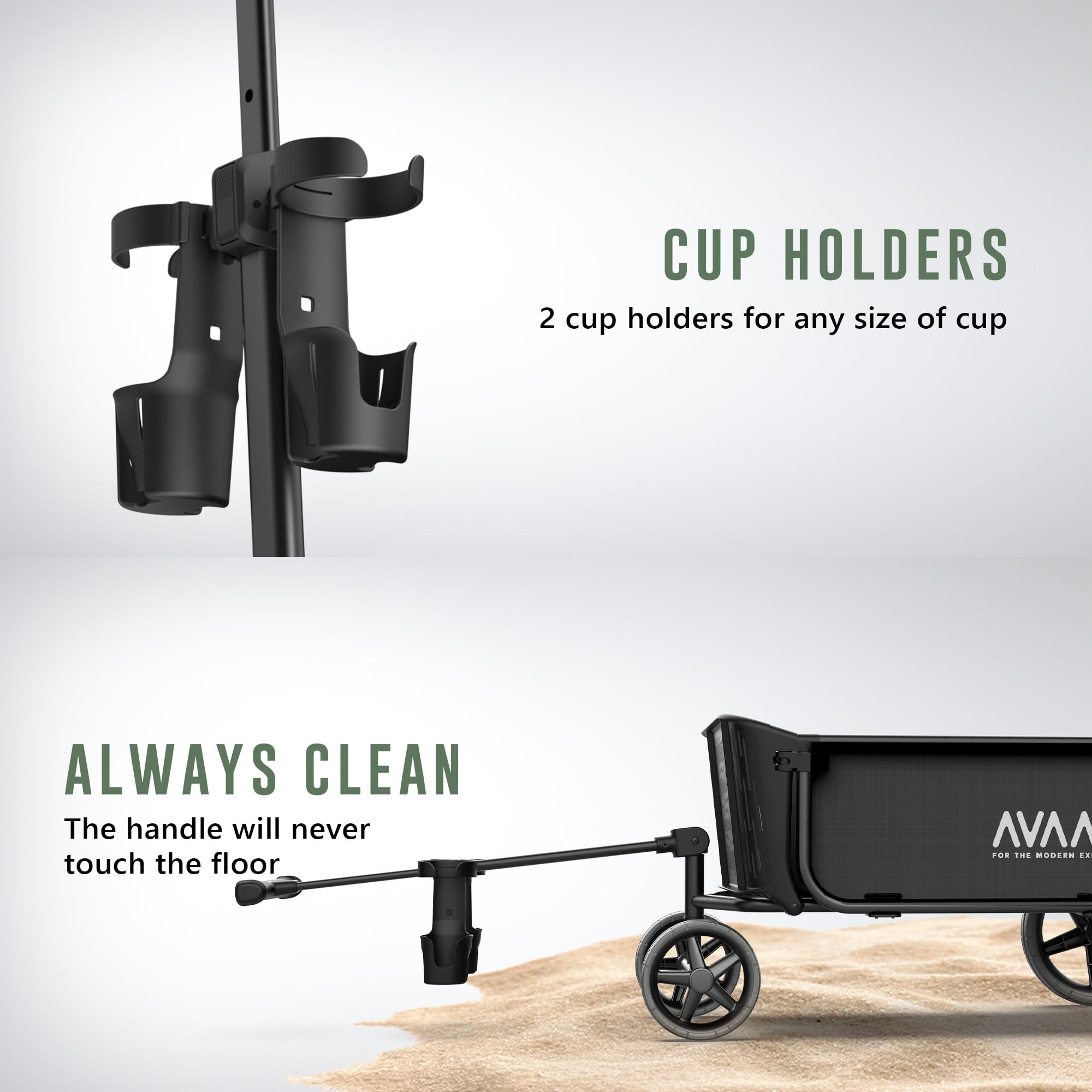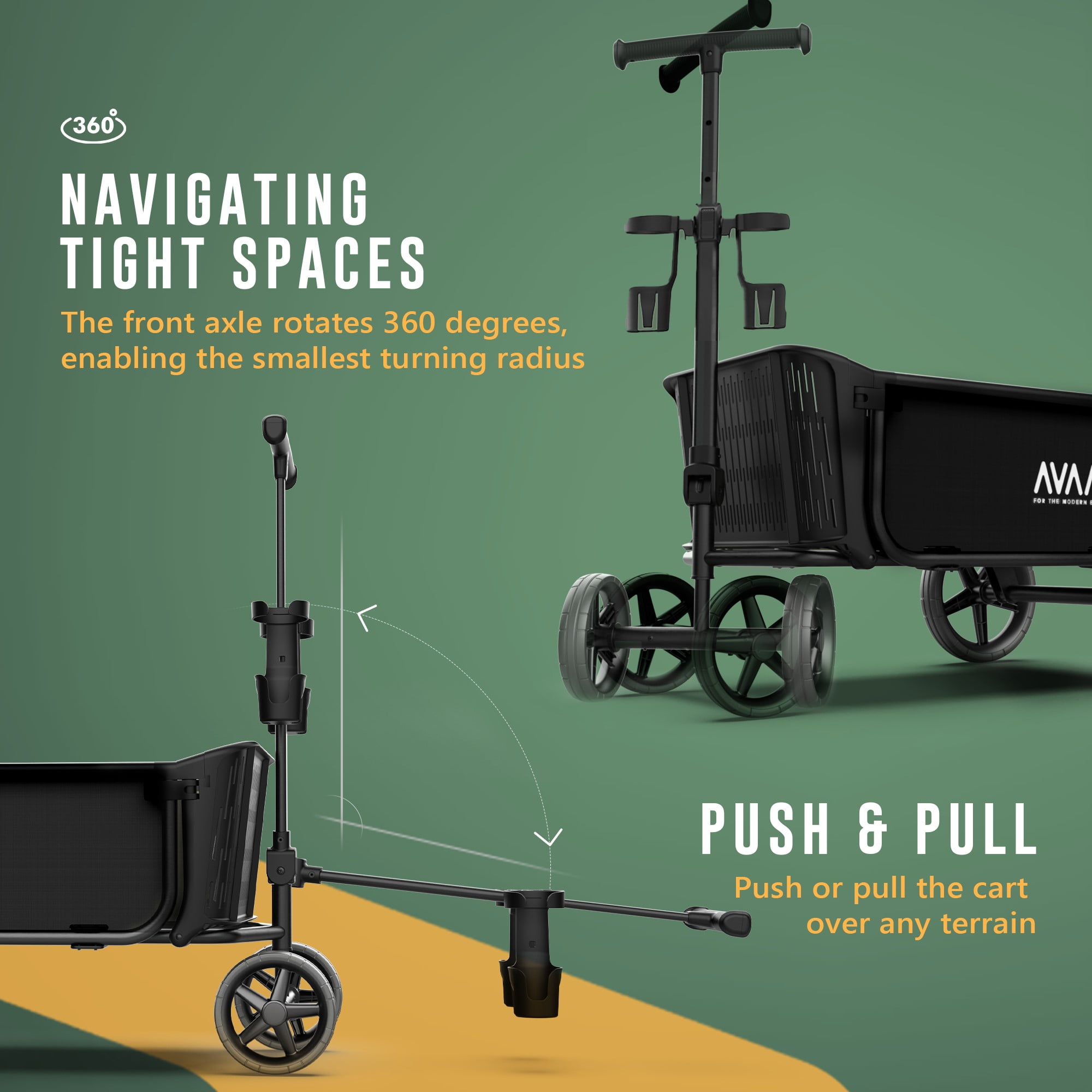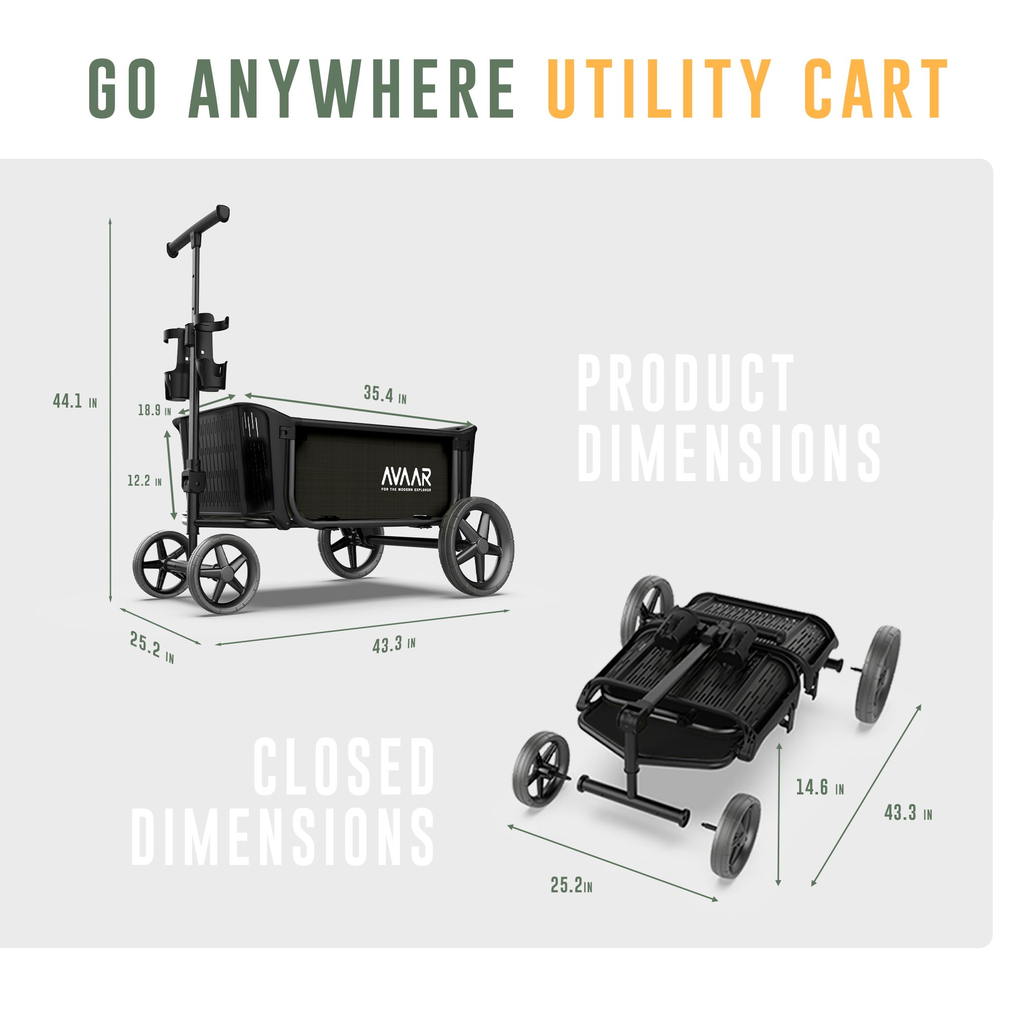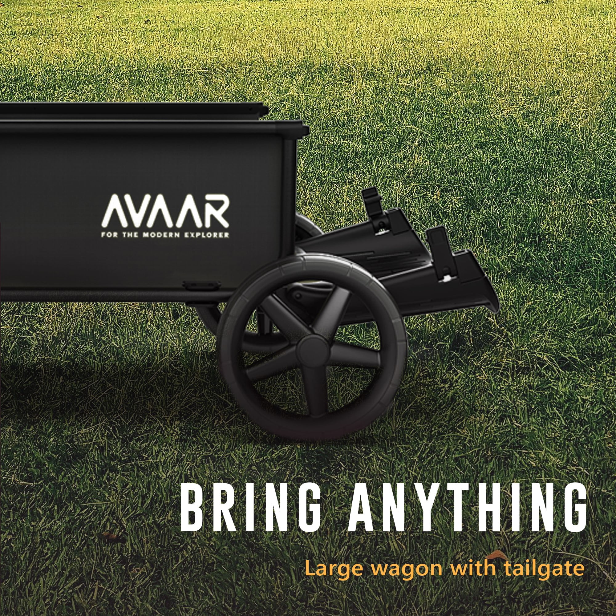 Push and Pull operation Large all terrain wheels: Front 8 “ back 12” Maximum weight capacity: 400 lbs Folded size for convenient transportation: 43.3 ’’L X 25.2’’W X 14.6 ’’H Easy self-assembly Height adjustable handle Tailgate function to fit long items 2 spill proof cup holders for any cup Shock absorbing rubberized tires Assembled dimensions: 43.3’’L X 25.2’’W X 44.1’’H Weight: 33.7 lbs. For more information, contact the Avaar customer service team Color: Black