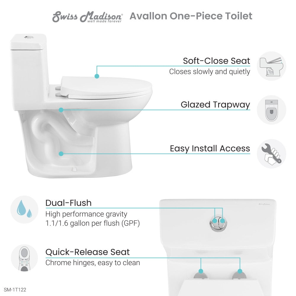 Dual Flush: The buttons for dual flush allow you to choose between a low 1.1 GPF light flush or a high 1.6 GPF full flush. Rough-In: Standard 12″ Rough-In Standard Elongated Bowl: The elongated bowl provides extra room and comfort. Between 17-19 inches, the comfort height toilet makes standing and sitting easier, especially for taller individuals. Many are ADA-compliant. Durable Non-Porous Scratch Resistant Ceramic: Developed from ceramic, that is scratch-resistant and non-porous, providing a durable and reliable option that can withstand routine use. Fully Glazed Trapway: The glazed trapway prevents clogs and keeps water flowing freely. Soft Close and Quick Release Seat: Provides a silent and gentle closing mechanism for added convenience and safety. With just the push of a button, the seat detaches completely for a thorough cleaning. Collection: Part of the Avallon Collection, explore additional products in this collection to complete the room.