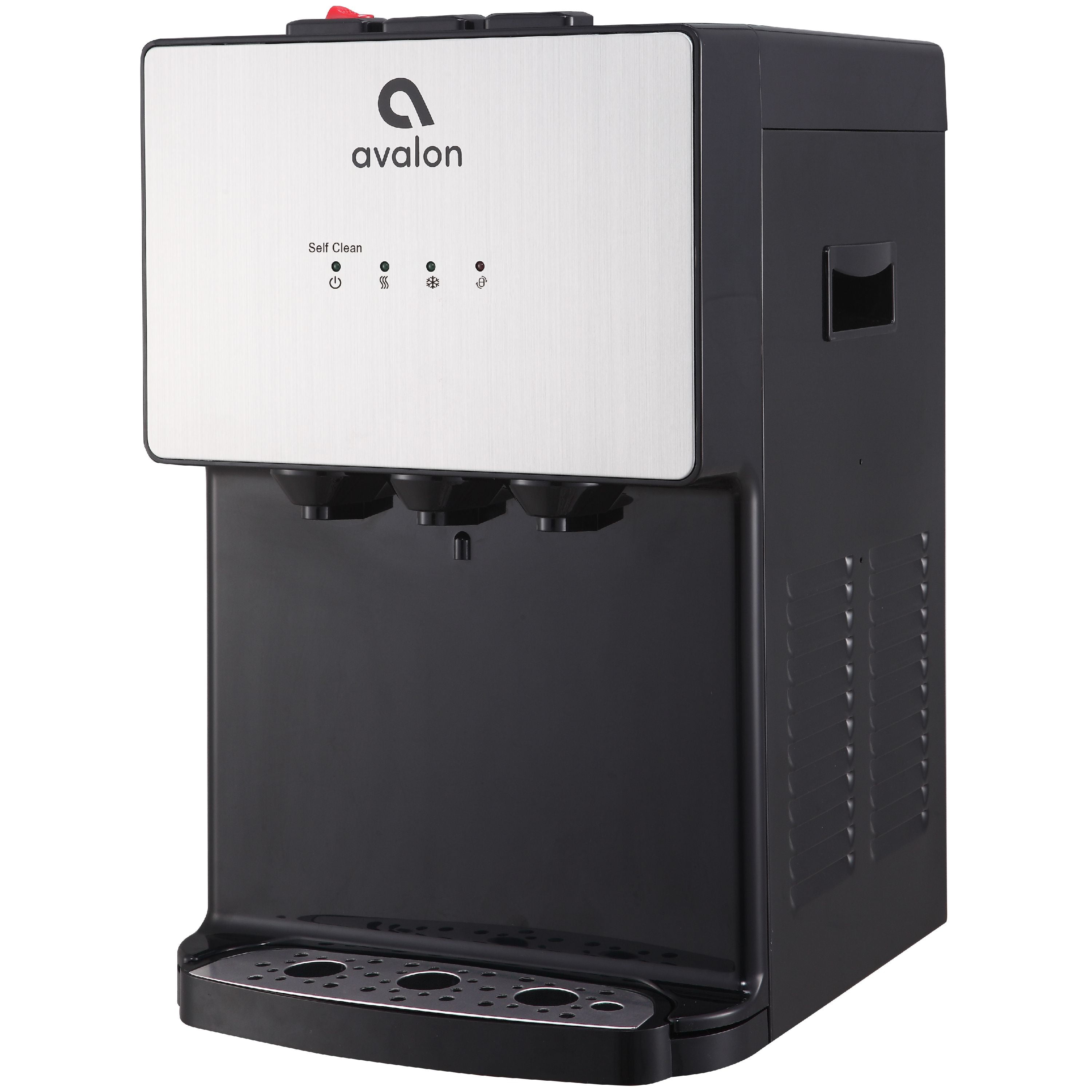 THREE TEMPERATURES: Three temperature settings allow you to customize your drinking experience. This dispenser features a crisp cold, room temperature, or piping hot output. DUAL FILTRATION: Patented Dual filters are included with the water cooler. This consists of a Sediment filter (listed as model Avalon A5FILTER) and a Carbon Block filter (listed as model Avalon A4FILTER) which will last 6 months or 1500 gallons. LIGHT THE WAY: Our built-in nightlight makes the water spouts clearly visible at night & has a replace bottle indicator that lights up when the bottle needs to be replaced. CHILD SAFE: This product is UL/Energy Star Approved and features a child safety lock on the hot water spout so the entire family can use it worry free! SELF CLEANING FEATURE: The self cleaning ozone feature sanitizes & purifies the dispenser, which prevents the accumulation of harmful germs & bacteria for your safety. BOTTLELESS: Our water cooler is bottleless and will reduce the cost of constant purchases of water. The water is filtered with our dual filtration system consisting of a sediment filter and a carbon block filter.