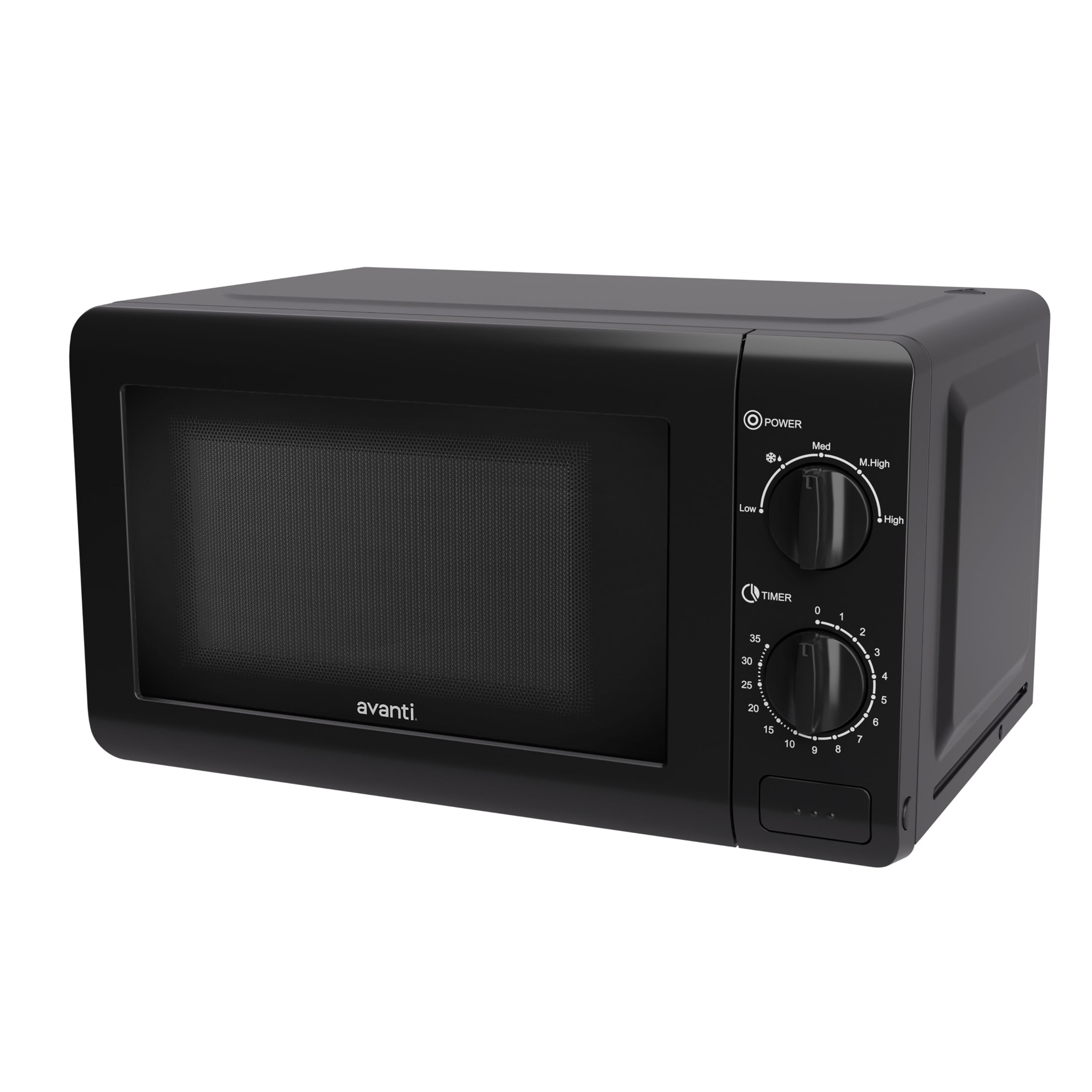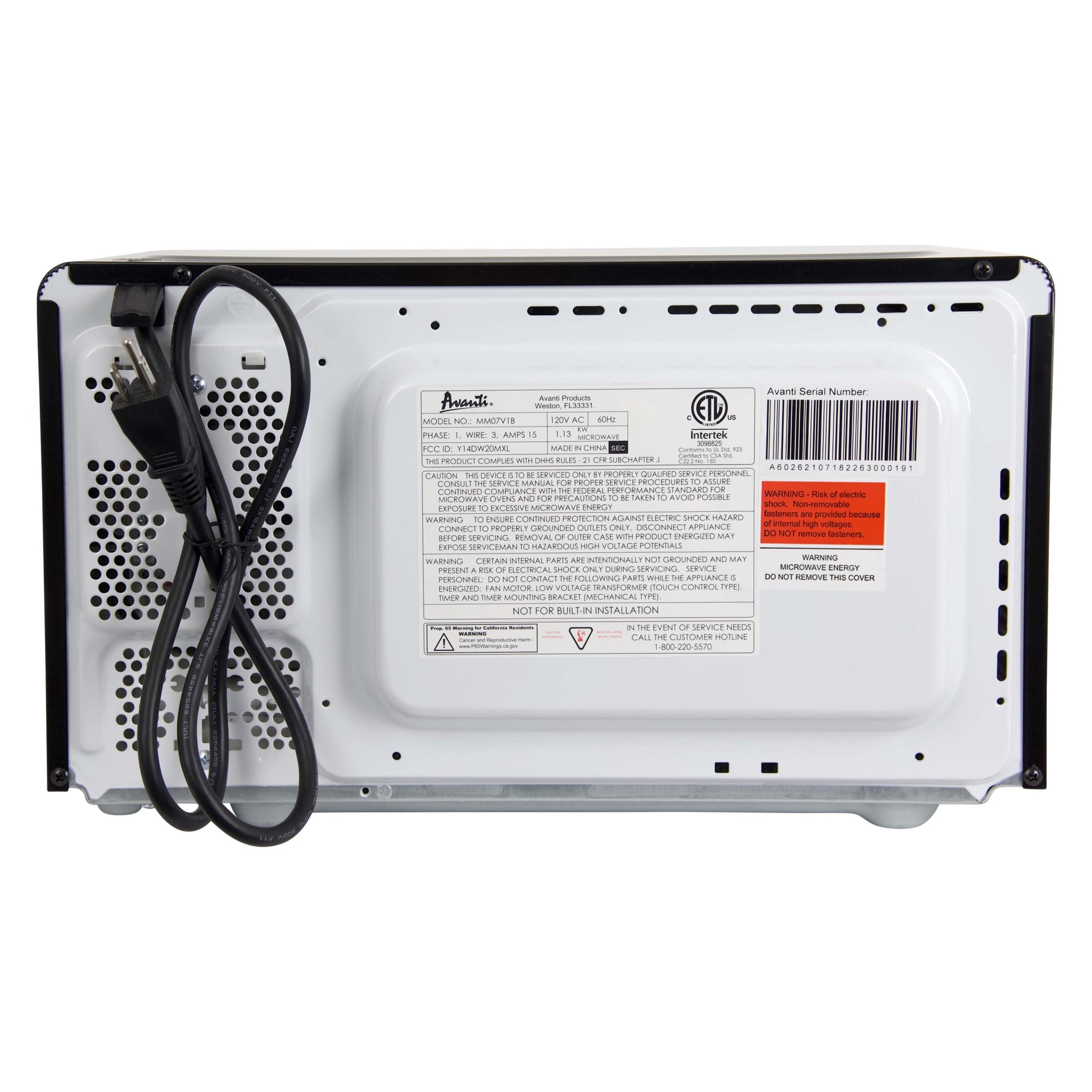 0.7 cu ft capacity 700 watts of power for cooking and reheating Five power settings (low, med low, medium, med high, high) Defrost setting 30-minute cooking timer Removable glass turntable Push button door release Black microwave complements any decor Covered by the Avanti One-Year Limited Warranty
