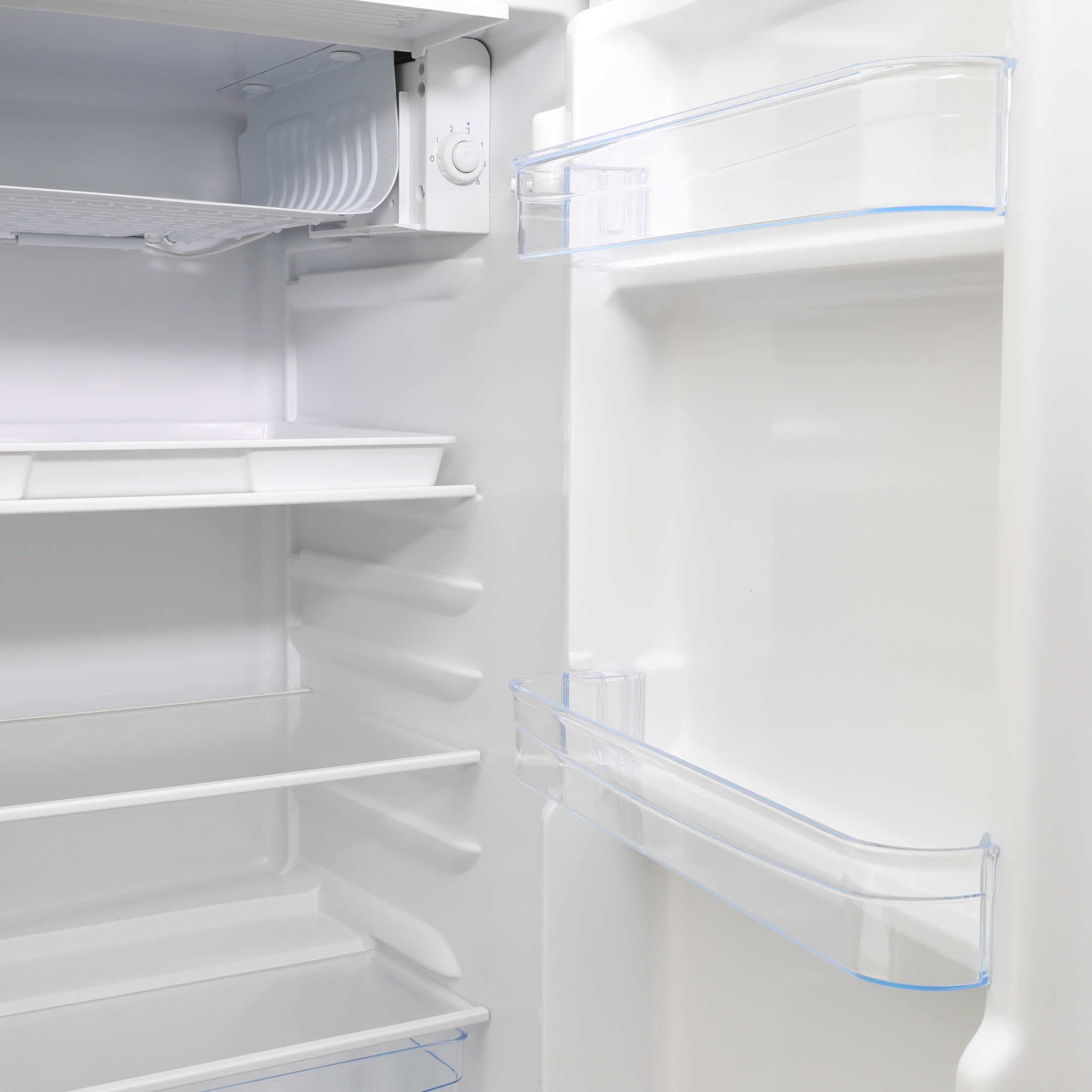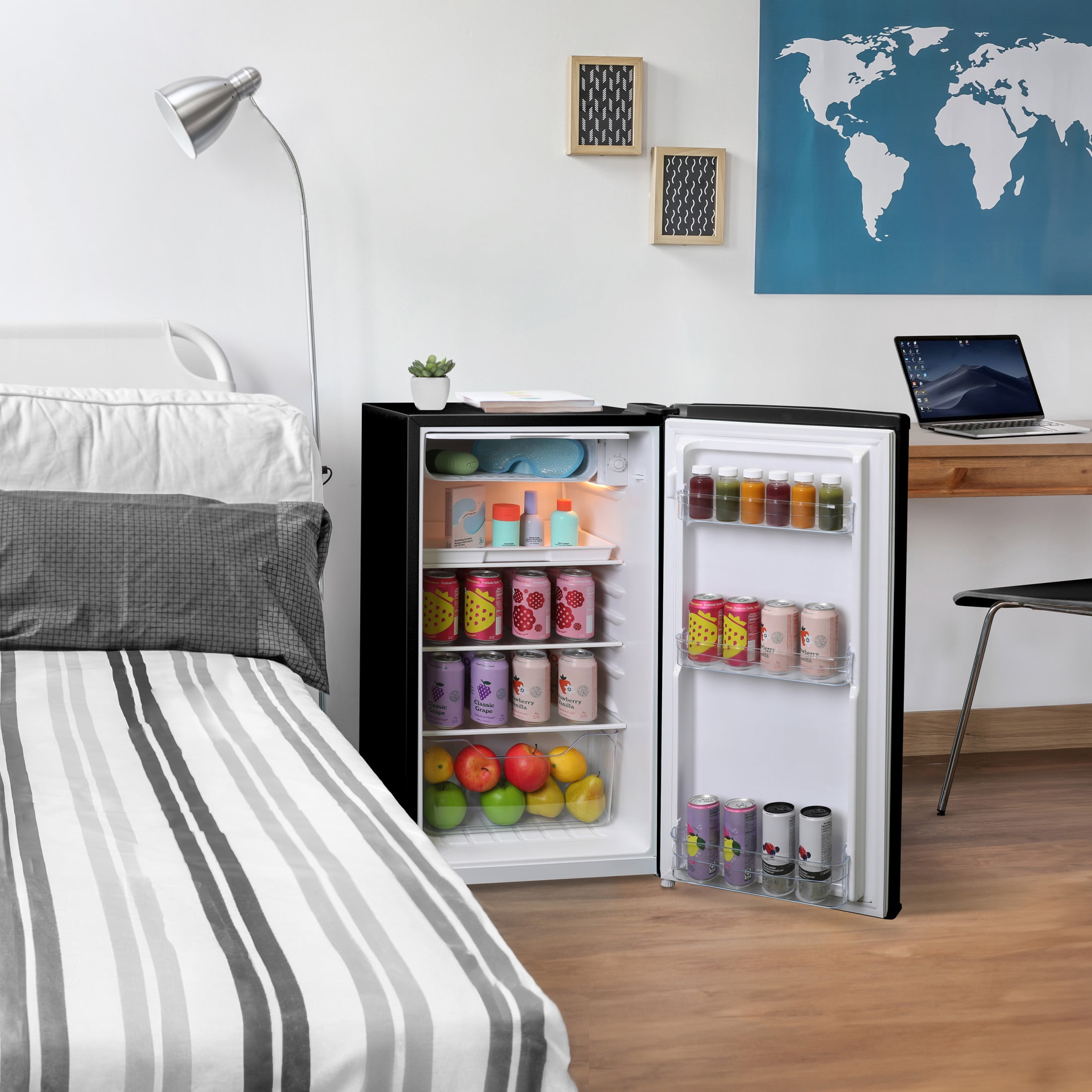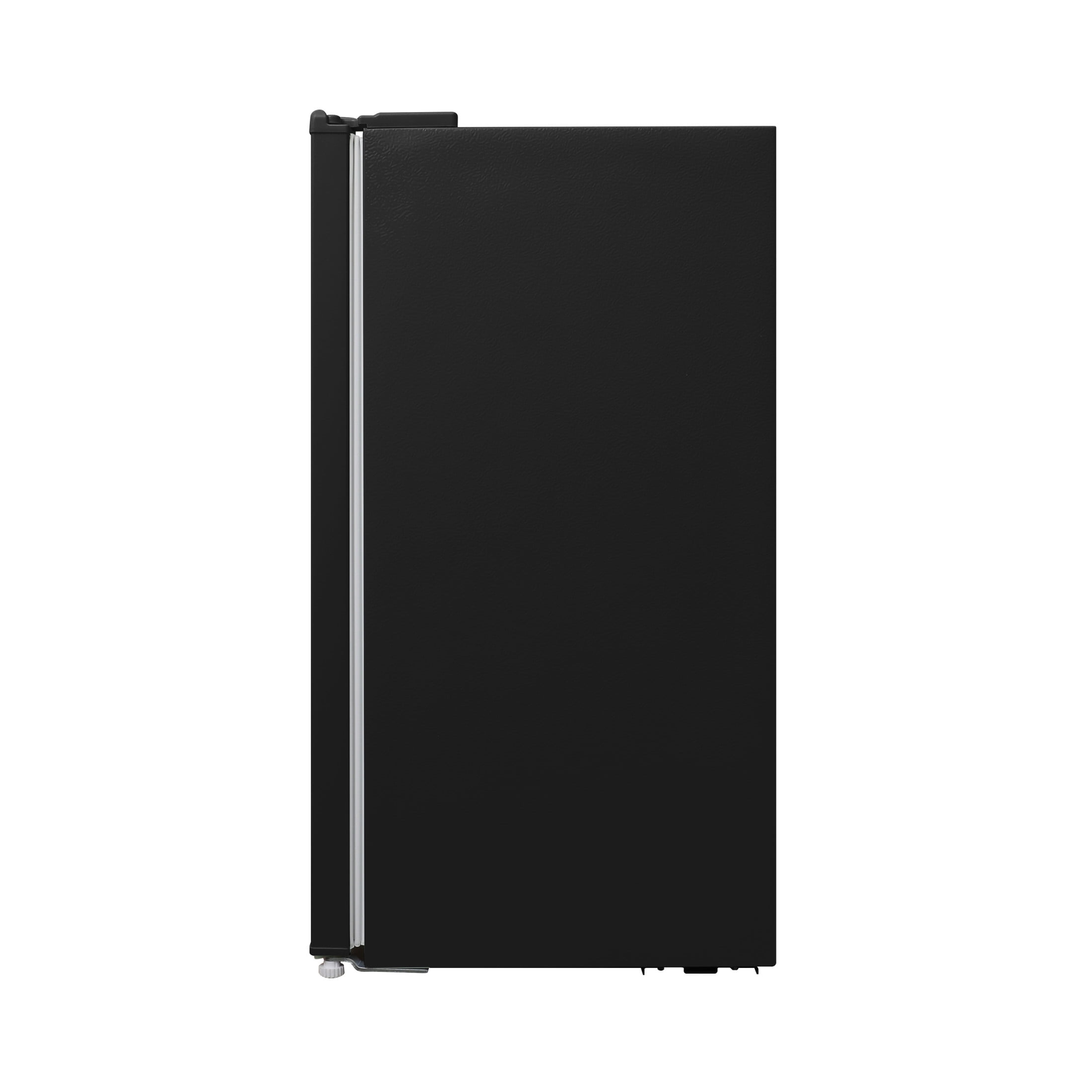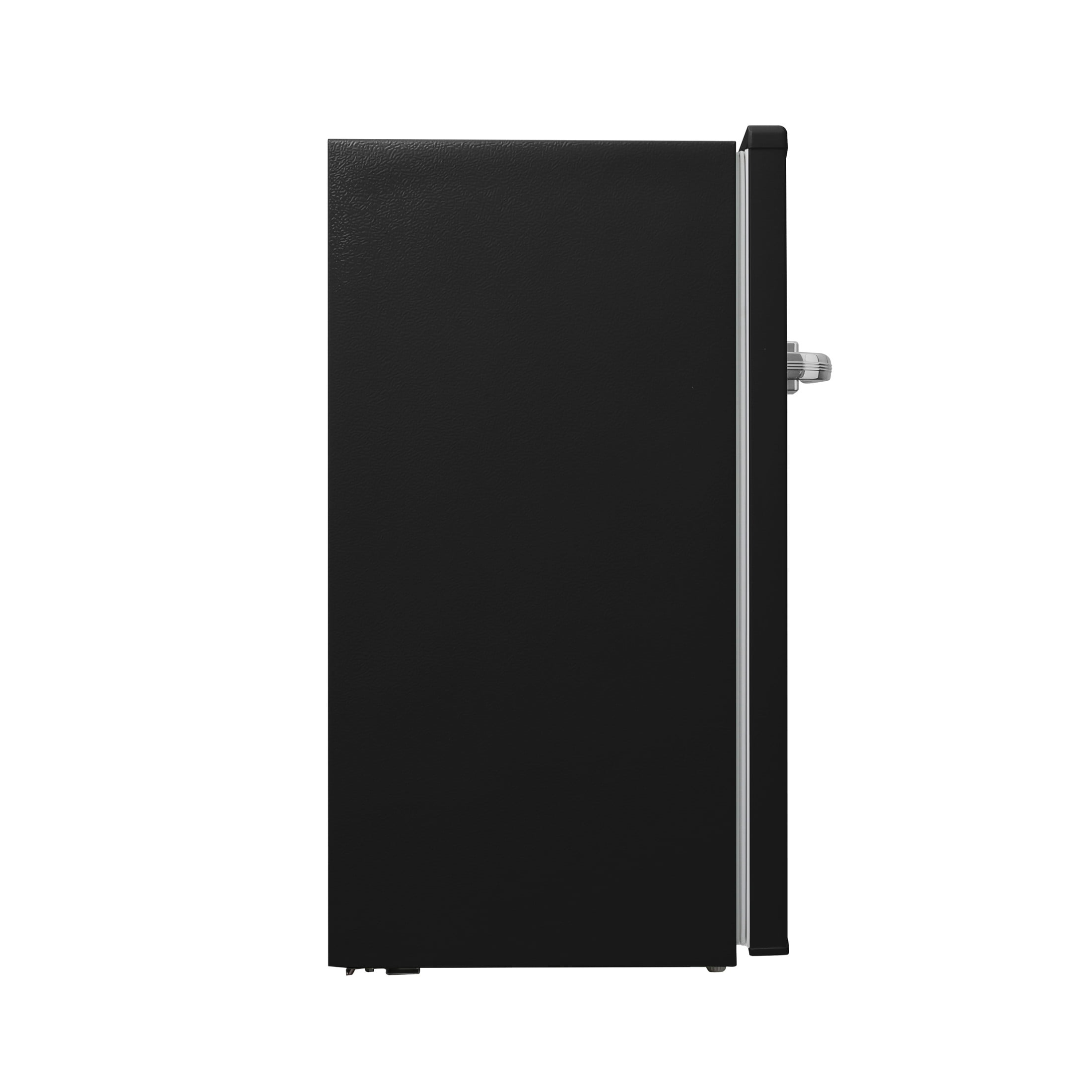 Retro-style miniature refrigerator is ideal for small, compact spaces such as bedrooms, offices, dorm rooms, and more Includes 3 adjustable shelves, a clear pull-out storage bin, 3 high-rimmed door trays, and an ice box with a vertically swinging door Adjustable temperature knob allows you to easily regulate the temperature and energy use based on the contents Compact design features 3.10 cubic feet of space for small foods, sodas, beer, and other beverages Manual defrost allows your food and beverages to stay fresh and cold without icing over or uneven temperature control Material: Mixed Color: Black Dimensions (L x W x H): 19.75 x 17.75 x 33.75 inches Weight: 43 pounds Manufacturer’s warranty: 1-year warranty