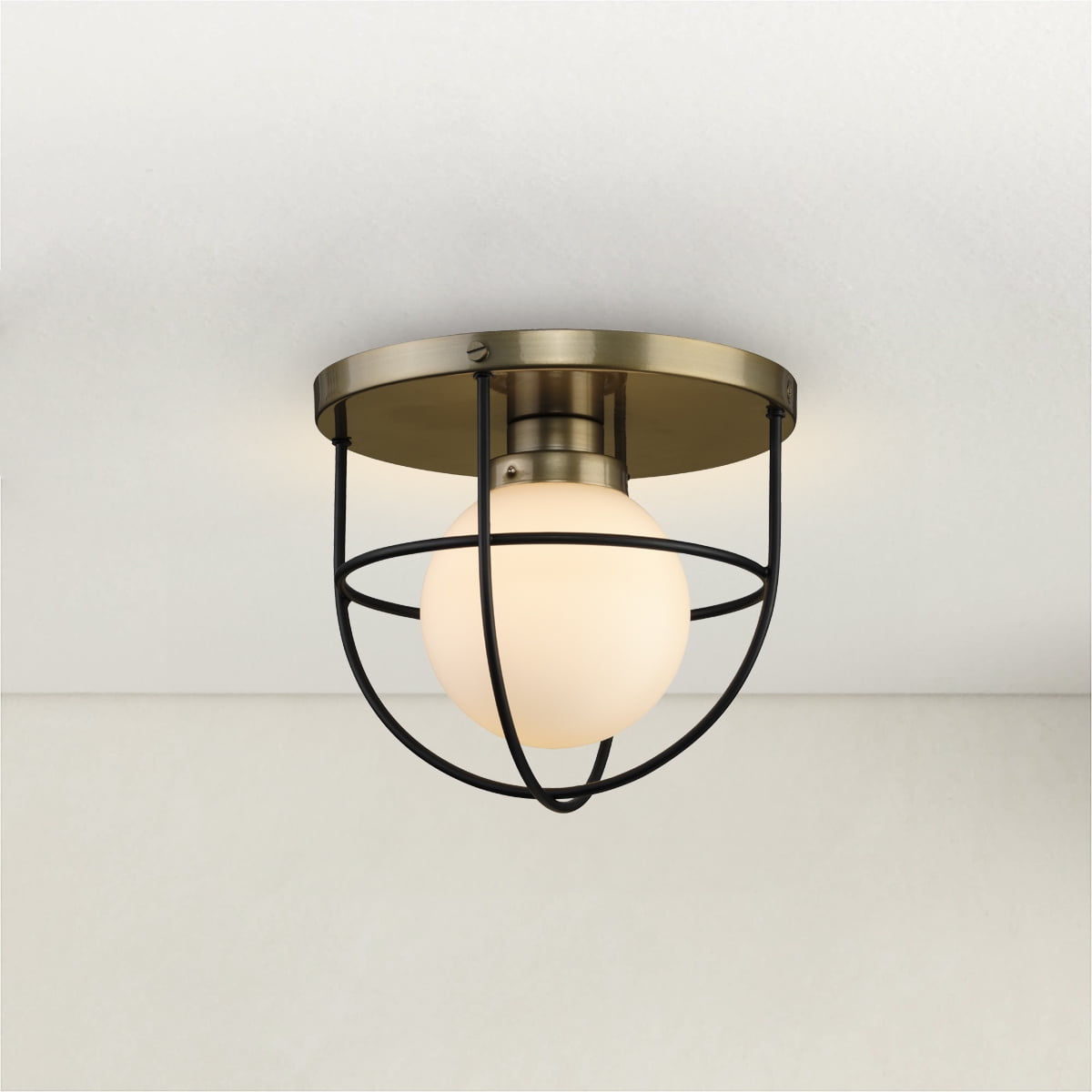 The light’s cage-style frame is ideal for Coastal, Farmhouse and Luxe Industrial settings Perfect for breakfast nooks, kitchens, living rooms, halls & foyers The flush mount’s industrial frame is coated in a gorgeous champagne bronze finish The light’s unique metal shade provides a simple, soft glow Measures 10.125-in Dia x 8.625-in H Uses (1) 60-Watt maximum A19 bulb, or LED equivalent, that is sold separately cETLus Damp Location listed, fixture can be used in rooms such as bathrooms, powder rooms or covered outdoor rooms where water may be present 1-Year Limited Warranty guarantees your complete satisfaction with your purchase and includes professional after-sales customer service support Includes installation instructions and mounting hardware
