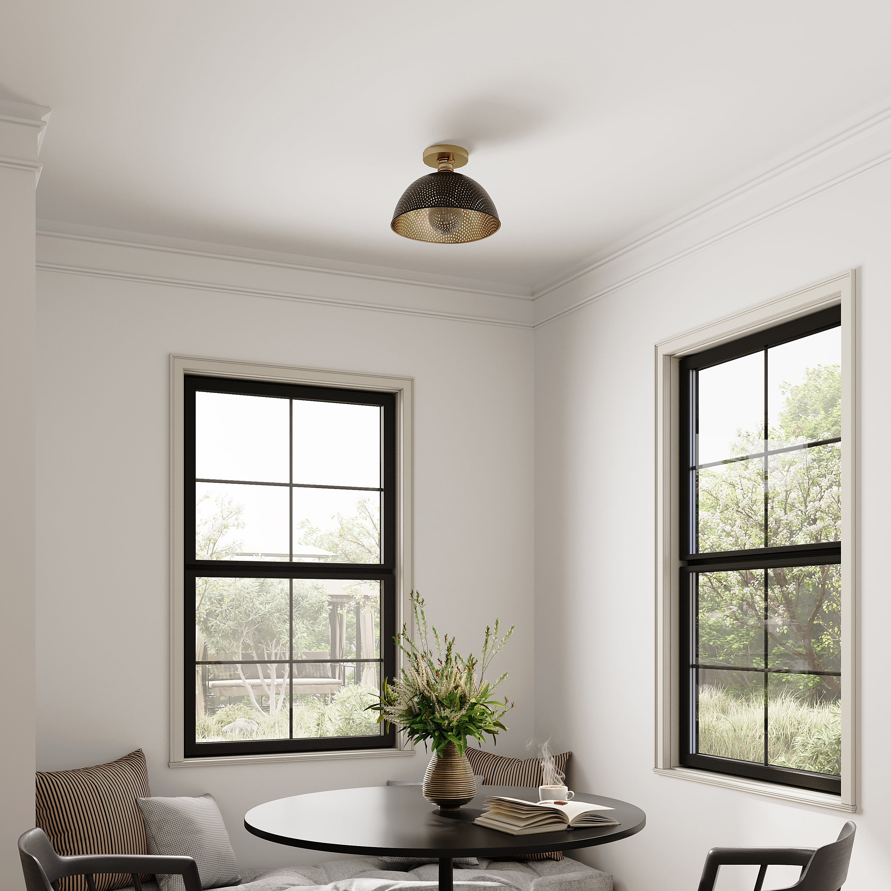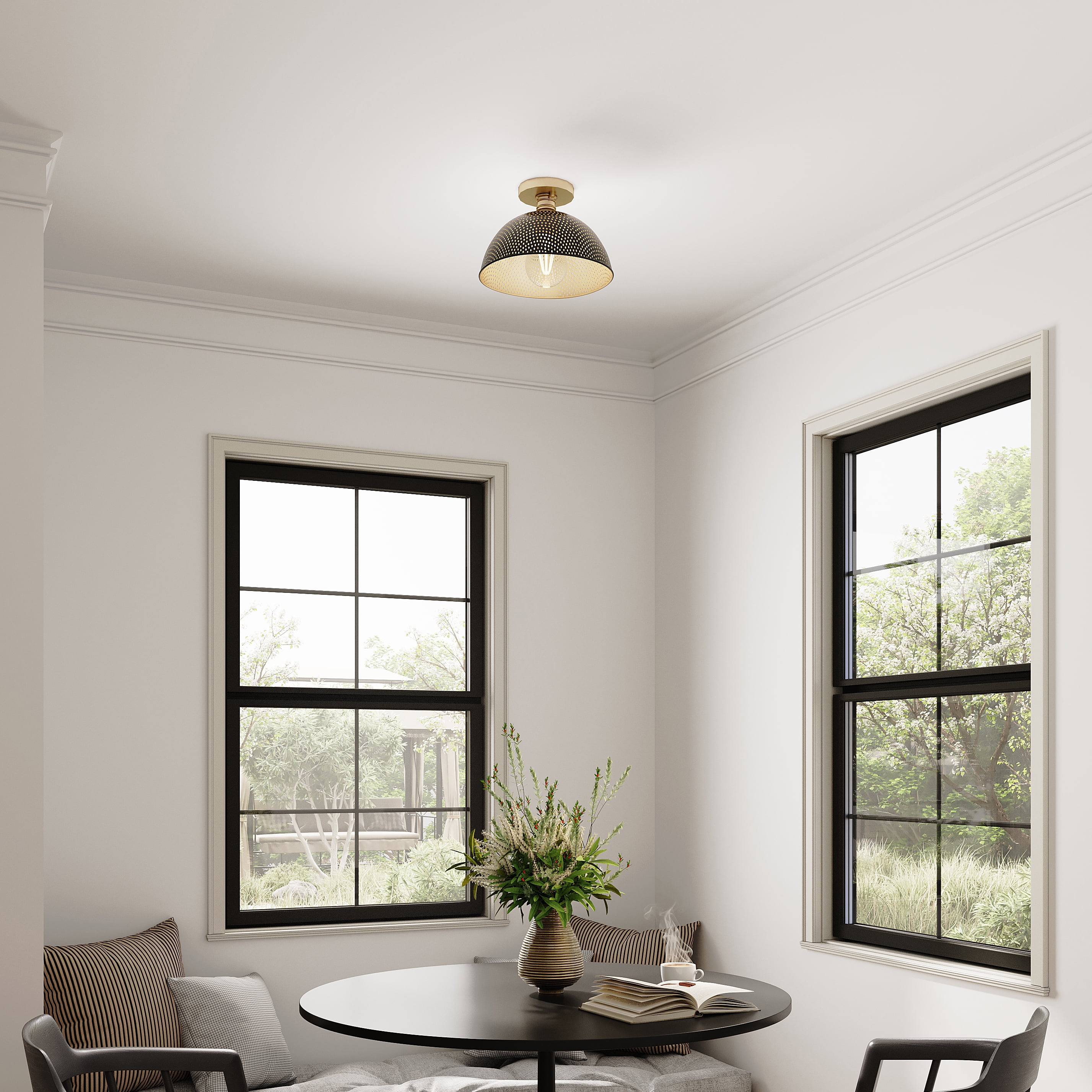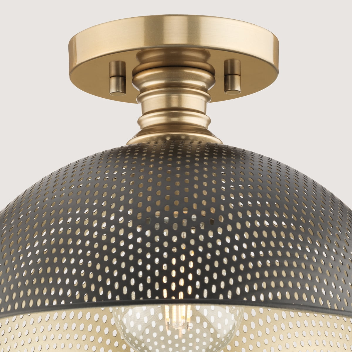 The light’s vintage style is ideal for Farmhouse, Luxe Industrial and Coastal settings Perfect for breakfast nooks, kitchens, living rooms, halls & foyers The flush mount’s luxe frame is coated in a gorgeous champagne bronze finish The light’s unique metal shade provides a warm, soft glow Measures 12.375-in x 12.375-in 8-in H Uses (1) 60-Watt maximum A19 bulb, or LED equivalent, that is sold separately cETLus Damp Location listed, fixture can be used in rooms such as bathrooms, powder rooms or covered outdoor rooms where water may be present 1-Year Limited Warranty guarantees your complete satisfaction with your purchase and includes professional after-sales customer service support Includes installation instructions and mounting hardware