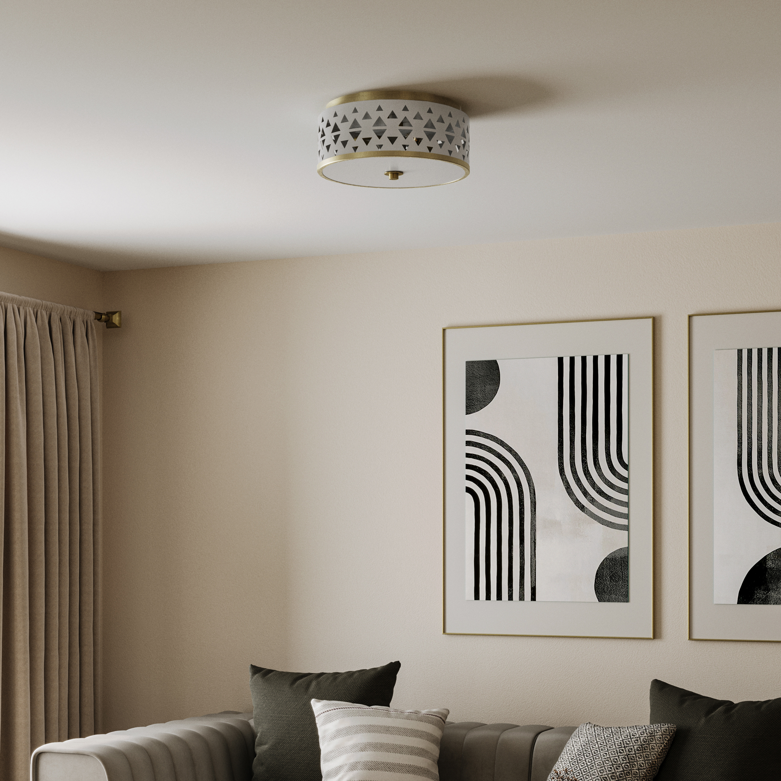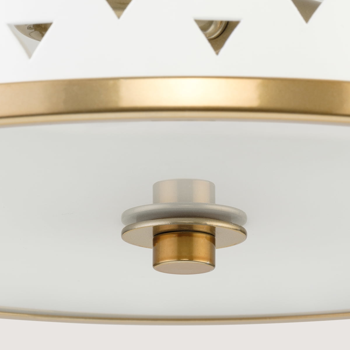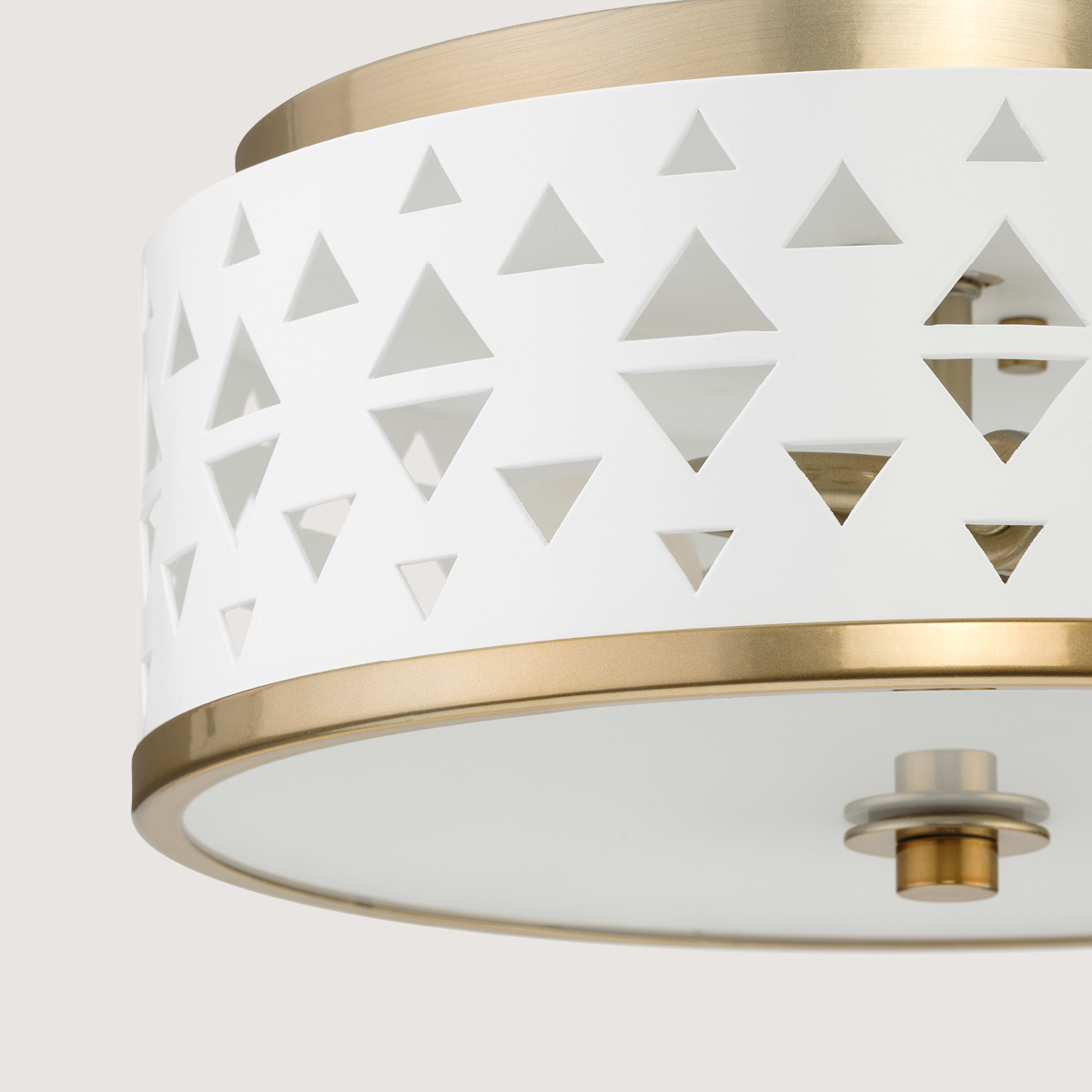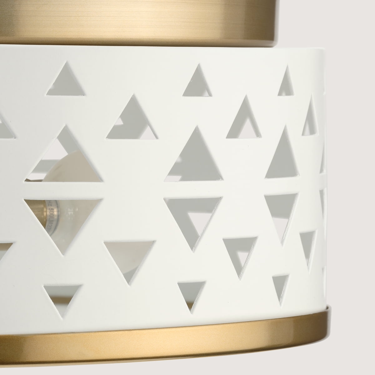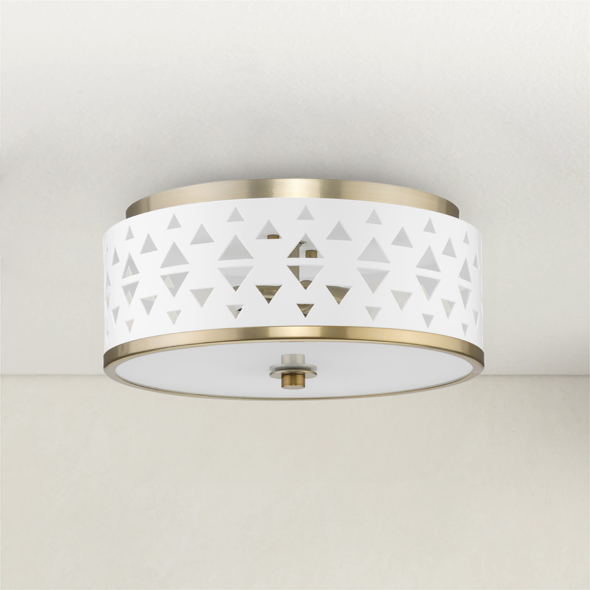 Add a dash of whimsy to your space with the Progress Lighting Avec Collection 1-Light Flush Mount Light. A delicate White metal shade featuring multiple triangular perforations brings a feminine charm and playful elegance to any room. The shade is banded in Champagne Bronze and casts beautiful, patterned light from its pierced shade while the frosted diffuser delivers a soft glow to surfaces below.