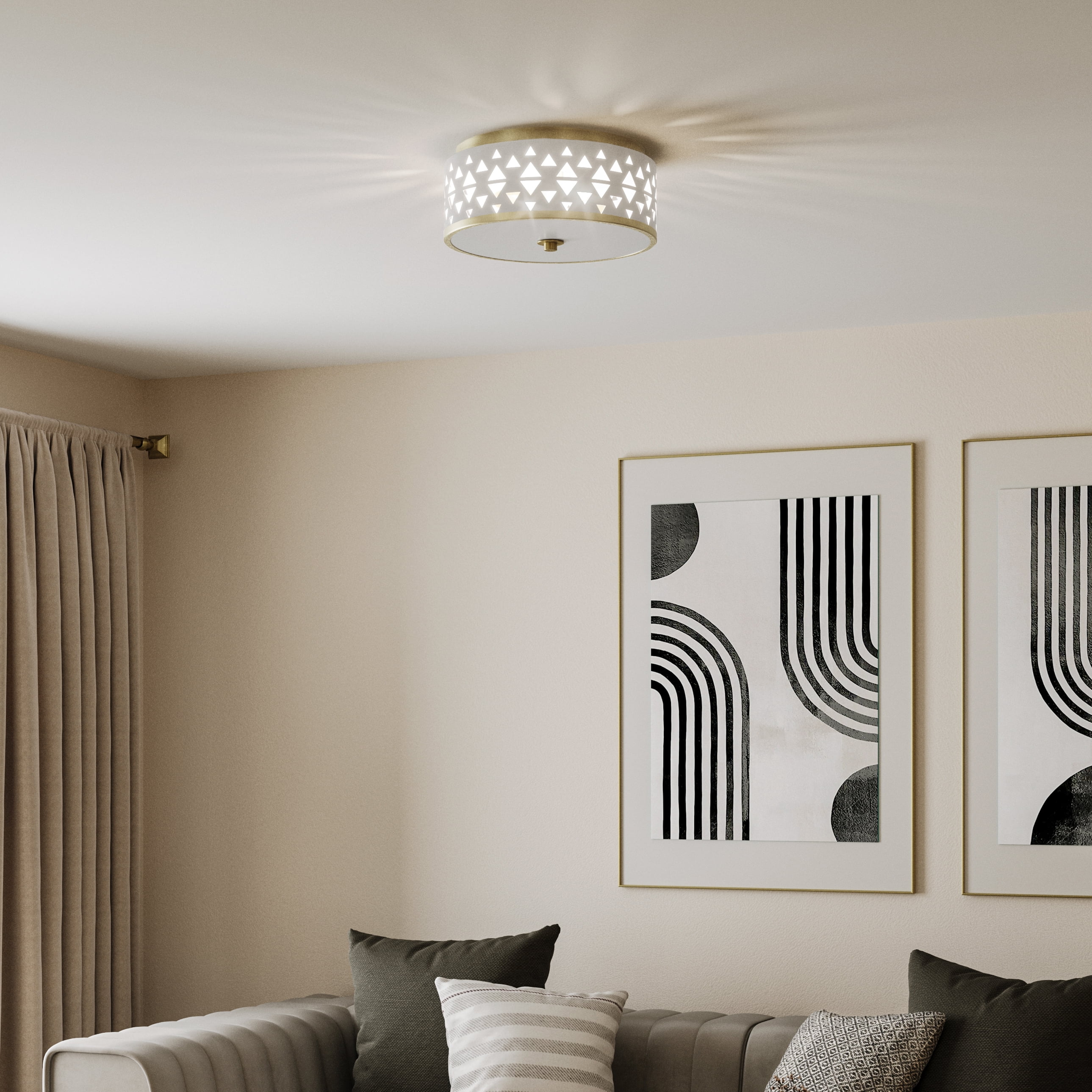 The light’s charming style is ideal for Global and Contemporary settings Perfect for breakfast nooks, kitchens, living rooms, halls & foyers The flush mount’s artful frame is coated in a gorgeous champagne bronze finish The light’s artistic shade casts an alluring patterned glow Measures 12.5-in x 5.625-in H Uses (1) 60-Watt maximum candleabra base bulb, or LED equivalent, that is sold separately cETLus Damp Location listed, fixture can be used in rooms such as bathrooms, powder rooms or covered outdoor rooms where water may be present 1-Year Limited Warranty guarantees your complete satisfaction with your purchase and includes professional after-sales customer service support Includes installation instructions and mounting hardware