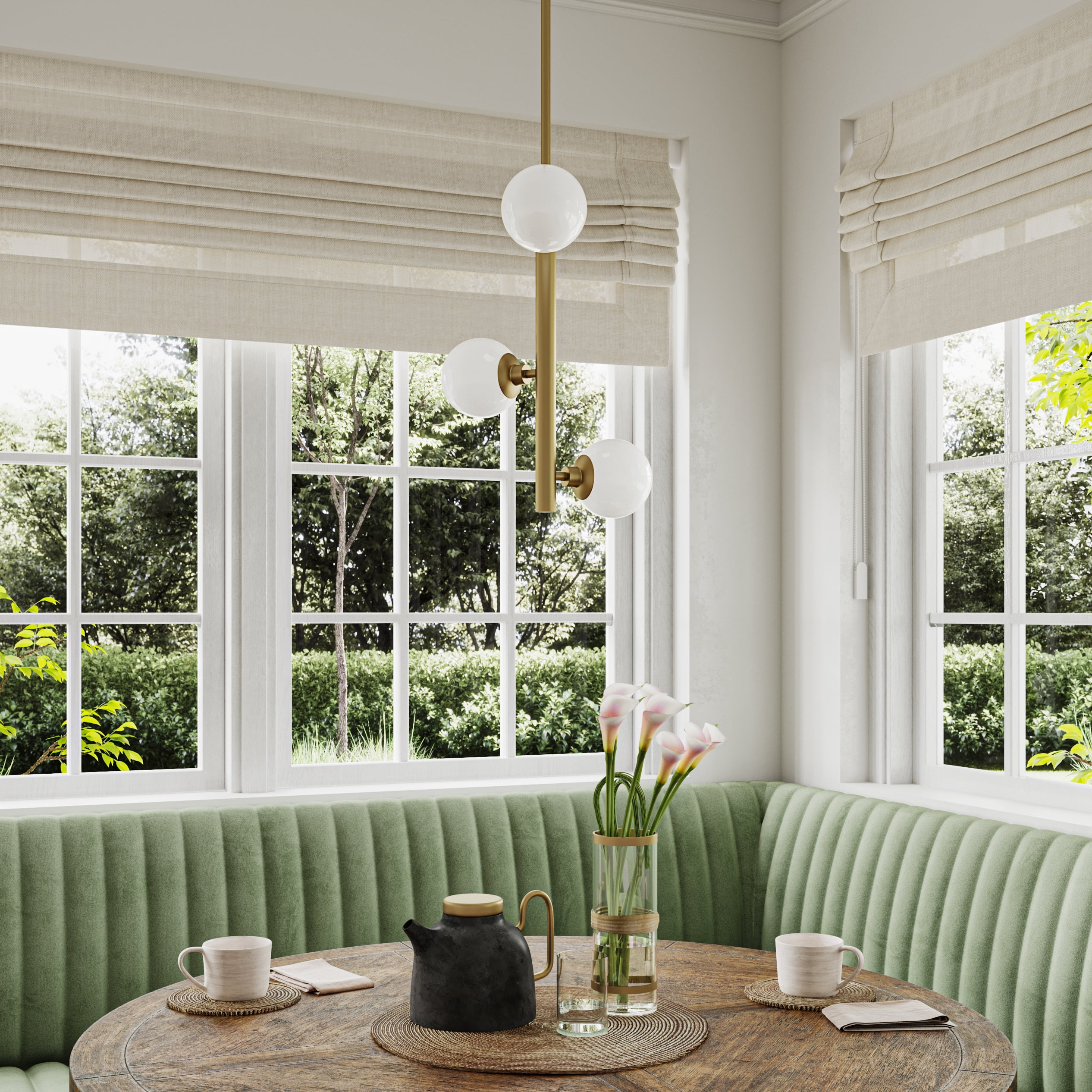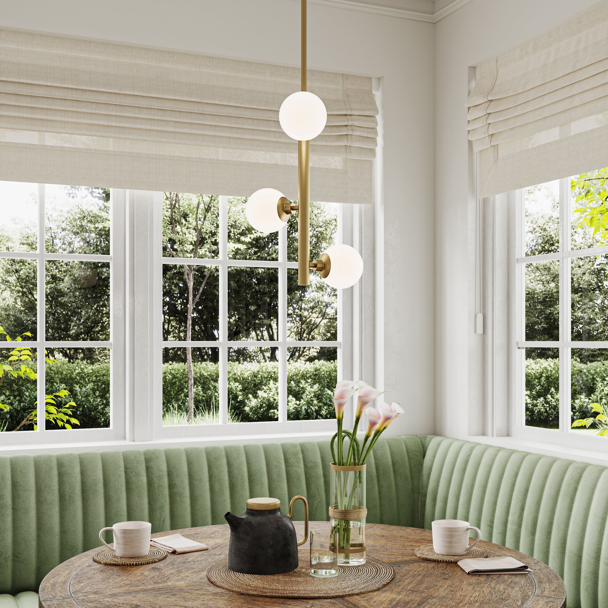 This stunning light is ideal for Mid-Century Modern and Contemporary settings Perfect for breakfast nooks, kitchens, living rooms, dining rooms, halls & foyers The pendant light’s simple frame is coated in a lovely brushed gold The fixture’s angular lines accents the light source glowing from within White glass shades give this fixture a relaxed, clean look Measures 13.375-in Dia x 18.125-in H Uses (3) 60-Watt maximum B10 bulbs, or LED equivalent, that are sold separately cULus Dry Location listed, fixture can be used indoors only 1-Year Limited Warranty guarantees your complete satisfaction with your purchase and includes professional after-sales customer service support