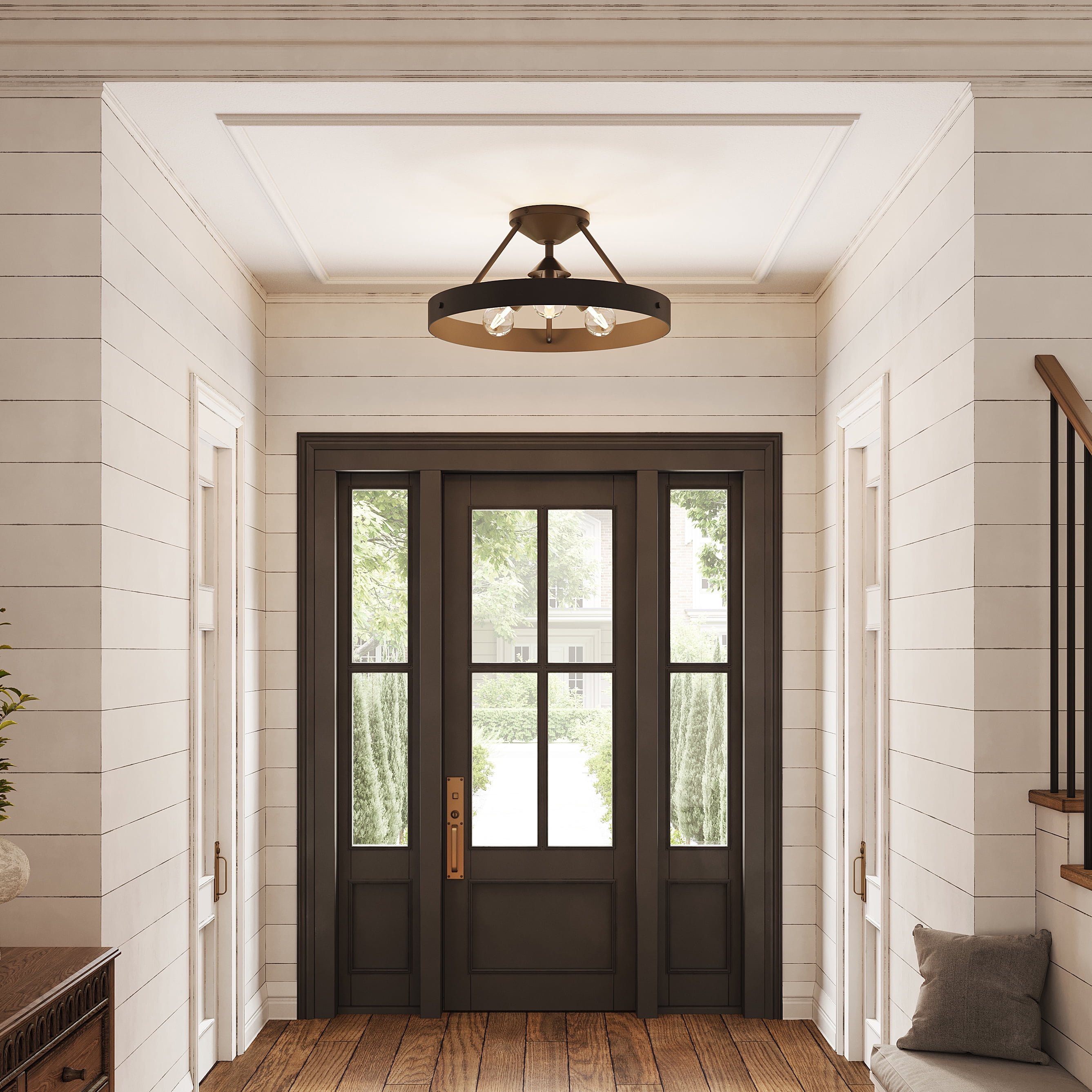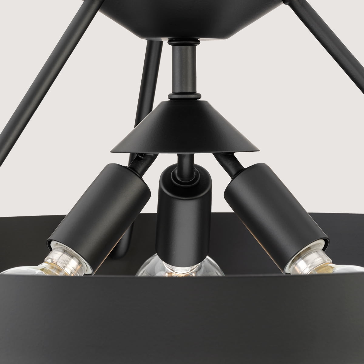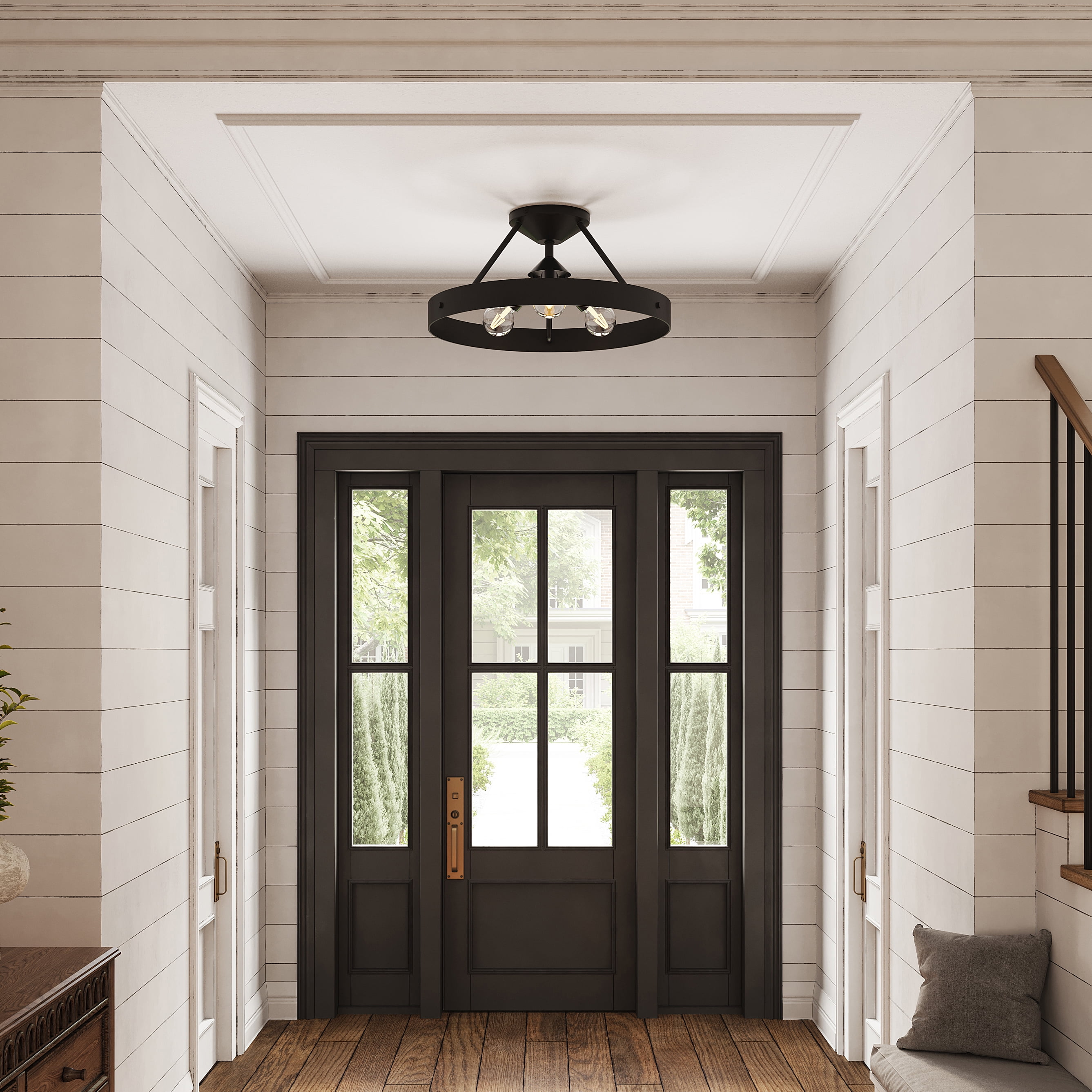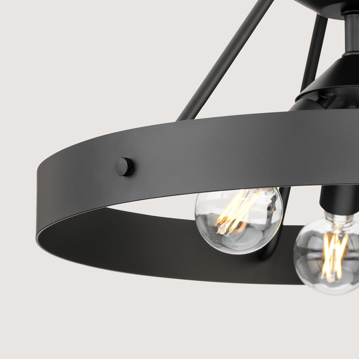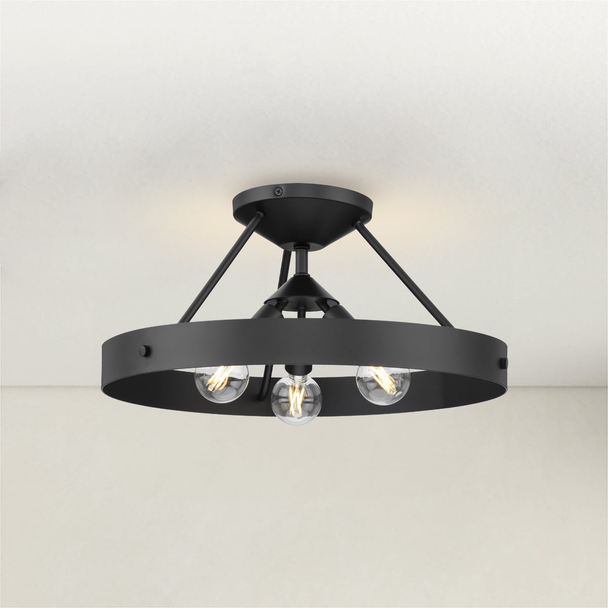 This sleek light is ideal for Contemporary and Mid-Century Modern settings Perfect for breakfast nooks, kitchens, living rooms, halls & foyers The flush mount’s industrial frame is coated in a crisp matte black finish The light’s metal shade provides a warm, elegant glow Measures 15.18-in Dia x 7.125-in H Uses (3) 60-Watt maximum A19 bulbs, or LED equivalent, that are sold separately cETLus Damp Location listed, fixture can be used in rooms such as bathrooms, powder rooms or covered outdoor rooms where water may be present 1-Year Limited Warranty guarantees your complete satisfaction with your purchase and includes professional after-sales customer service support Includes installation instructions and mounting hardware