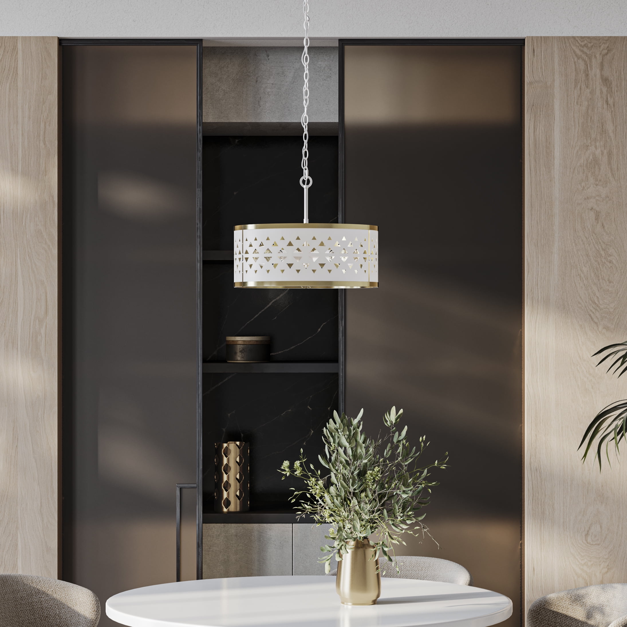 The light’s charming style is ideal for Global and Contemporary settings Perfect for breakfast nooks, kitchens, living rooms, sitting rooms, halls & foyers The pendant’s charming frame is coated in a gorgeous champagne bronze Adjust the fixture’s chain to add flexibility to the room The light’s white metal shade casts an alluring patterned glow Measures 18-in Dia x 14-in H Uses (1) 60-Watt maximum A19 bulb, or LED equivalent, that is sold separately cETLus Dry Location listed, fixture can be used indoors only 1-Year Limited Warranty guarantees your complete satisfaction with your purchase and includes professional after-sales customer service support