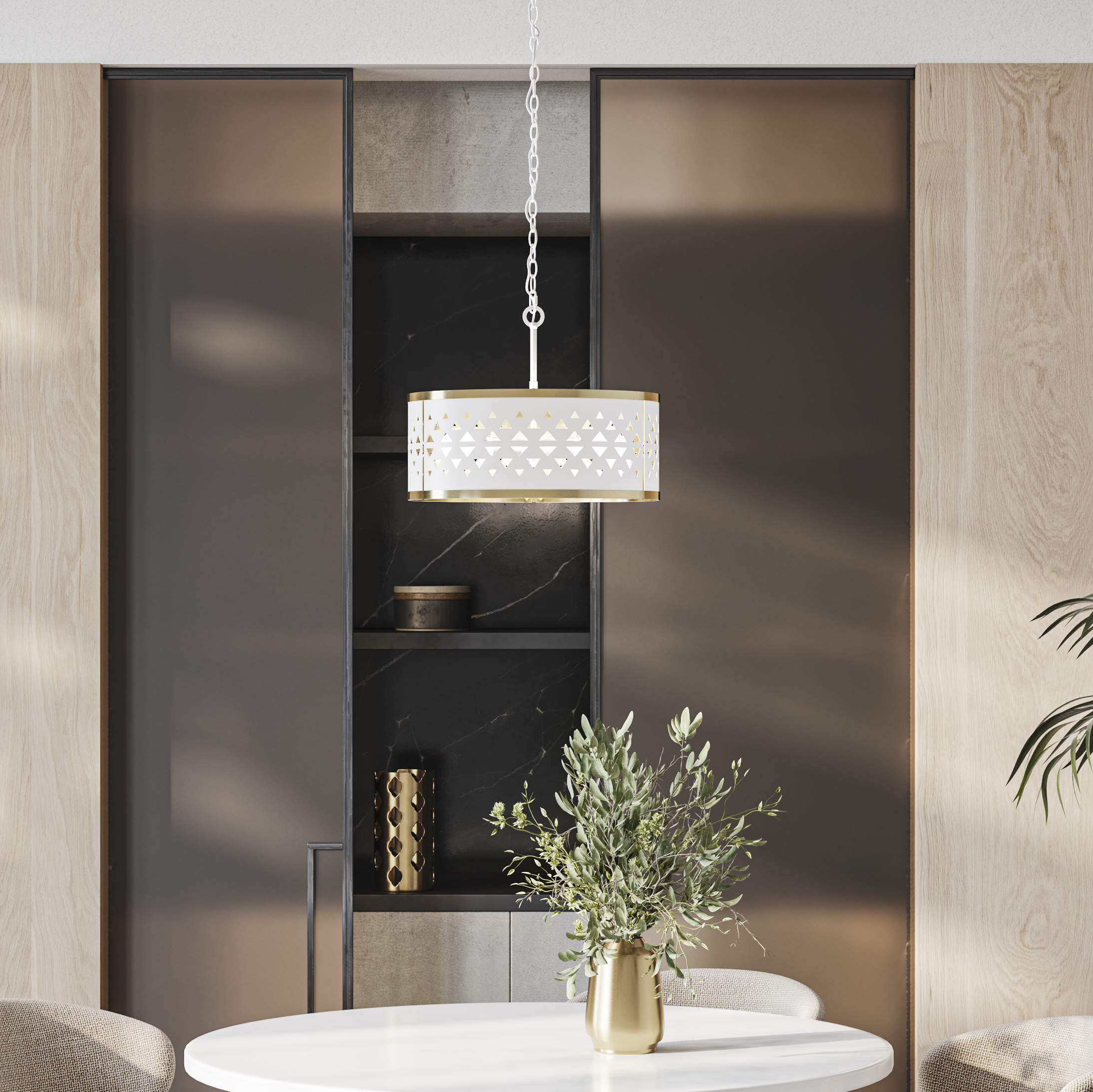 Add a dash of whimsy to your space with the Progress Lighting Avec Collection 1-Light Pendant Light. A delicate White metal shade featuring multiple triangular perforations brings a feminine charm and playful elegance to any room. The shade is banded in Champagne Bronze and casts beautiful, patterned light from its pierced shade while the frosted diffuser delivers a soft glow to surfaces below.
