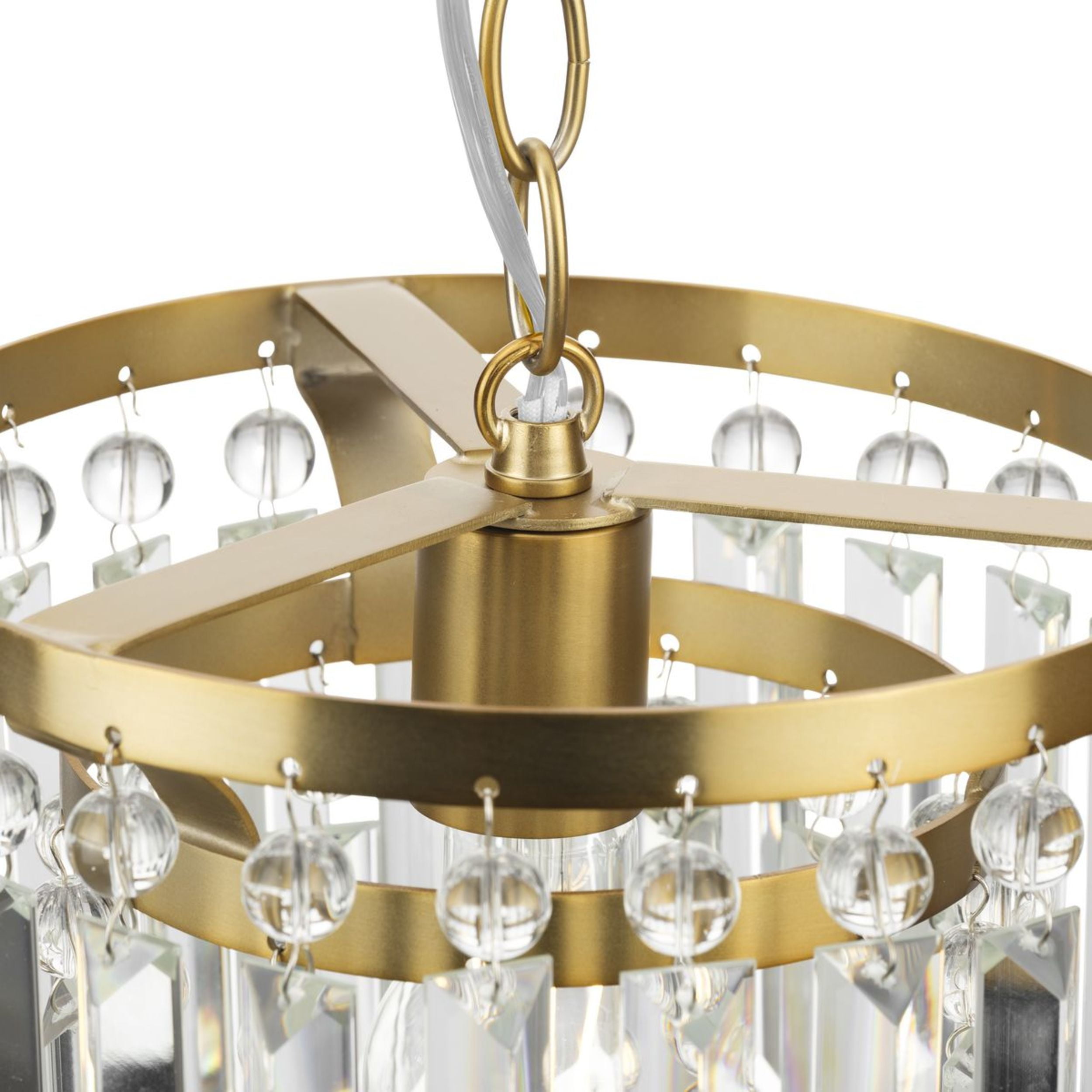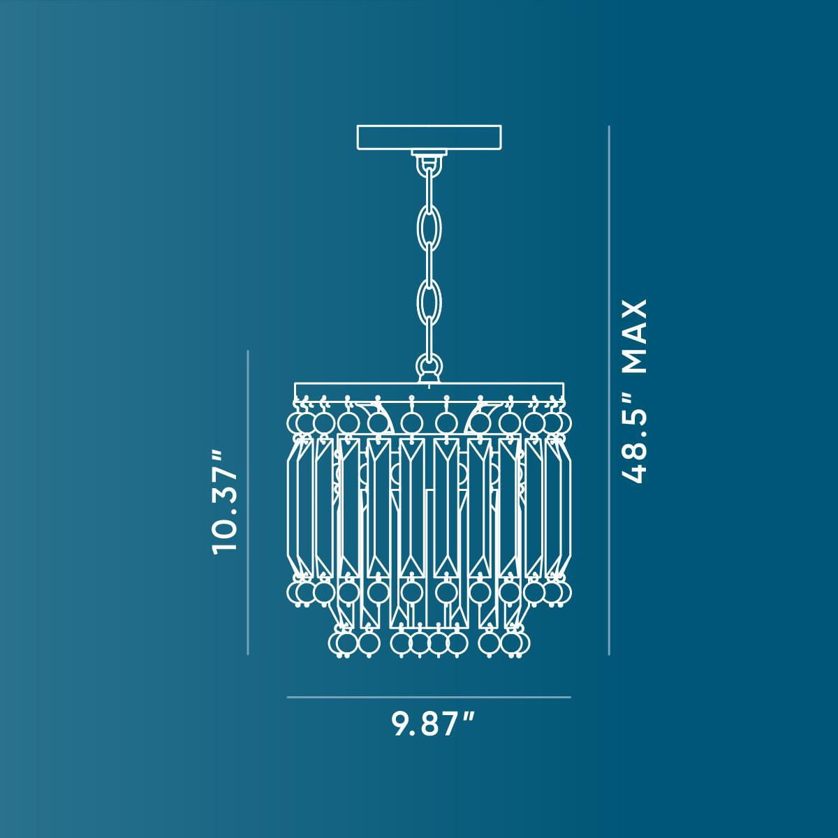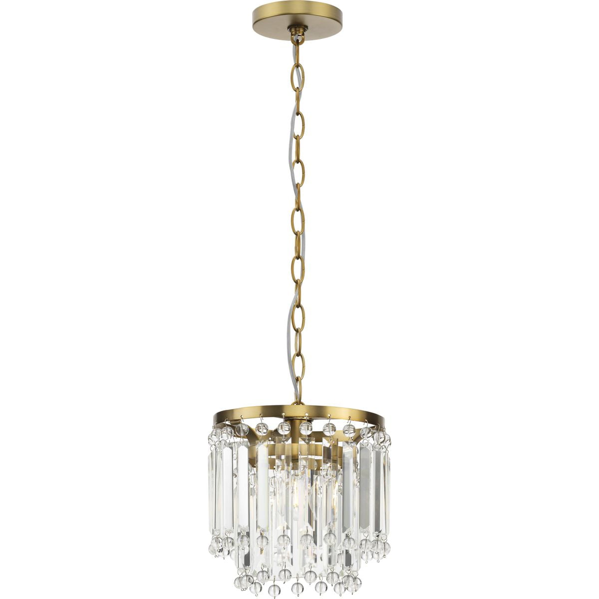 Sparkling glass prisms hang from a round frame finished in a beautiful brushed gold coating Ideal for illuminating kitchen islands, cozy breakfast nooks, and bedrooms. Measures: 9.875 in dia., 10.375 in height Requires one medium base bulb, 60W (not included) This fixture offers dimmable functionality with the use of a compatible dimmer switch (not included) and dimmable bulbs (not included). Our 1-Year Limited Warranty ensures your absolute satisfaction with your purchase and comes with dedicated professional after-sales customer service support.