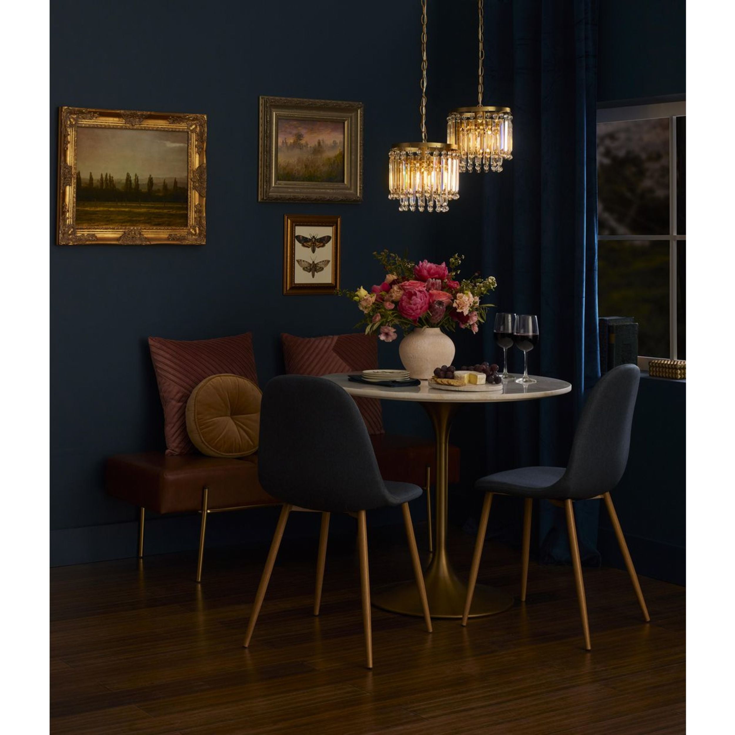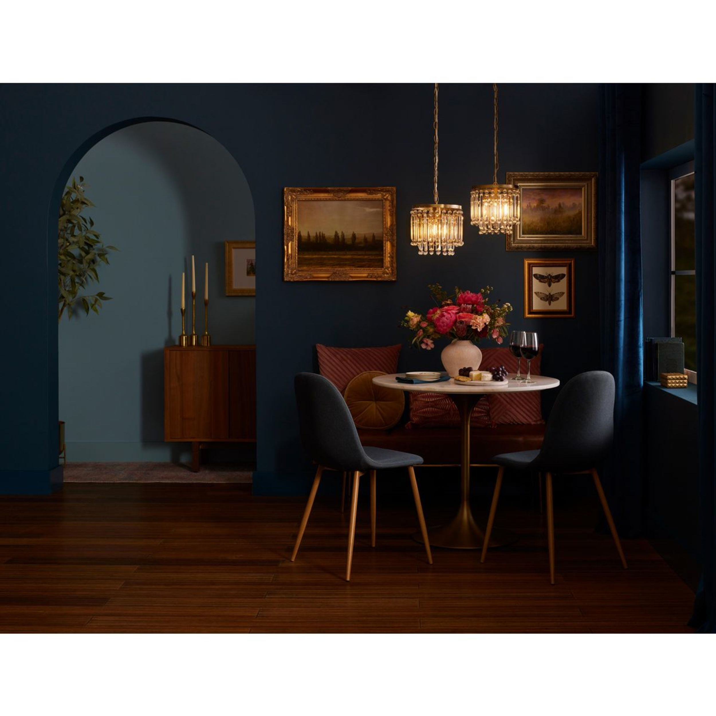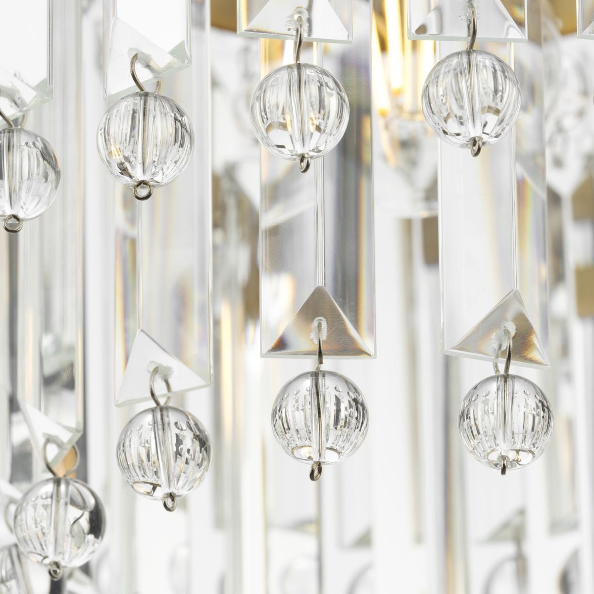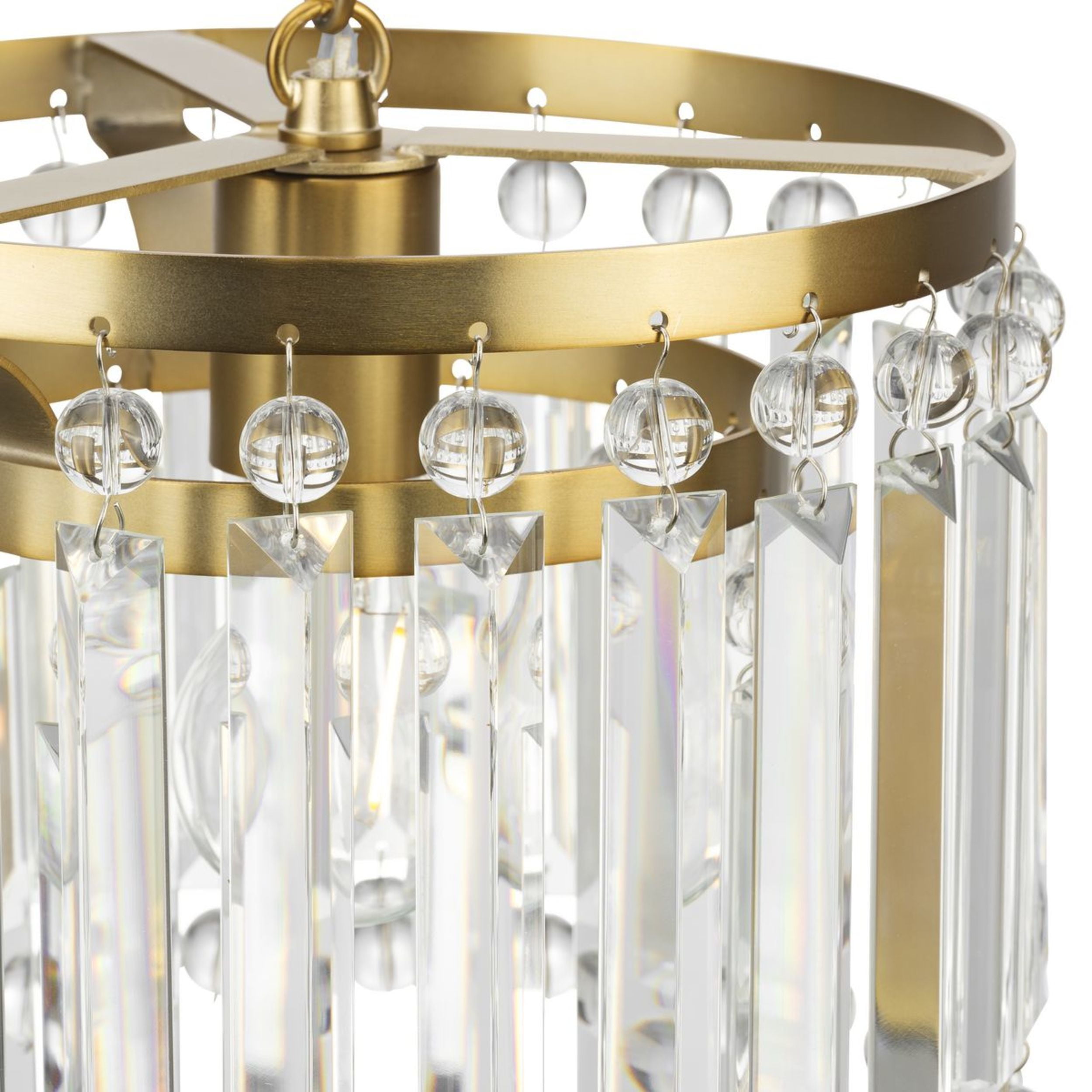 Sparkling glass prisms hang from a round frame finished in a beautiful brushed gold coating Ideal for illuminating kitchen islands, cozy breakfast nooks, and bedrooms. Measures: 9.875 in dia., 10.375 in height Requires one medium base bulb, 60W (not included) This fixture offers dimmable functionality with the use of a compatible dimmer switch (not included) and dimmable bulbs (not included). Our 1-Year Limited Warranty ensures your absolute satisfaction with your purchase and comes with dedicated professional after-sales customer service support.