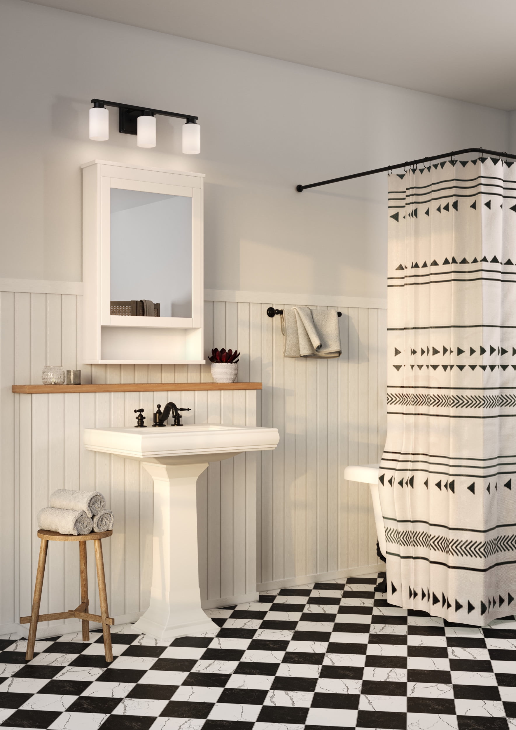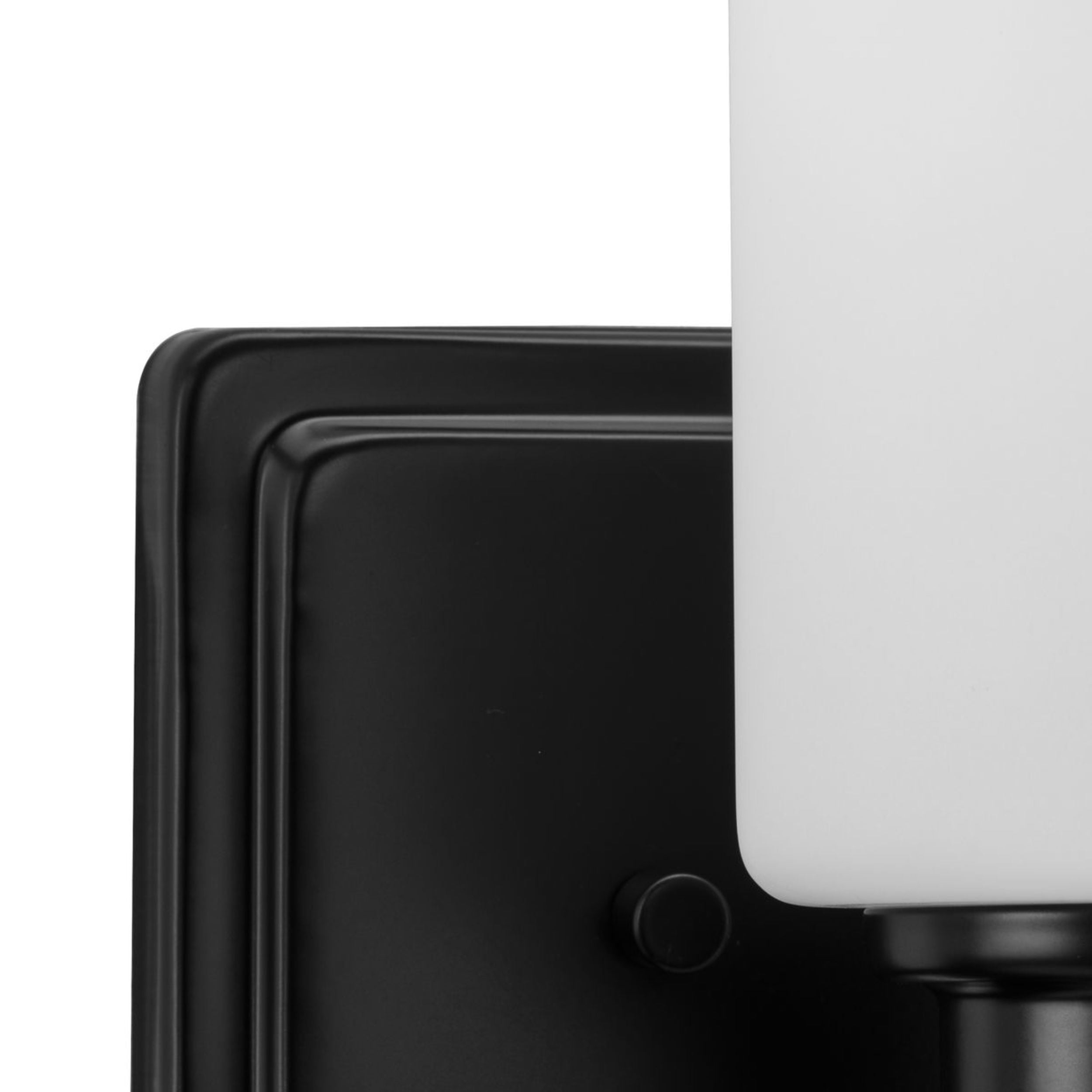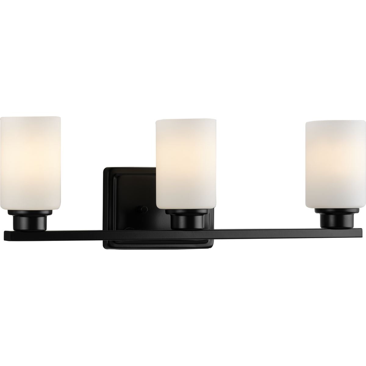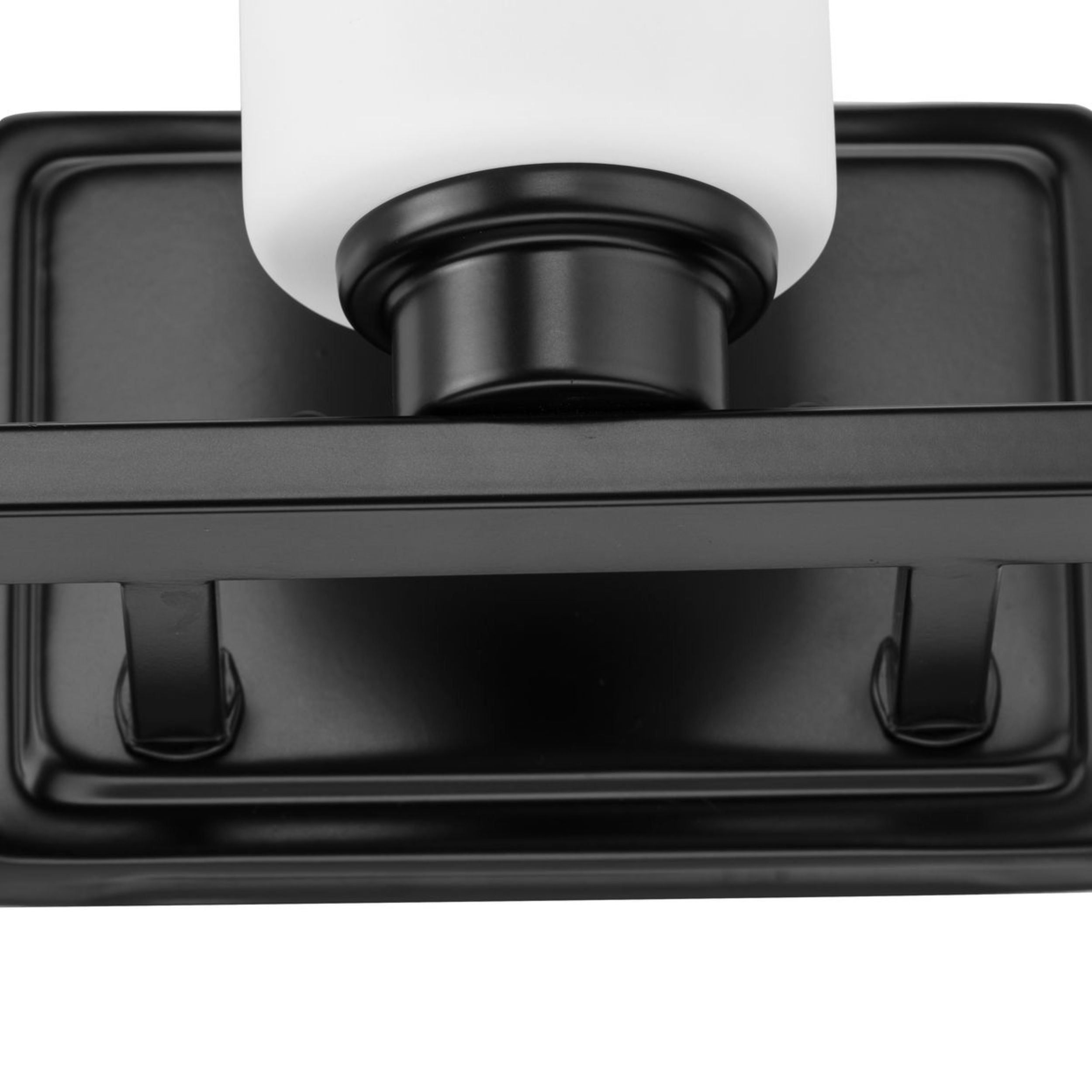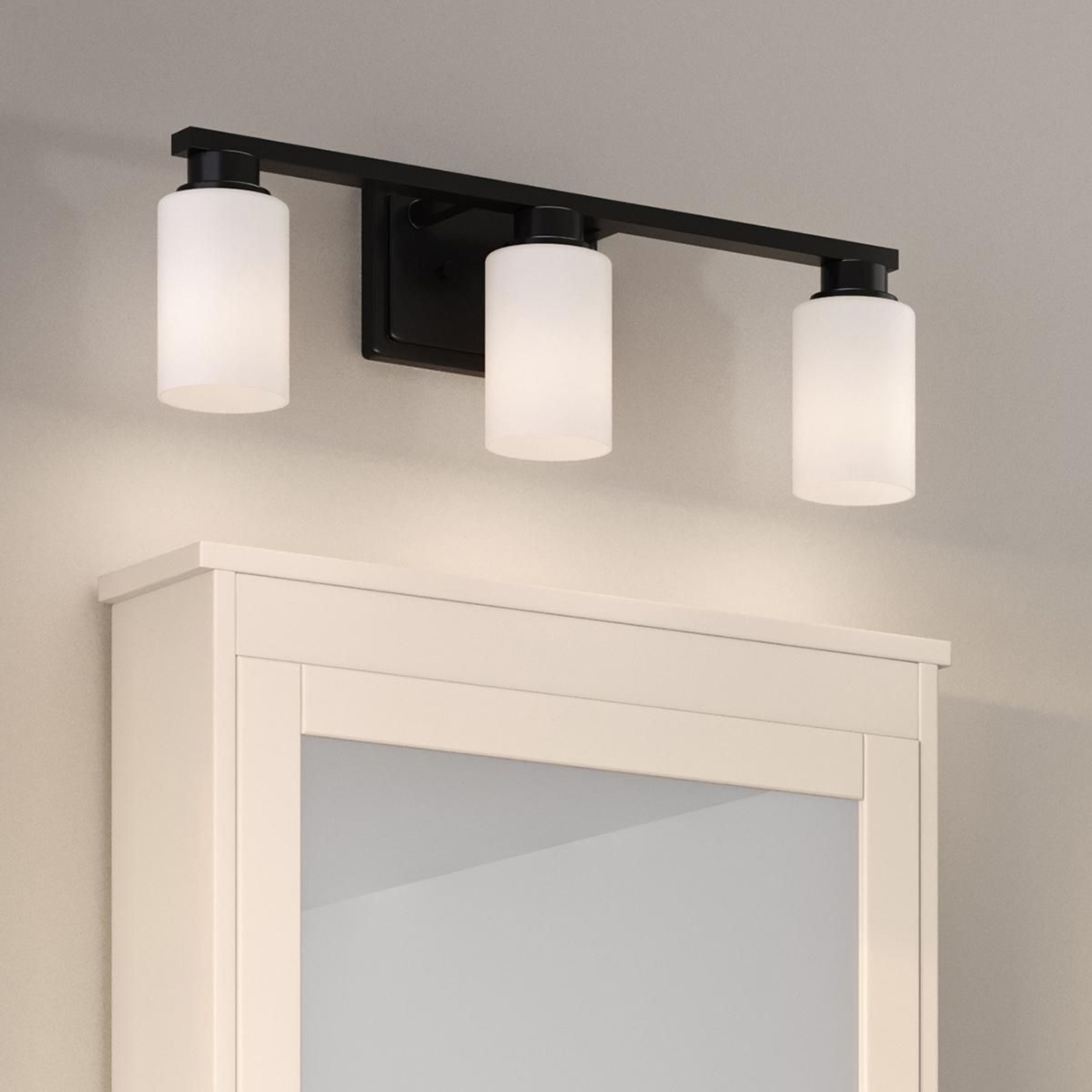 Simple modern bathroom vanity frame in crisp matte black with white glass shades. Ideal for enhancing bathrooms and powder rooms. Measures: 21 in wide, 7 in height and extends 5.25 in Requires three medium base bulbs, 60W (not included) This fixture offers dimmable functionality with the use of a compatible dimmer switch (not included) and dimmable bulbs (not included). cULus Damp Location listed, allowing the fixture’s safe use in spaces like bathrooms or powder rooms, where moisture may be present. Our 1-Year Limited Warranty ensures your absolute satisfaction with your purchase and comes with dedicated professional after-sales customer service support.
