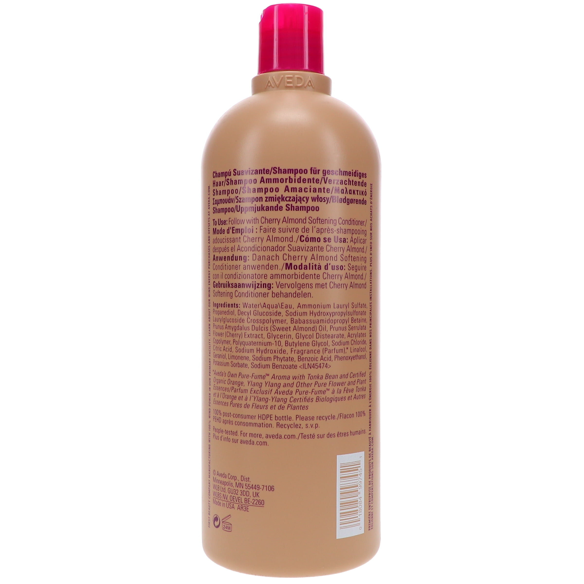 Aveda Cherry Almond Softening Shampoo formulated with Babassu and coconut-derived ingredients deeply and gently cleanse hair while maintaining hair’s healthy lipids and oils. Naturally-derived cherry blossom and sweet almond oil restore softness and provides shine from roots to ends leaving hair feeling touchably soft and full of weightless bounce. Infuses hair, with a sweet, juicy floral pure-fume™ aroma containing 38 flower and plant essences including tonka bean, certified organic orange and ylang ylang.