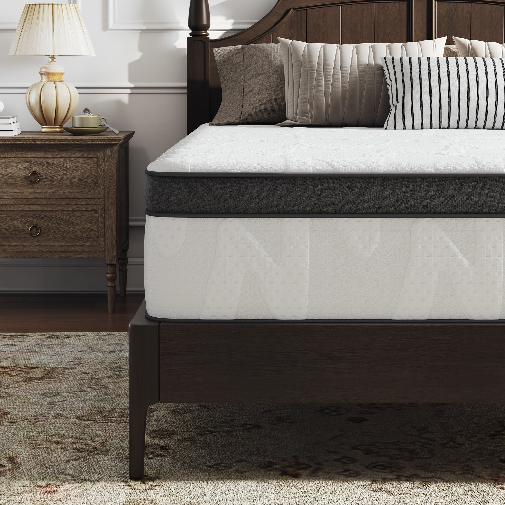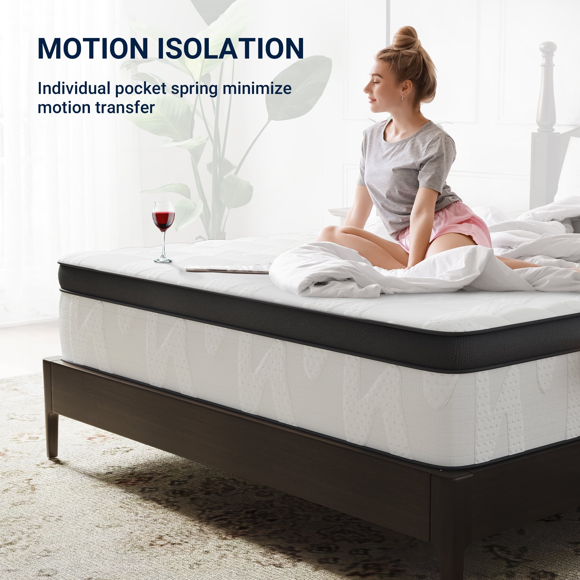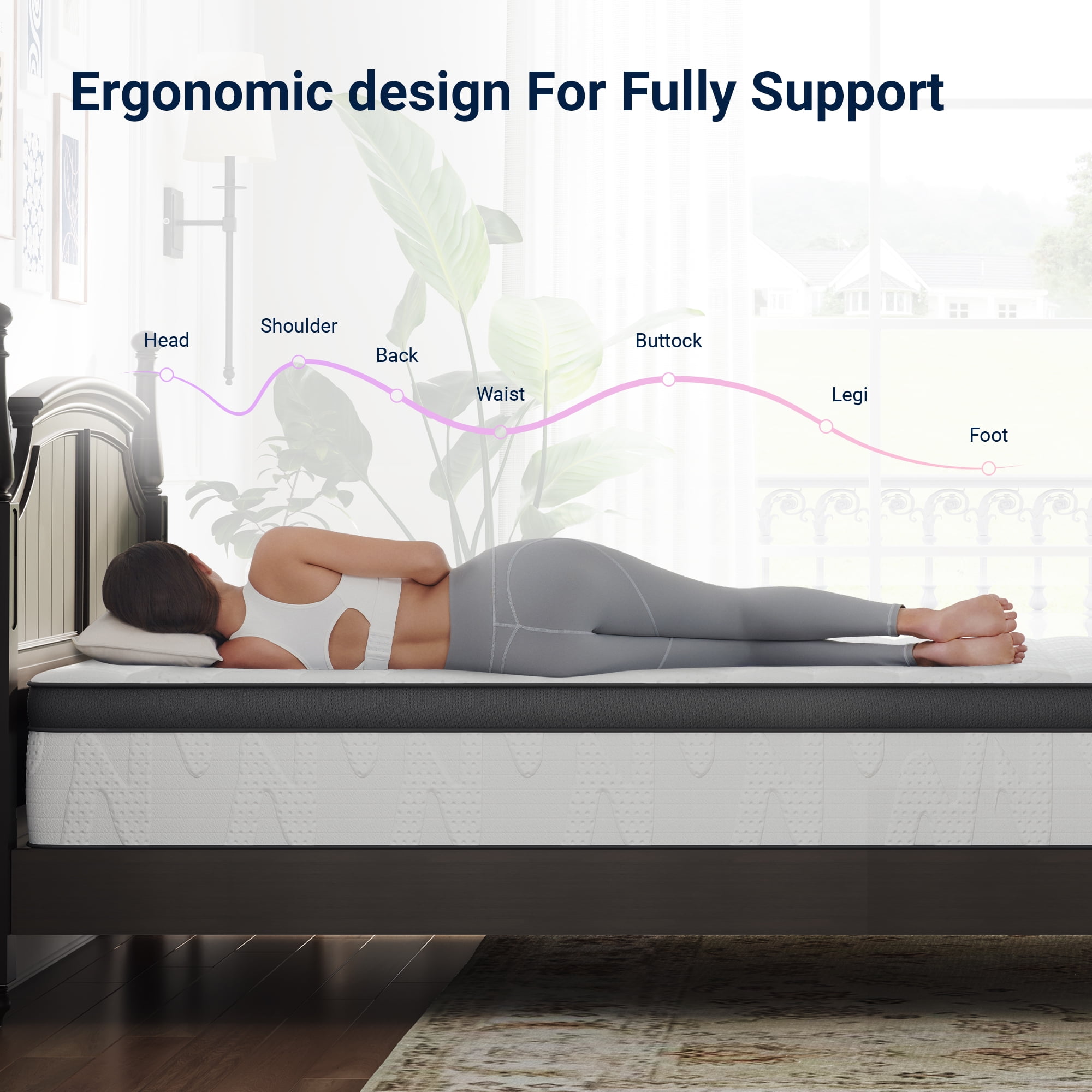 Combines supportive pocket springs with plush memory foam for balanced comfort and proper spinal alignment Made with CertiPUR-US certified foam and skin-friendly fabric, it keeps you cool and safe, ideal for sensitive sleeper Individual pocket spring minimize motion transfer, ensuring undisturbed sleep,perfect for couples or light-sleeper Reinforced perimeter coils prevent sinkage, while the breathable design enhances edge stability and airflow for a cooler sleep Designed to promote airflow, this mattress infused with cool gel memory foam, keeping you cool and fresh all night long Our mattresses are compressed, rolled up, and shipped in a box for easy delivery and setup