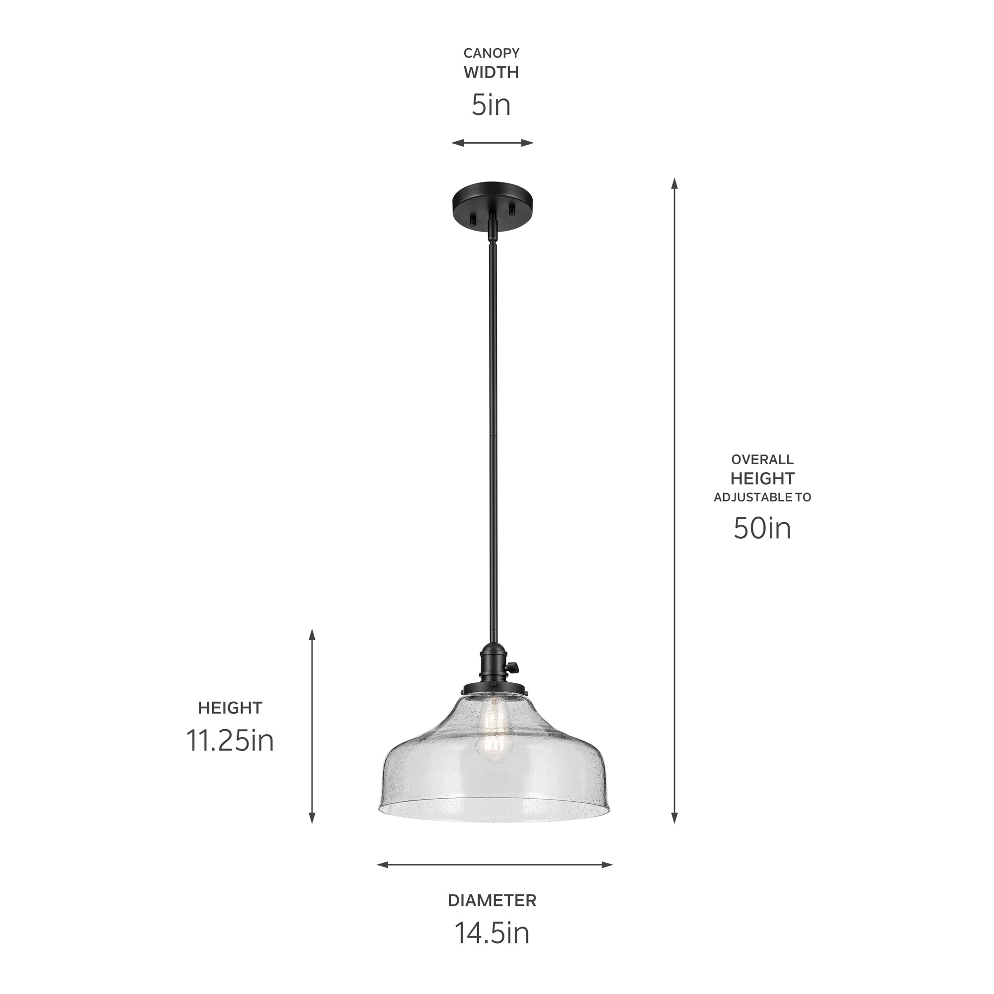 Offering convenience and ease in coordinating with other lighting options, the Avery 1 light bell pendant is truly as versatile as it is beautiful. Avery’s on-trend black finish creates a classic yet dramatic statement to any space while it complements a variety of decor, including industrial aesthetics. Its clear seeded glass adds to its charm by providing a beautiful, ambient lighting to the entire room and is easy to remove for convenience and ease of cleaning and replacement. A stem with a functional on/off switch on its socket completes the look.