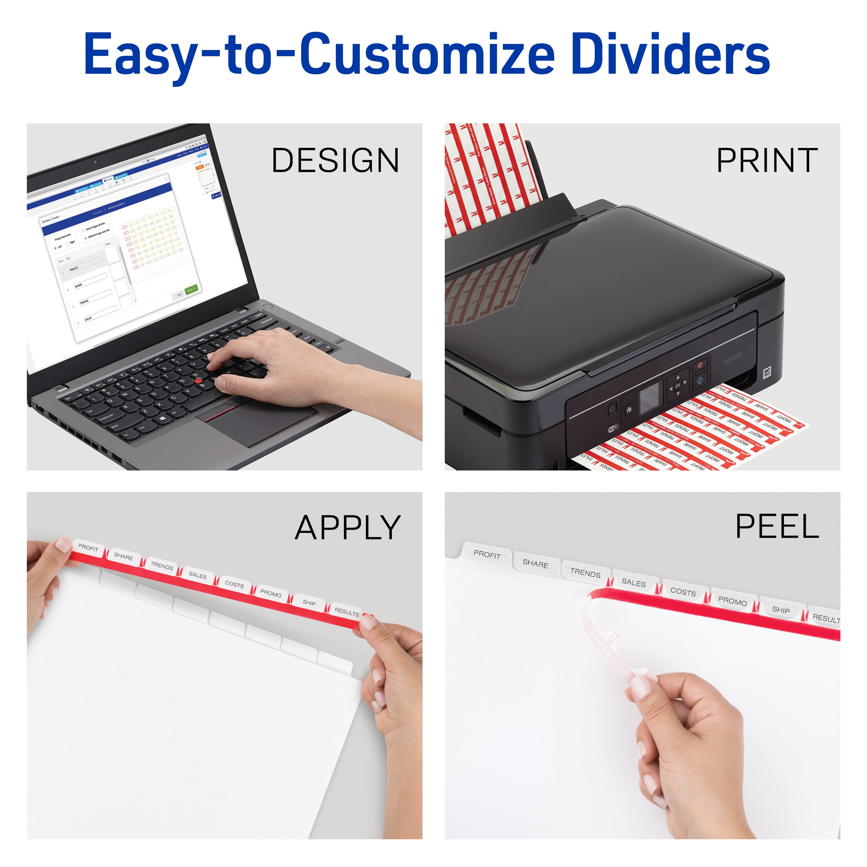 Save time and money by creating your own high-quality custom tab dividers using free templates from the Avery website and printing on your laser or inkjet printer Label all 8 tab dividers at once with the Index Maker Easy Apply Label strip that results in 25 perfectly aligned sets of tabs Get a professional, printed-on look with clear labels that virtually disappear on the white divider tabs Great for organizing your medical document binder, meeting materials, proposals, tax organizer binder, financial planner and more Long-lasting, tear-resistant tabbed dividers feature doubled-sided reinforced tabs and edges