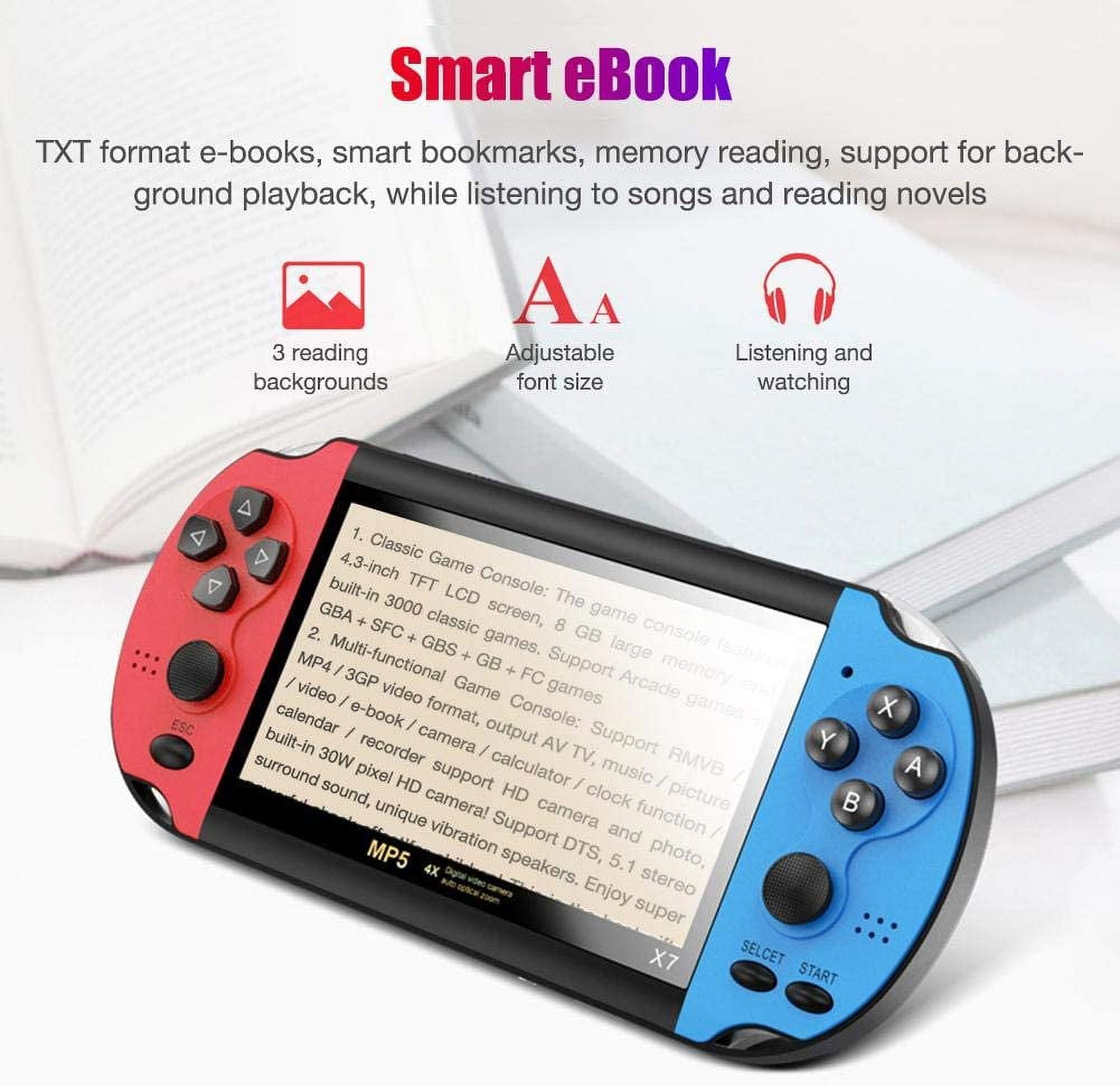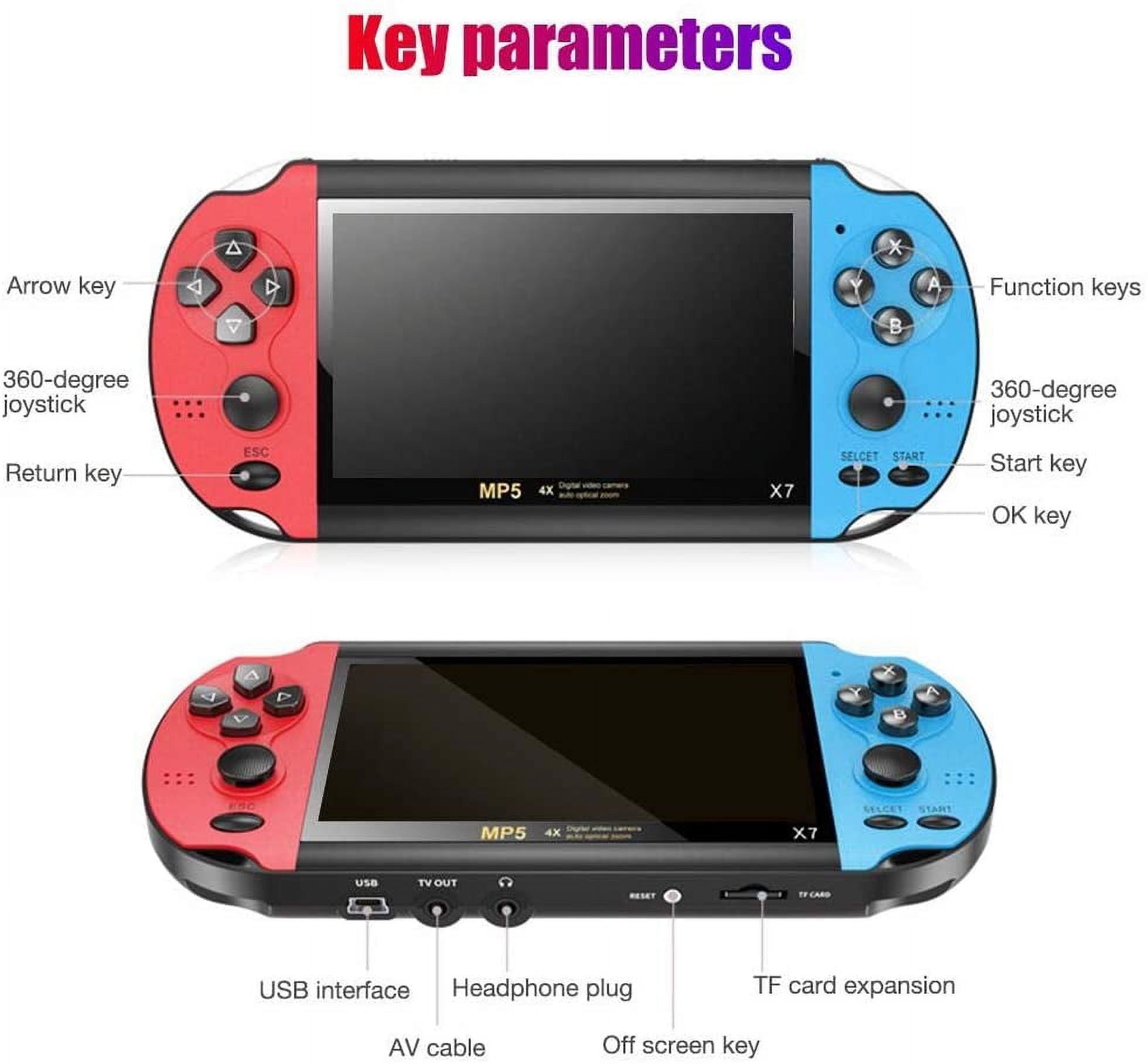 Features: Specifications: Screen size: 4.3 inches Game format: support eight simulators Video format: support AVI / RMVB / MP4 / MP5 and other formats Battery capacity: 1500 mA Memory expansion: support TF card capacity 1GB-64GBMultimedia functions: support digital photos, music, videos and movies, perpetual calendar, stopwatch, camera, video, professional e-books Operation method: default button, arcade joystick Music format: APE / MP3 / WMA / ACC / FLAC Download method: download from USB port of computer Archive function: breakpoint memory Material: ABS Color: red and blue Product size: about 17*7.8*1.8 cm/6.69*3.07*0.71inProduct weight: about 200gPackage size: about 19 x 10x 6.2 cm/7.48*3.94*2.44inPackage weight: about 270g Packing List:1 * Handheld Game Console,1 * Headphone,1 * User Manual (English),1 * USB Cable.