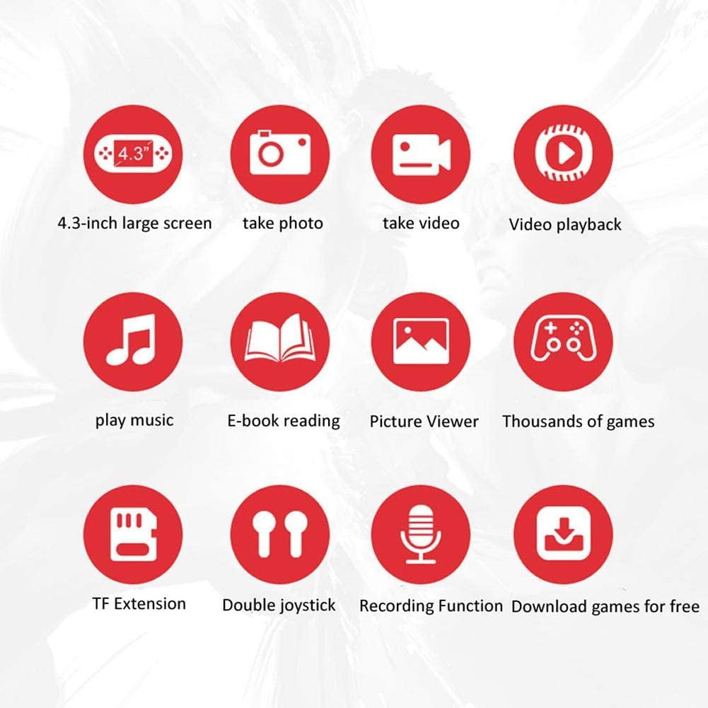 Avery Classic Retro Video Game Machine With 5.1 Inch HD Screen Builtin Thousand Classic Games Classic Game Console: The game console features 4.3-inch TFT LCD screen, 8 GB large memory and built-in 3000 classic games. Support Arcade games +for GBA +for SFC + for GBS +for GB + for FC games Multi-functional Game Console: Support RMVB / MP4 / 3GP video format, output AV TV, music / picture / video / e-book / camera / calculator / clock function / calendar / recorder support HD camera and photo, built-in 30W pixel HD camera! Support DTS, 5.1 stereo surround sound, unique vibration speakers. Enjoy super powerful shock effect! Super Long Standby Time: Built-in 1500mAh polymer lithium battery, the game machine features lasting 30 hours of battery life! Continuous playback for 8 hours. Configure the USB cable. Configure Multiple Languages: English, Japanese, Korean, French, German, Italian, Dutch, Portuguese and Spanish. Packing List: 1 * Handheld Game Console, 1 * Headphone, 1 * User Manual (English), 1 * USB Cable. The Best Gifts: With cool looks and beautiful gift boxes, the game console will be the best childhood memories for adults and the most fun experience for children! This is the best gift for any player.