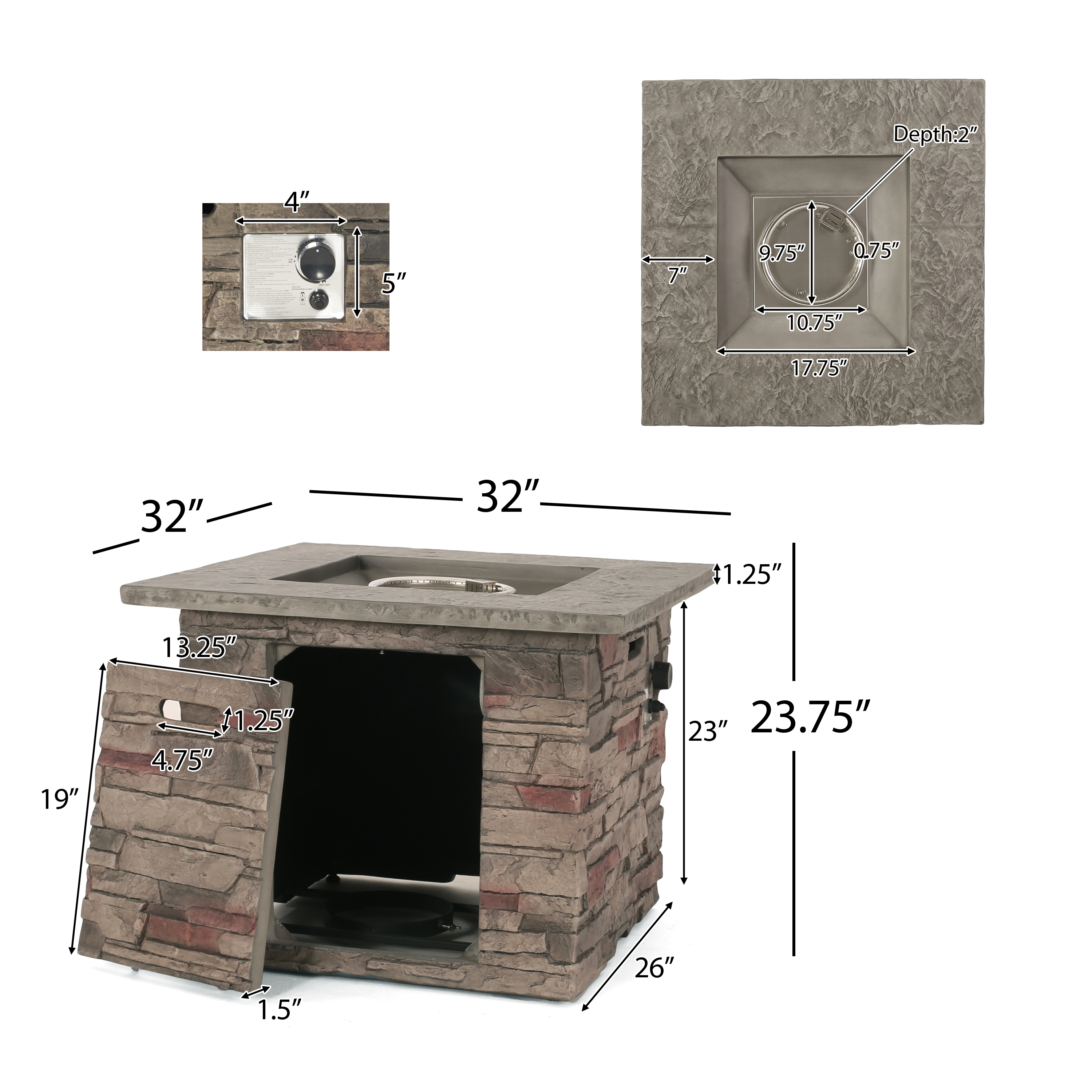 Includes: One (1) Fire Pit Material: MGO + Gas Part Color: Natural Stone + Grey Top No Assembly Required Dimensions: 32.00 inches long x 32.00 inches wide x 24.00 inches high”