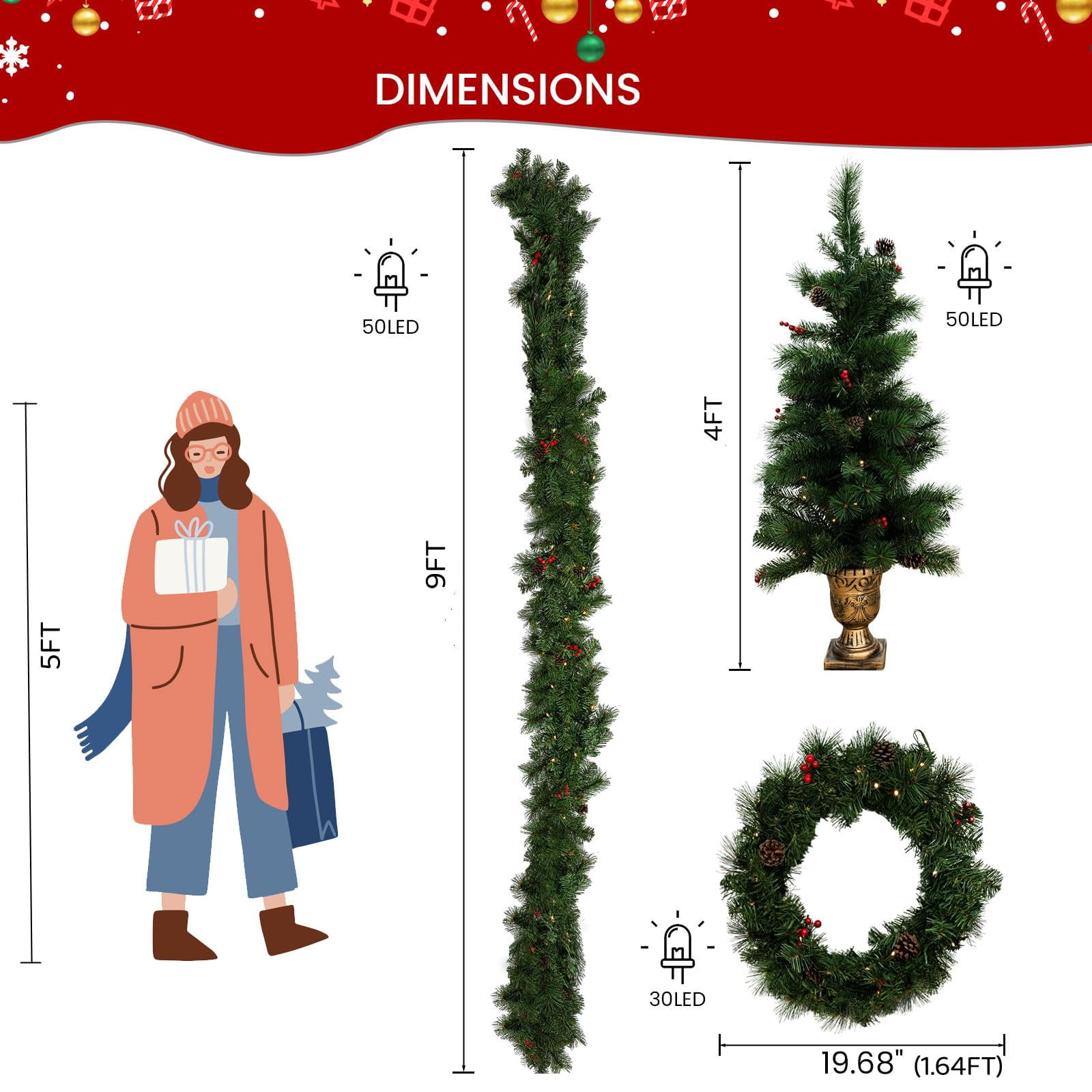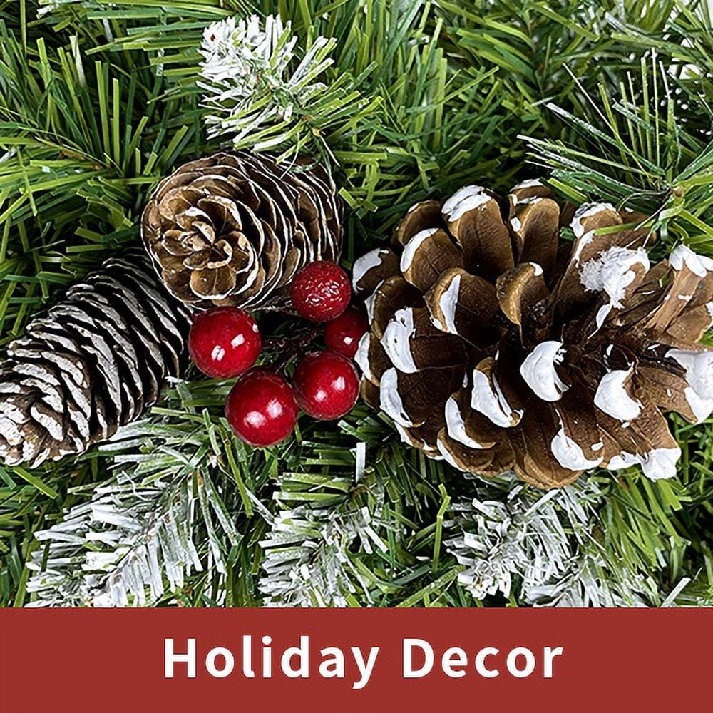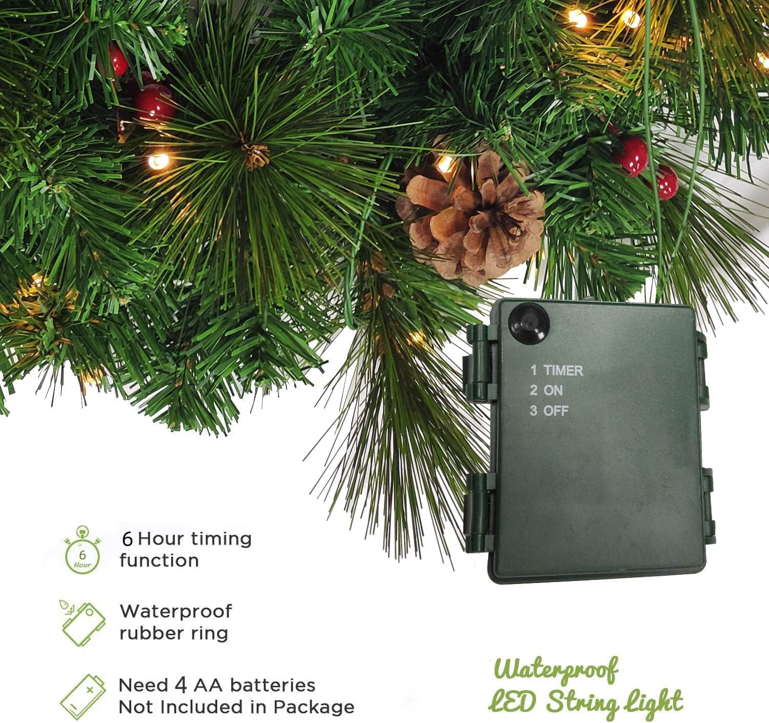 ????【Pre-lit Holiday Christmas 4-piece set】: Our Christmas set includes a 24” wreath, a 9ft garland and two 4ft entrance trees. The holiday set also has verdant leaves and red berry clusters, very vivid and natural, without any assembly steps, you just need to spread out the branches and leaves and load the batteries, turning on the light, you can get a charming Christmas set perfectly decorate your home, which can add joyful touch to corners during the holidays. ????【Premium PVC Material】: Made of premium PVC material, this Christmas set ensures odorless and non-toxic feature, allowing you to decorate home safely and durably. And the flame-retardant material gives you peace of mind when placing this Christmas 4-piece set next to your fireplace. Fine craftsmanship and strong adhesion make these realistic decorations resistant to wilting or fading and can be reused for years to come. ????【Warm & Romantic LED Light】: This 4 -piece Christmas set have 180 pre-strung LED lights (30 lights for wreath, 50 lights for garland and each entrance tree). These lights are operated by 3 (wreath) or 4 (garland, tree) batteries (the batteries are not included). Also, each switch control has 6-hour on/18-hour off timer, which can use this timer feature feature to conveniently turn Christmas decorations on and off automatically. ????【Full of Christmas Vibe】: This Christmas 4-piece set combine of 2 artificial entrance trees, wreath and garland, is a best decoration for home, office, store and school. The strong festive atmosphere and festive cheer created by the vivid green leaves and warm bright LED lights can make you have unforgettable memories during the Christmas season. ????【Perfect for any Occasion】: This Christmas light set can be used not only outdoors but also indoors and makes a perfect choice to anywhere decor. Add festival to home, classroom, office, shopping malls or any party with these beautiful natural-looking Christmas decorations. Ideal for living room, bedroom, fireplace, garden, balcony, mantels, doors and covered front porch staircase and etc.