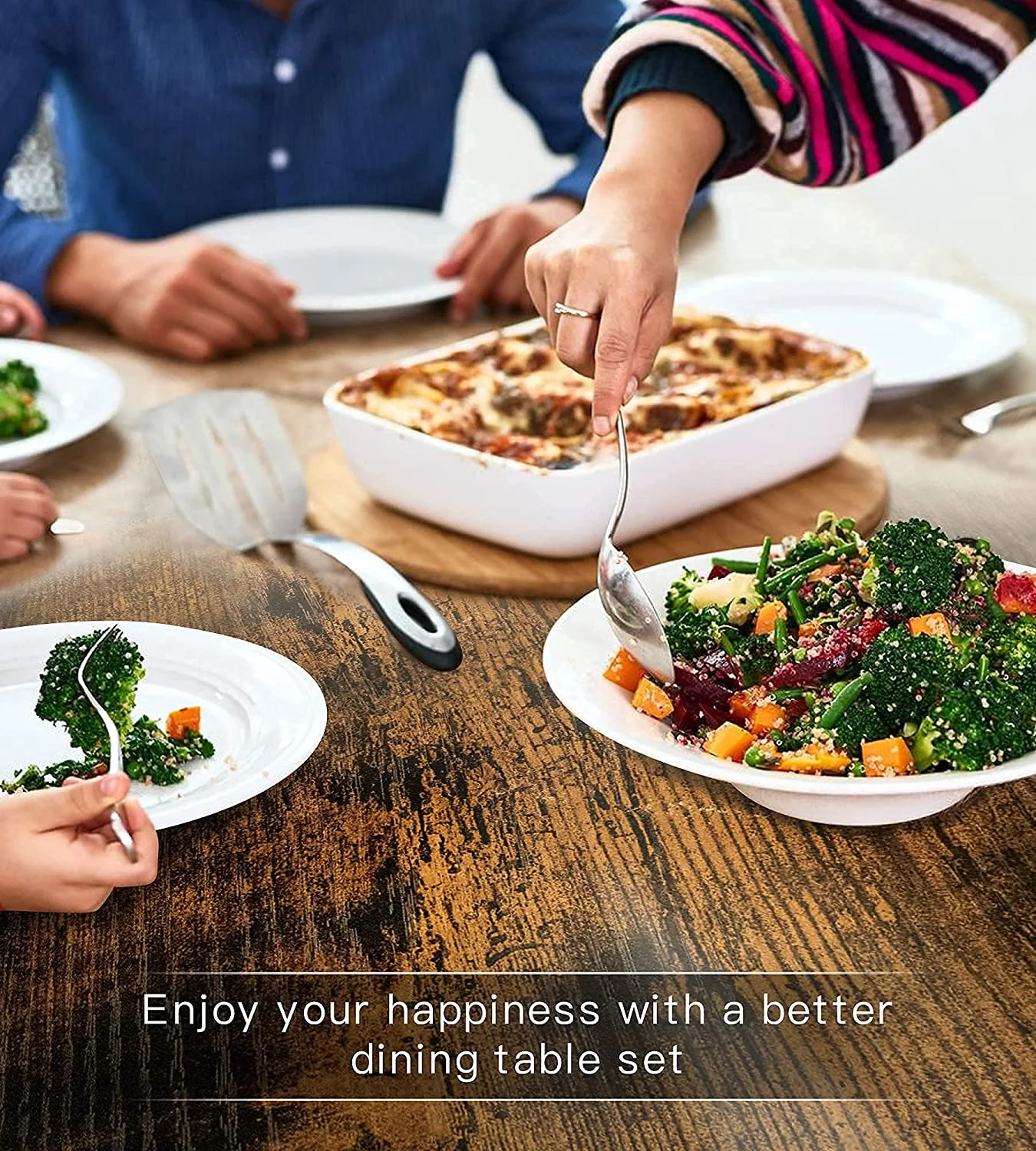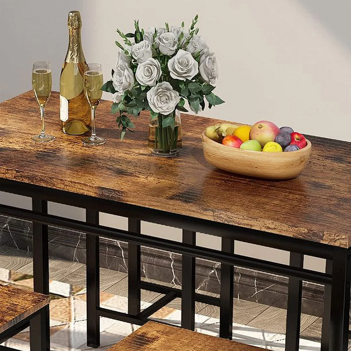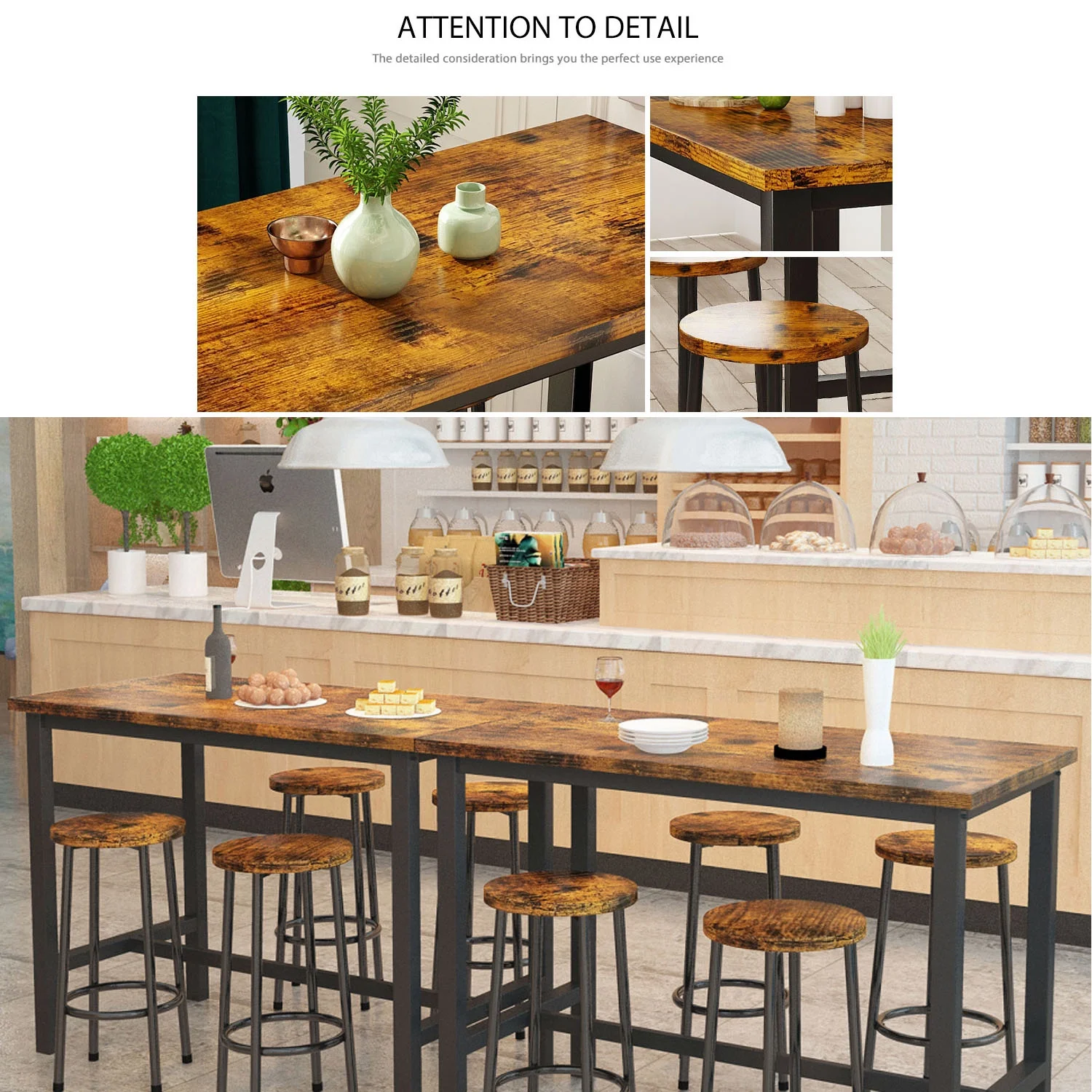 The 5 Piece Bar Table Set is perfect for dining with family and relaxing with friends. The efficiently designed rectangular table and 4 bar stools are comfortable and won’t take up valuable space in your kitchen or dining area. Enjoy dinner and drinks with friends, breakfast with the kids, and family game night at this modern, compact table and stools. When not in use, simply tuck the stools under the table to easily store and maximize your living space. In addition to home use, it is also suitable for commercial use in restaurants, bars, or other commercial establishments. 『5 Piece Bar Table Set』. Our modern bar table set with 4 bar height stools is versatile. It is suitable for dormitories, apartments, homes, bistros, pubs and your home such as kitchen or dining room. 『Sturdy and Stable Construction』. Our counter height table set is made of high quality wood and metal frame to ensure it is sturdy and durable for a long life. “Modern and attractive design The rectangular dining table and counter height chairs blend in with any type of home décor, this set adds a touch of character to any room and maintains its elegance. “Space-saving design This dining set is very compact and takes up very little storage space. When not in use, you can place them neatly under the table. The barstools and table can be perfectly combined to save you more space, perfect for small rooms. “Easy to assemble The bar table set comes with clear and concise instructions for quick assembly. Note: Be careful not to over-tighten the screws when installing or the board will break. “100% Satisfaction Guarantee Please feel free to contact us if you have any questions, our experienced customer service team will reply as soon as possible within 24 hours. Specification: Material: MDF, Metal Color: vintage brown Table top thickness: 0.7 inches Table size: 43.4 inches long x 23.6 inches wide x 35.7 inches high Stool size: 11.8 inches long x 11.8 inches wide x 23.8 inches high Number of seats: 4 Table weight capacity: 150 lbs Stool weight capacity: 280 lbs Set Includes: 1 dining table 4 Stools Note: Due to the difference of light, there may be color difference, thank you for your understanding.
