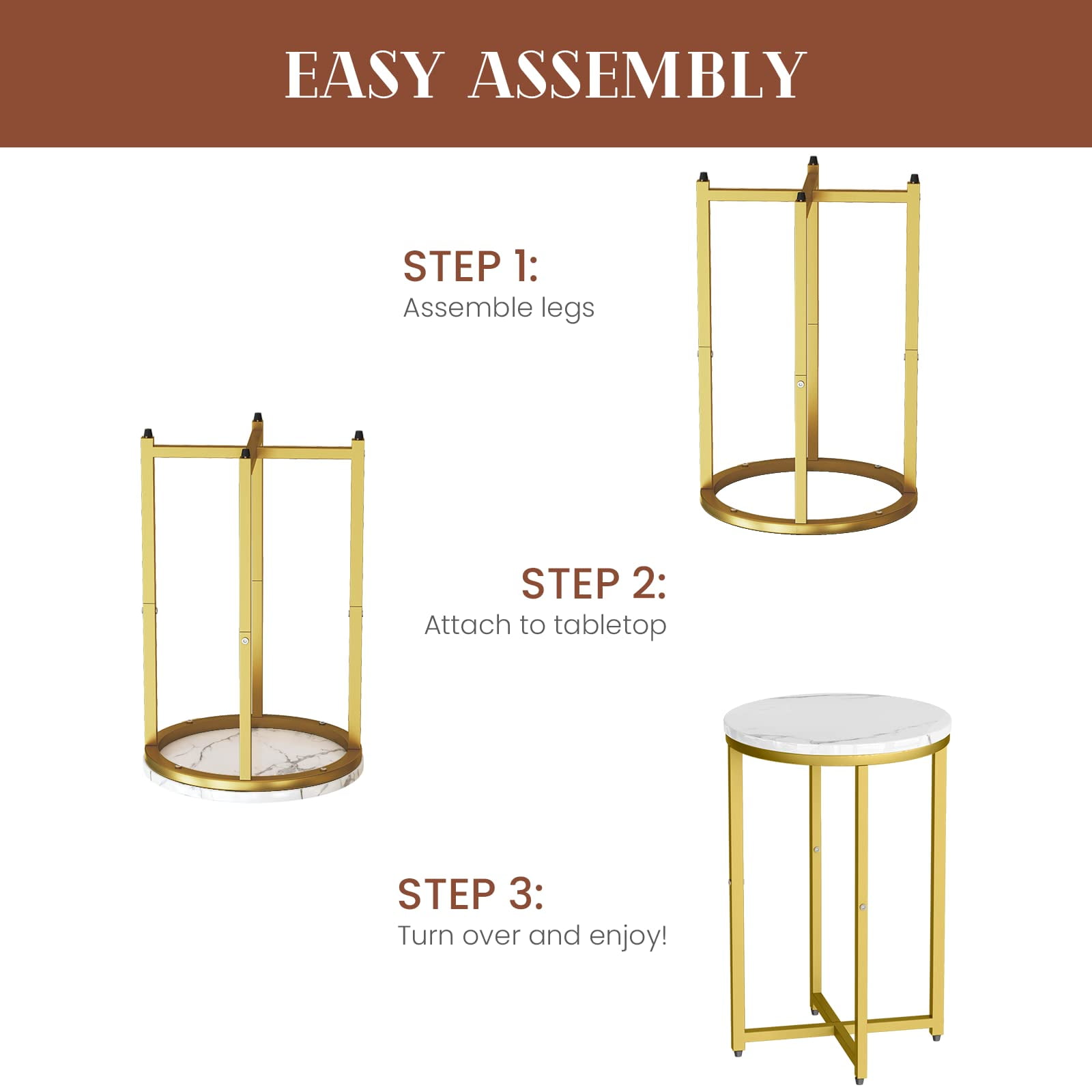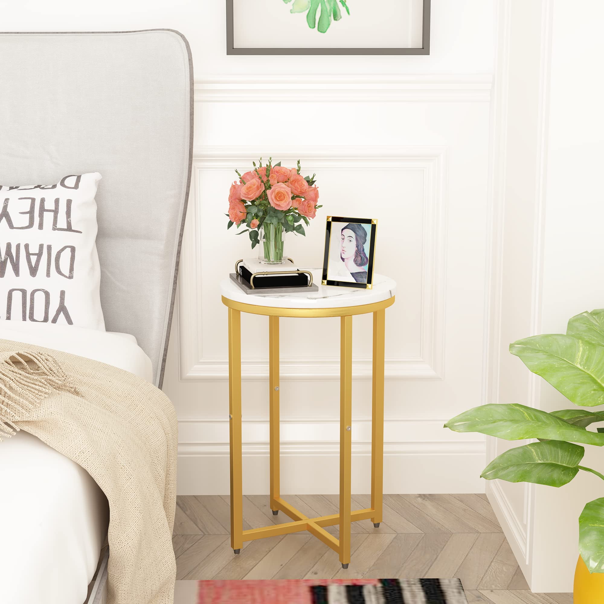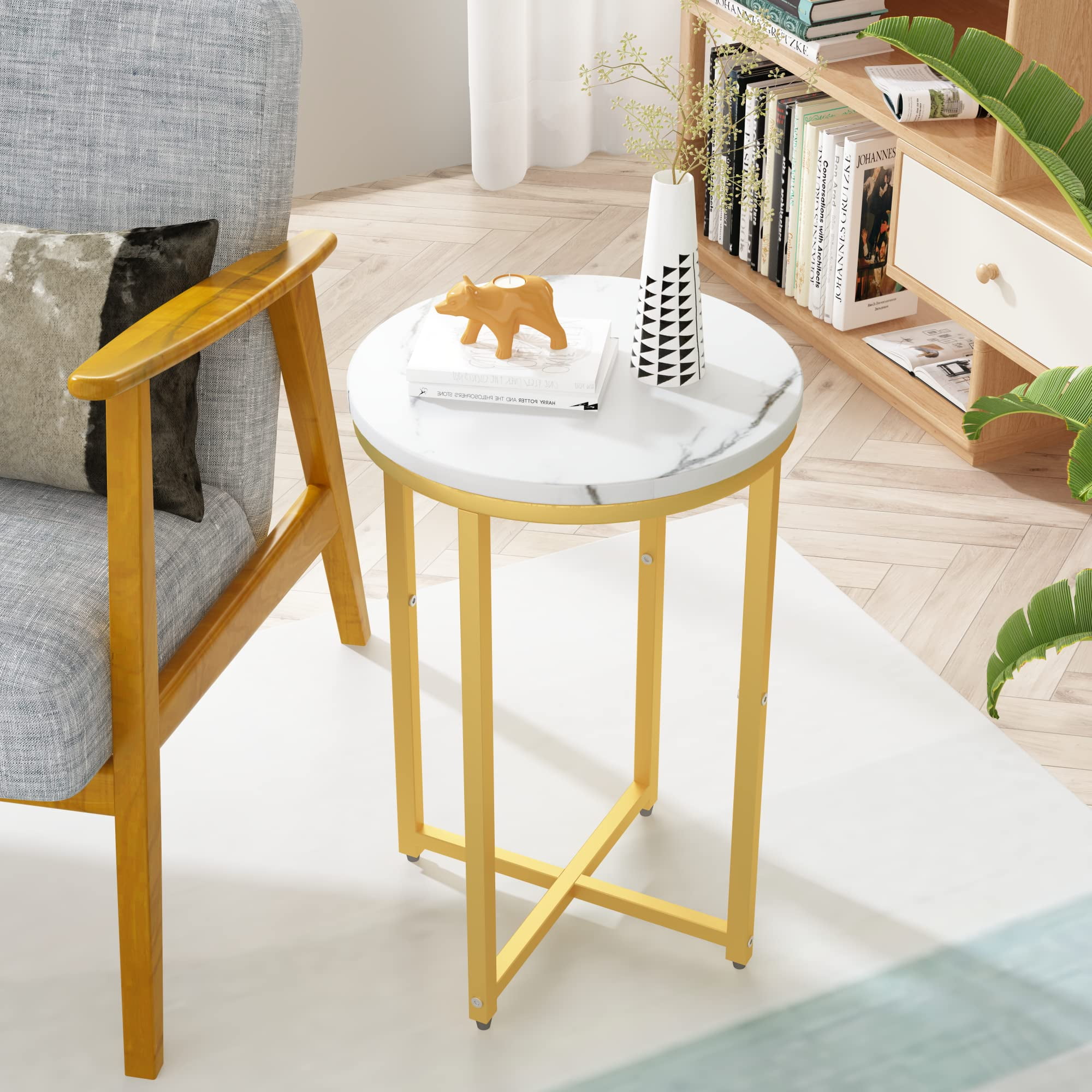 AWQM Indoor Contemporary Multifunction Metal Circle End Table, White and Gold (Set of 2) Constructed from high-quality MDF with powder-coated metal legs for durability and stability Features a cross design in the legs for enhanced support under a laminate faux marble tabletop Perfect for displaying books magazines or coffee cups making it an ideal addition to any room Designed with non-marking foot glides to protect floors from scuffs and indentations Versatile use as a bedside table laptop table or sofa side table complementing various decor styles