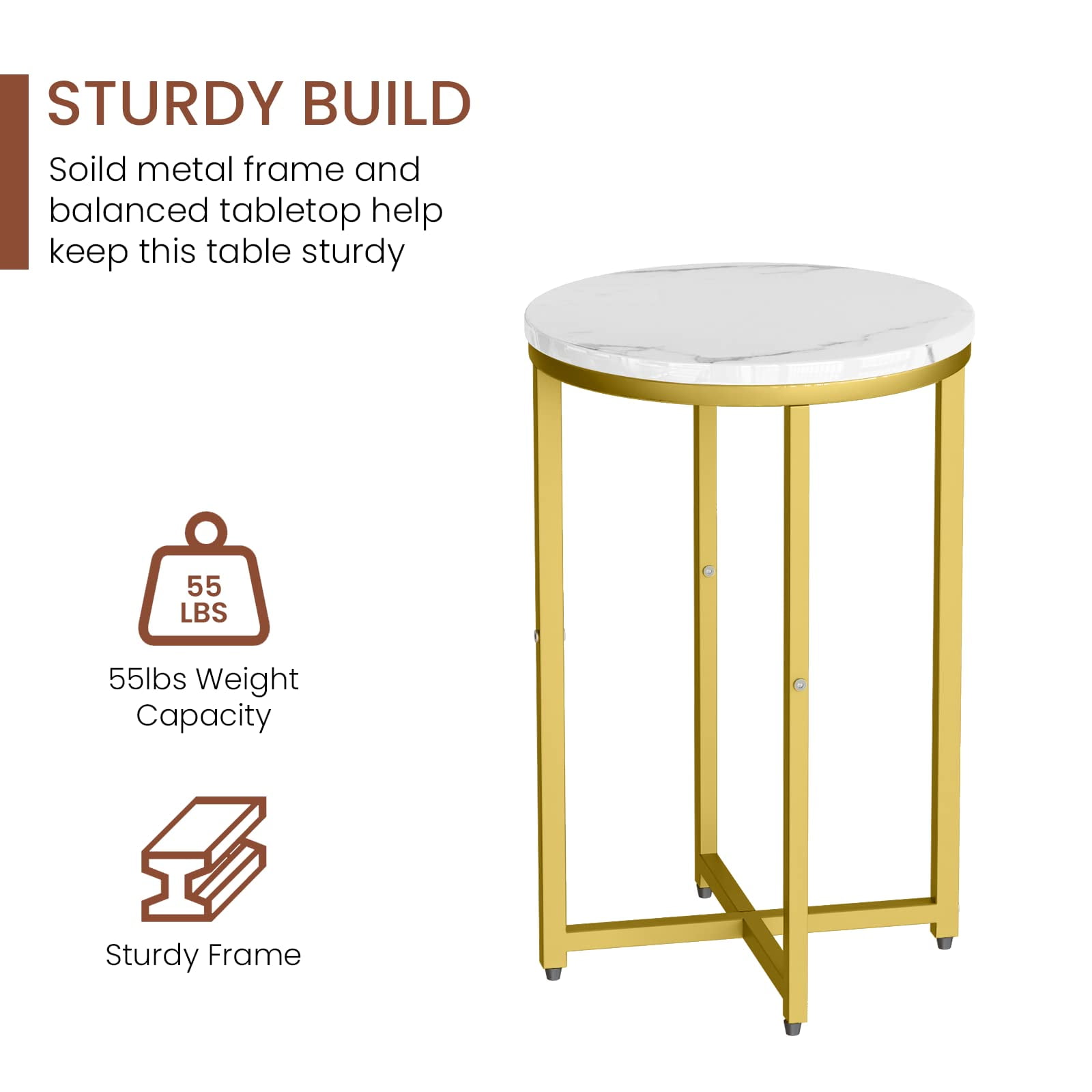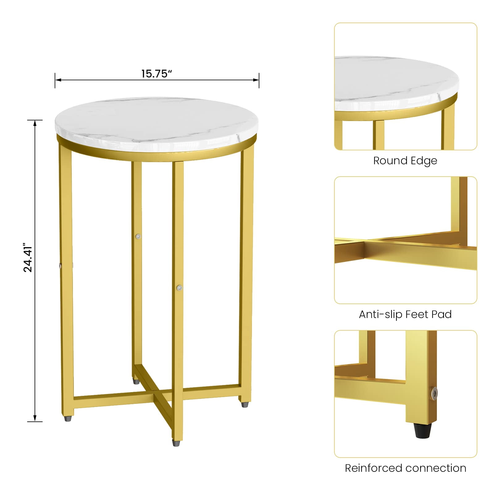 Product Dimensions: 15.75″D x 15.75″W x 24.41″H Color: White+Gold Material: MDF,Metal Weight Capacity: 55 lbs. Thickness of Table: 0.6”