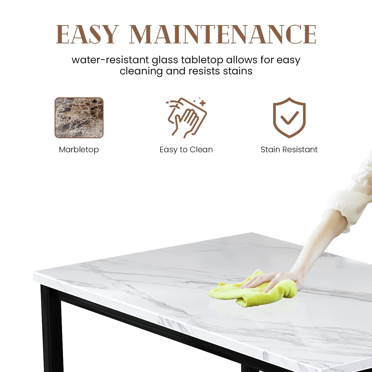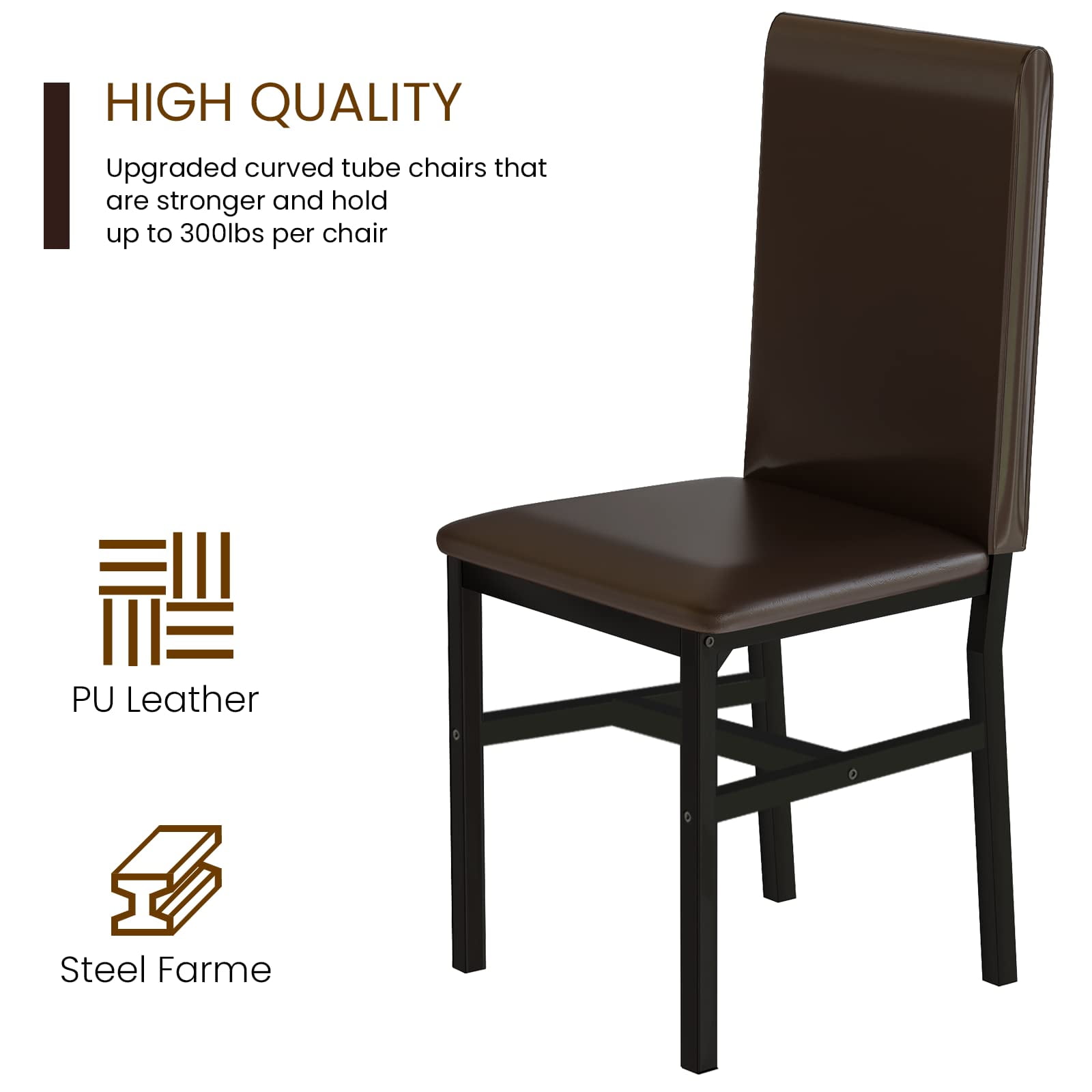 Instantly upgrade your dining space with AWMQ’s 5-piece dining set! Dining tables and chairs are a stylish necessity for everyday dining in the modern home. Not only will this set fit any space in your home, but it will also allow you to spend more quality time with family and friends. Buy it! Don’t hesitate! 『Exquisite 7 Piece Dining Table Set』 This kitchen dining set includes a marble countertop table and 4 PU leather upholstered chairs that make it look beautiful in any dining room. There is no doubt that such an elegant set is suitable for any decorative style of dining room. High Quality Our bar table set is made of rust-resistant metal frame, artificial marble table top and padded PU leather chairs, which ensures it is sturdy and durable for a long service life. 『Padded PU Leather Chairs』. Dining chairs are padded with PU leather on the seat and back part of the chairs. The soft cushion and backrest make these chairs comfortable to sit on. “Space-saving design The compact design of this dining table is perfect for small spaces or apartments. The chairs can be moved underneath the dining table when the meal is over. “Size and Capacity Table Size: 51.1”L x 29.9”W x 30.9”H Table Weight: 300 lbs; Chair size: 15.1” L x 15.1” W x 35.8” H Chair weight capacity: 200 lbs. “Easy to clean and assemble. The chairs are made of PU leather, beautifully upholstered in black color, and the table has a smooth, marble surface for easy daily cleaning. The bar table set comes with clear and concise instructions for quick assembly. Specification: Material: metal frame, PU leather, artificial marble Table top color: black Chair color: black Chair weight capacity: 300 lbs Table weight capacity: 200 lbs Assembly time: approximately 1.5 hours Number of seats: 4 Set Includes: 1 dining table 4 chairs Tool kit Assembly instructions Warranty card