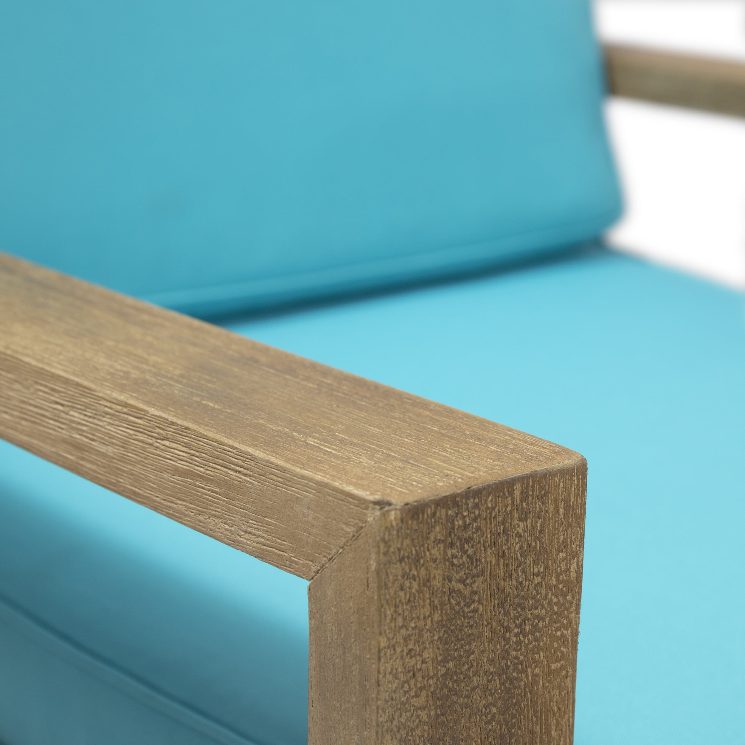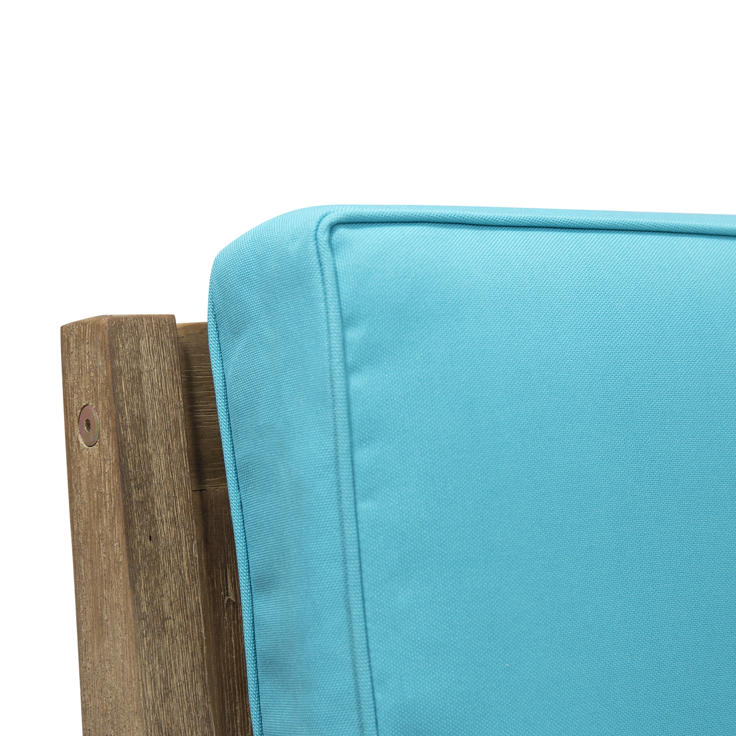 Noble House Ayaan Outdoor Acacia Wood Club Chairs with Cushions, Set of 2, Brushed Light Brown and Teal: Includes: Two (2) Club Chairs Material: Acacia Wood Cushion Material: Water Resistant Fabric Cushion Composition: 100% Polyester Finish: Brushed Light Brown Cushion Color: Teal Hand-Crafted Details Assembly Required Dimensions: 30.00 inches deep x 31.00 inches wide x 28.00 inches high Seat Dimensions: 25.25 inches deep x 25.25 inches wide x 12.00 inches high Arm Height: 21.25 inches