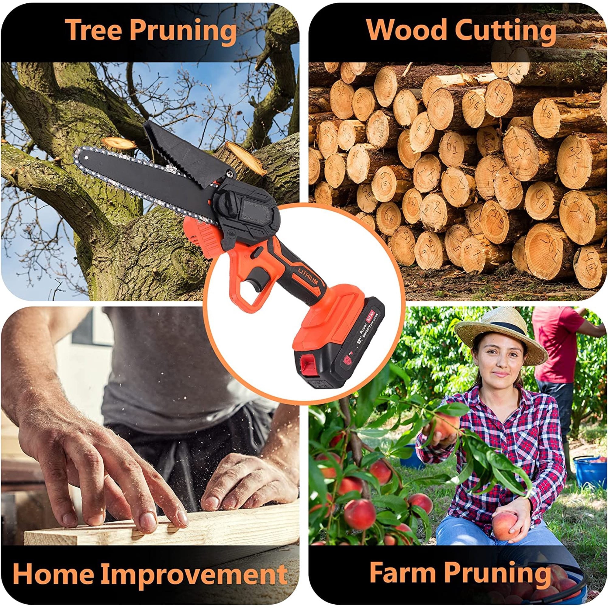 Easy to Use & A Must-Have Investment – Finish more work in less time with this featherweight, 6-inch handheld chainsaw. Its little size lets us work in small spaces that no traditional chainsaw can. Even the tiniest girl can hold it in one hand to take a tree down like butter! The Mini Chainsaw: Cut through a 5″ thick branch in only 5 seconds with this cordless chainsaw & super high chain speed (19 ft/s), reached by its powerful pure copper motor. Longer than most batteries in the market, our 21V, 2.0Ah high-energy lithium battery lasts around 45 mins.< Safe & Built to Last: Enjoy double protection against accidental start by a security switch. Our Certified Mini Chain Saw also protects you from splash & dust with a 90 ° splash guard baffle The chainsaw comes with an ergonomic design and high-quality materials. Extra Safe with Chain Brake: We install the extra chain brake to ensure it works like a charm! The chain stops precisely for more safety and accurate cut. It & the beast for fast trimming trees, logging & pruning branches, wood cutting, gardening, harvesting, home improvement, and DIY projects!
