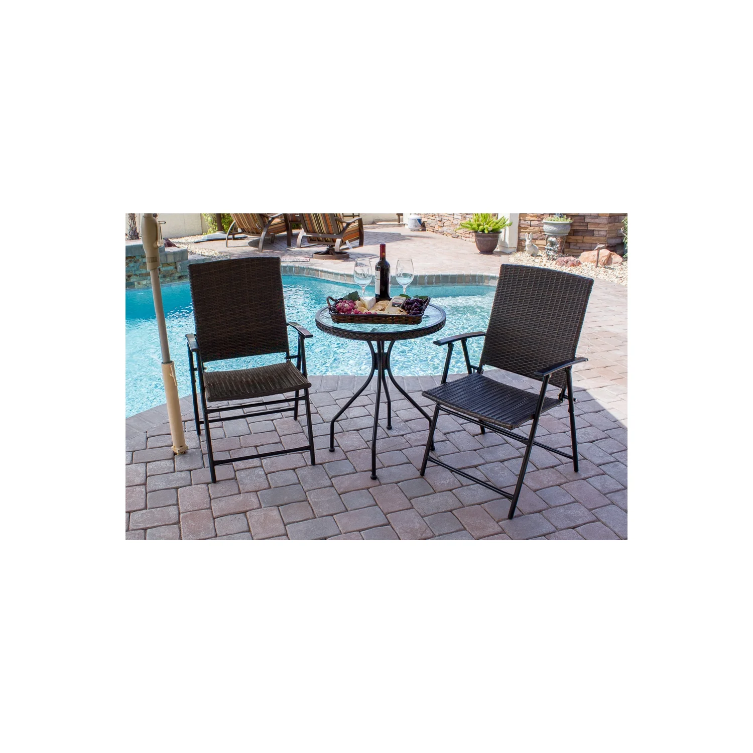 AW-085 AZ Patio Heaters Three Piece Patio Set in Dark Brown Wicker, Create a welcoming outdoor space for sharing drinks and hors d’oeuvres with this three-piece patio bistro set! Measuring 28” H x 24” D x 24” W overall, the round bistro table features a 5mm-thick tempered glass tabletop with braided wicker border, while a tubular metal trestle base includes four round feet. Founded on a tubular aluminum frame, each matching armchair features a resin wicker back and seat, fixed arms, and four slanted legs. best of all, this set folds for effortless storage.