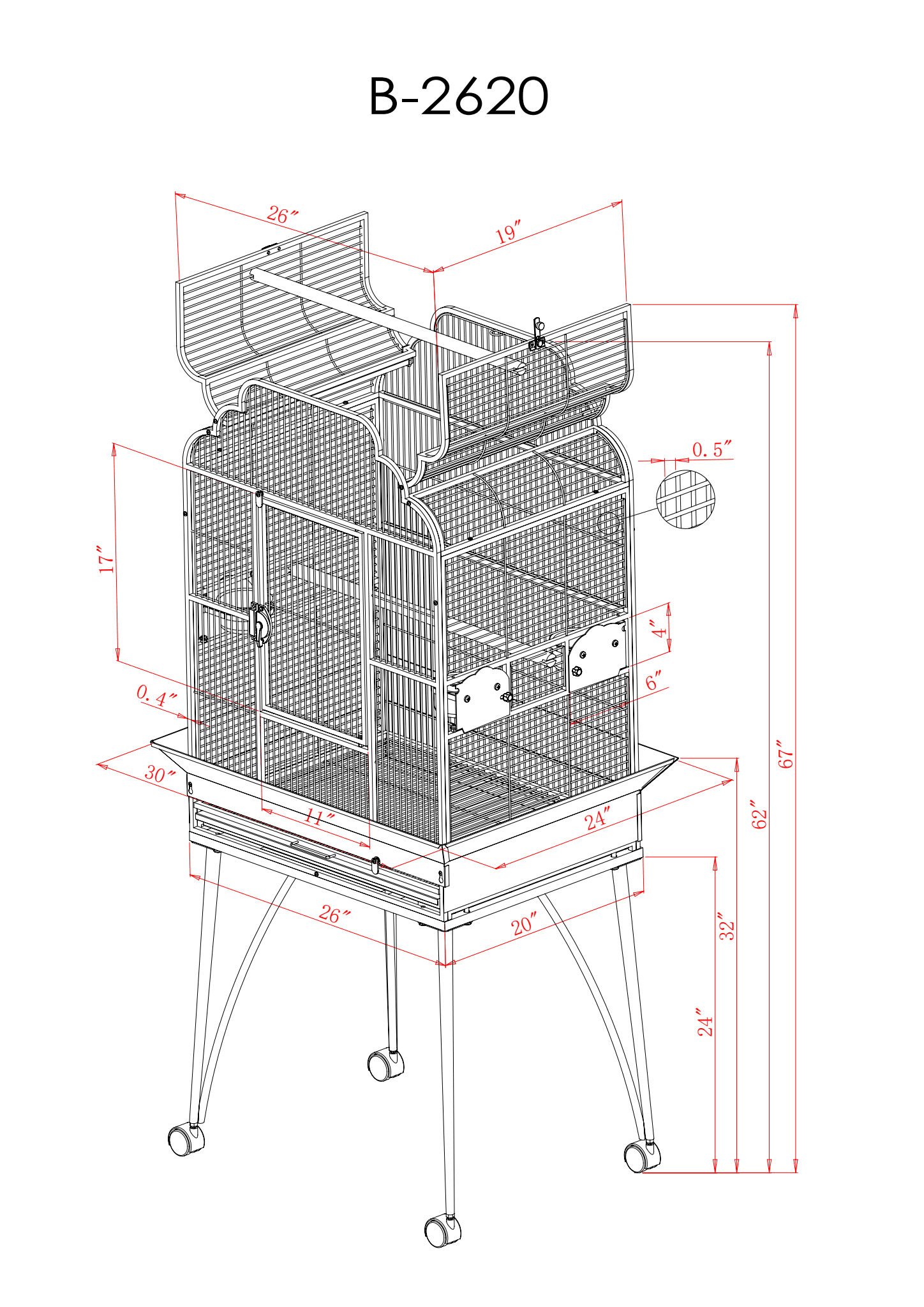 Introducing the A&E Cage Co B-2620 Platinum Victorian Open Top Bird Cage— the ultimate home for your feathered friends! Crafted with precision and care, this spacious bird cage is designed to provide a comfortable and secure living environment for your beloved birds.Constructed from durable wrought iron with a non-toxic powder-coated finish, the A&E Cage Co B-2620 Platinum Victorian Open Top Bird Cage offers both strength and style. With ample space for your birds to move around, stretch their wings, and exercise, this bird cage promotes physical activity and overall well-being. The included perches provide additional opportunities for your birds to perch, play, and relax.Featuring an open top play area with perch. This bird cage makes it easy for you to interact with your feathered companions, change their food and water, and clean the cage with minimal hassle. The slide-out tray and grate allow for quick and convenient cleaning, ensuring a hygienic environment for your birds.The A&E Cage Co B-2620 Platinum Victorian Open Top Bird Cage is designed with safety in mind, featuring secure locks on all doors to prevent escapes and ensure peace of mind. The 1/2” spacing between the bars is carefully selected to prevent any potential injuries or escapes, while still allowing for proper ventilation and visibility.The A&E Cage Co B-2620 Platinum Victorian Open Top Bird Cage provides a comfortable and secure home for your medium and large sized avian companions. Give your birds the best with this premium bird cage that combines quality craftsmanship, functionality, and style in one exquisite package.