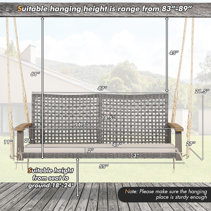 - The sitting area of this porch swing chair is 47-in wide, providing ample space for 2 people to swing together.