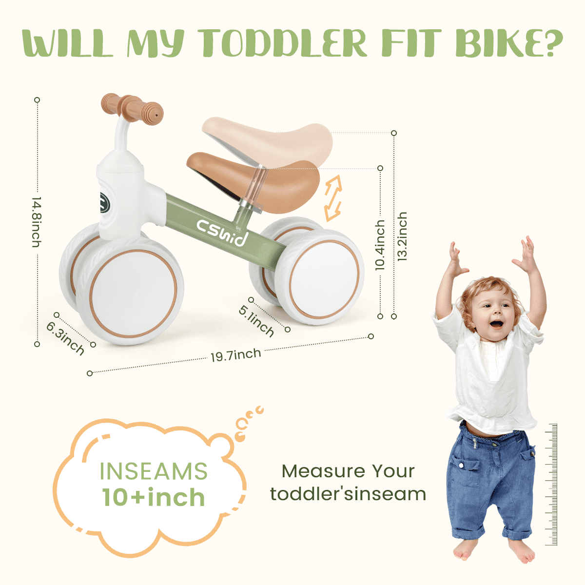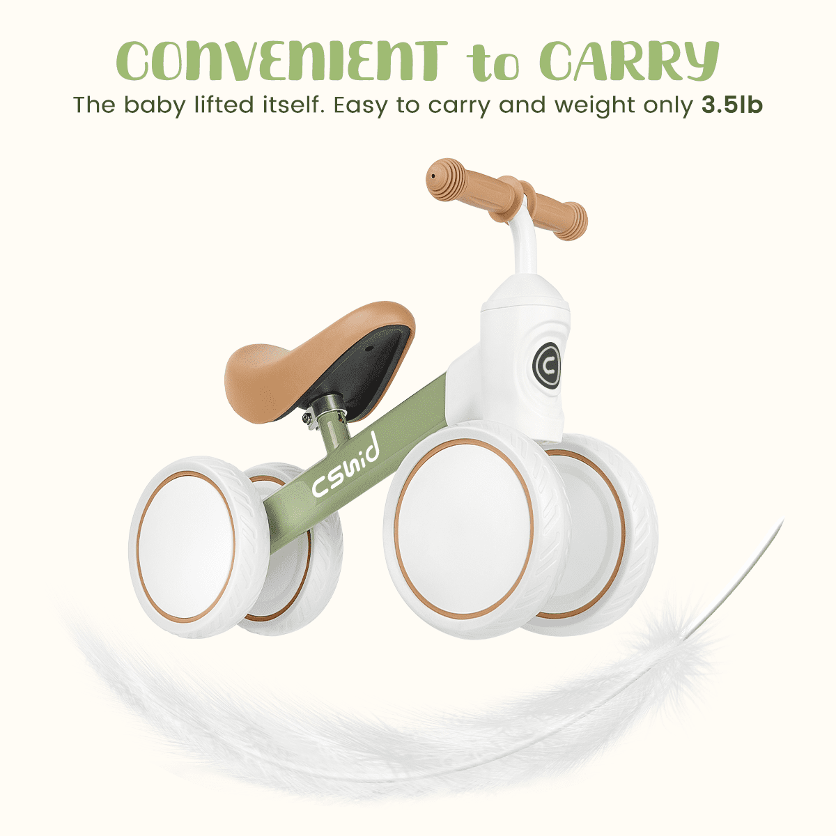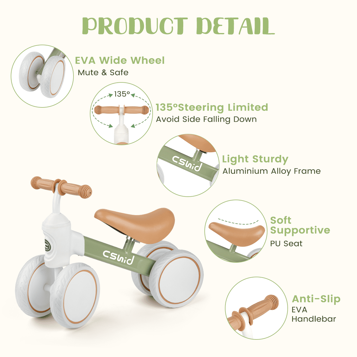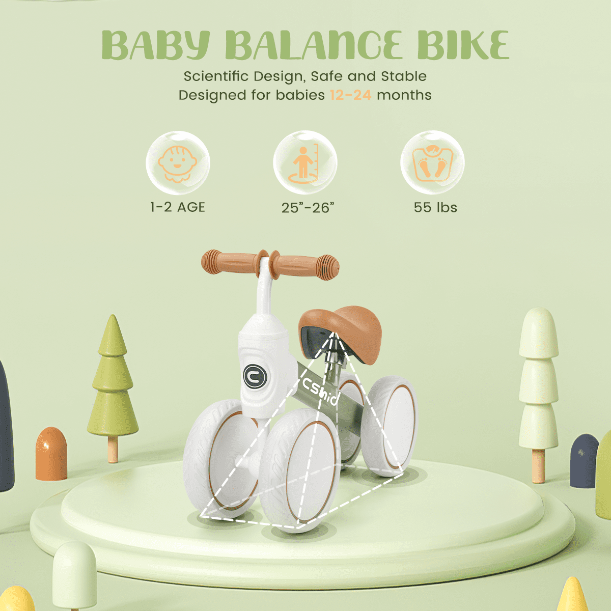 Cshidworld Toddler Balance Bike is suitable for indoor and outdoor riding. It keeps kids happy riding even on carpet. It’s a Great gift for toddlers to learn to walk and ride. Can help enhance the baby’s balance, steering, coordination, and increase self-confidence. Start your adventure riding this kids balance bike! Features: ✅ Design for 12-24 Months Babies ✅ Carbon Steel Frame, Sturdy Constrction ✅ Adjustable Seat, 10.4in to 13.2in ✅ PU Soft Seat ✅ 135° Steering Limiter Design ✅ Non-slip EVA Widened Tires ✅ Maximum Weight Capacity 66lbs ✅ Light Weight, Only 3.5lbs ✅ Easy to Assemble ✅ Suitable for Indoor and Outdoor Use ✅ Enhance the baby’s balance, steering, coordination, and increase self-confidence Sturdy Carbon Steel Frame The carbon steel Frame is lighter and stronger, weighing only 1.5 kg (3.3 lbs), making it easy for your baby to ride and stride. EVA wheels are quiet and non-slip for indoor and outdoor riding. TPU handlebars prevent hands from falling off the handlebars. The low-resistance bearings save more effort when riding. Adjustable Seat & 135° Steering Limit The soft and adjustable PU seat allows the kid to ride in a comfortable position. Non-slip handlebars and 135-degree steering settings prevents them from turning too far and falling to the side while still on their bike. The left and right steering wheels do not leave the ground to steer by gravity, which effectively exercises the balance ability.