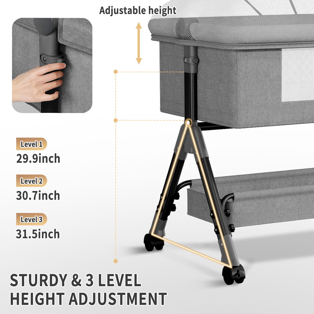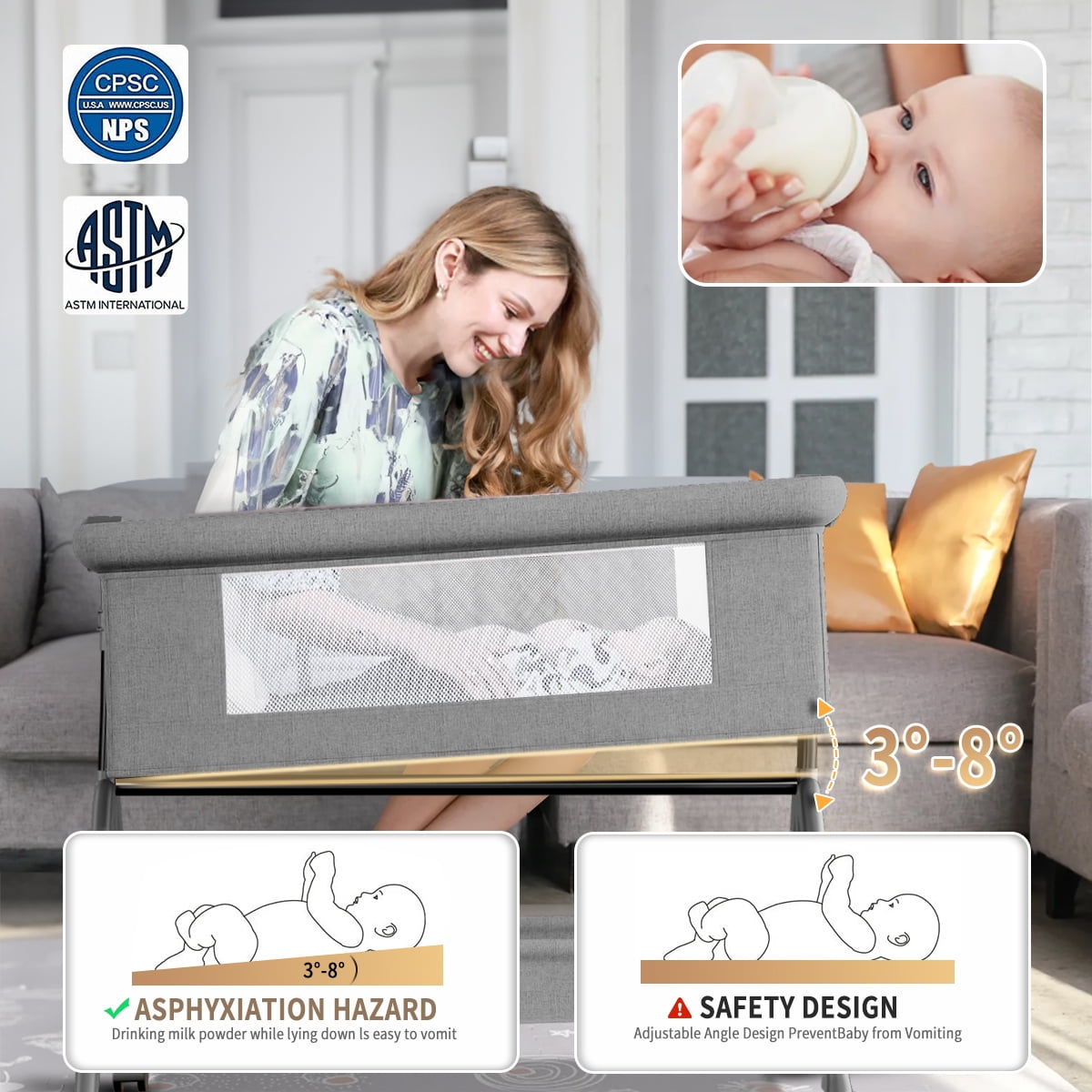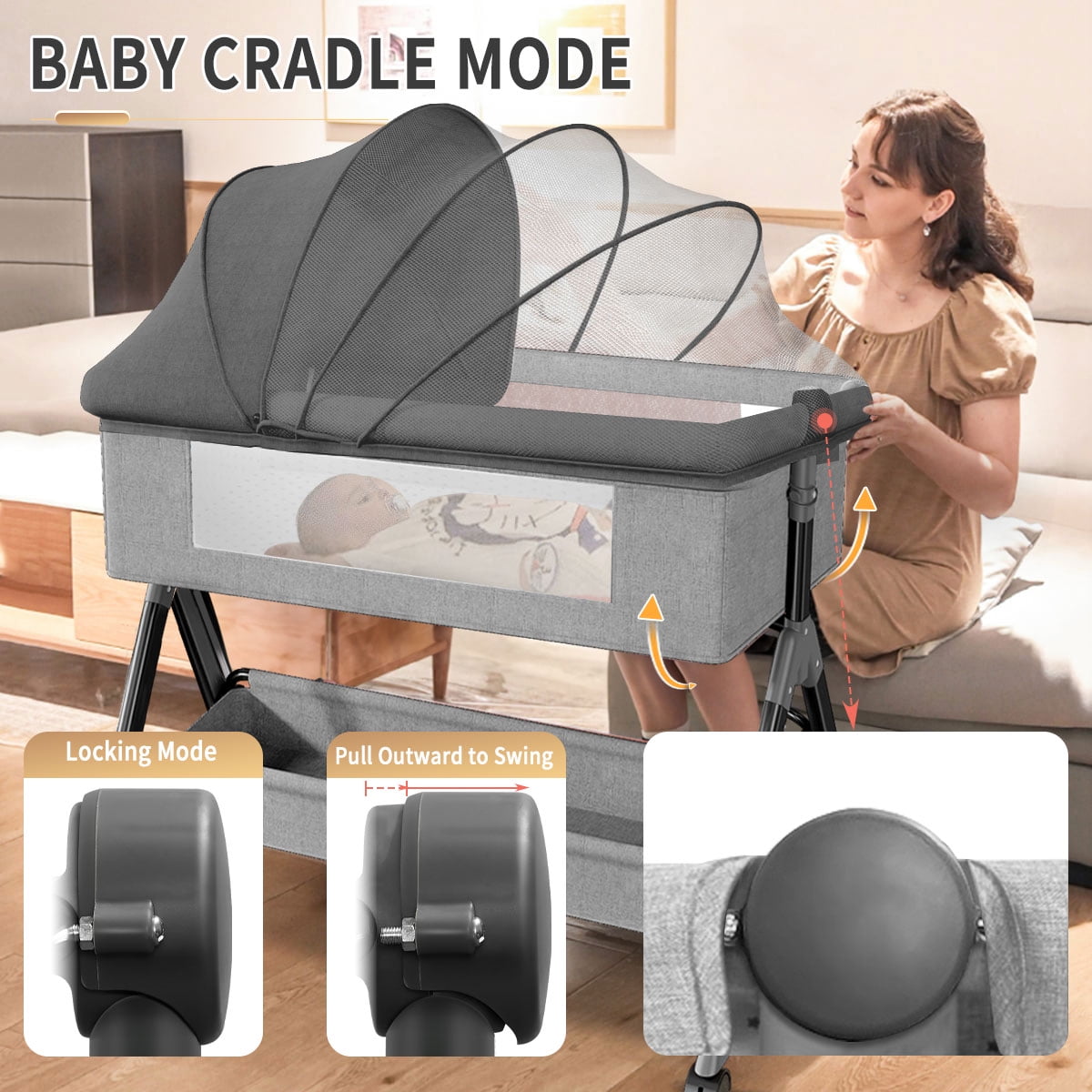 Featuers: Silent Casters Free to Push, Equipped with Casters, Universal Push, Easy to Move with Brakes, Stable Cot Without Running Around. Height Adjustable It is Suitable for Big Bed, and the Height of the Sleeping Basket Can Be Adjusted on 3 Levels, Which Can Easily Adapt to the Height of a Big Bed and Mother, Making It More Convenient to Use. Comfortable Space Healthy Sleep, Designed for 0-6 Months Old Baby, Spacious Space, Free Turning Over, Free Movement, No Pressure. Recumbent Adjustment(3-8° Comply with CPSC) Recumbent Adjustment to Prevent Milk from Choking and Overflowing,Raise One Side of the Head to 1-2 Gears to Facilitate Feeding and Prevent Milk from Overflowing after Meals. Seamless Splicing Bed The Splicing Big Bed is Opened on the Side, Close to the Big Bed at Zero Distance, Convenient for Taking Care of the Baby at Night. Airs Mesh on Both Sides This breathable fabric is also made to promote airflow, giving the baby a cooler and comfortable space to rest. When a baby is this calm, everyone can rest easy. The mesh side allows you to observe your baby anytime and interact with your baby. Zip design allows you to open the crib and ideals for night baby care. Easy To Clean The Whole Bed Can Be Disassembled for Easy Cleaning, and the Mosquito Nets and Bed Covers Can Be Disassembled for Easy Cleaning, Clean and Healthy. Multifunctional use Not only limited to the head of the bed but also applicable to various sofas, beds, or other places. Newborns’ bedside cots also have practical designs. WARNING: 1.After the baby falls asleep, be sure to switch to lock mode to prevent any danger from your baby leaning to one side in cradle mode. 2.When your baby is playing or sleeping in bassinet, you must accompany him at all times.