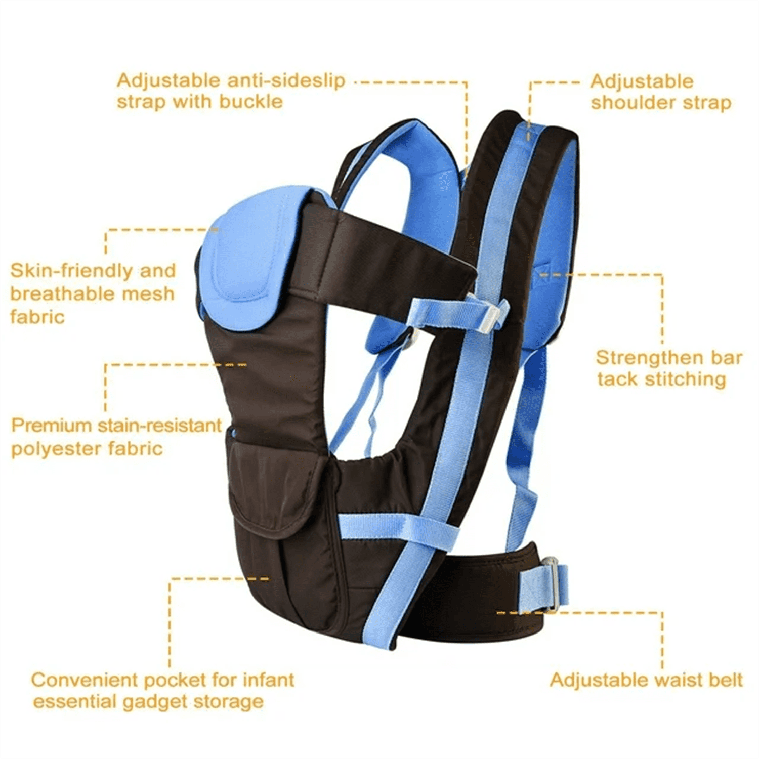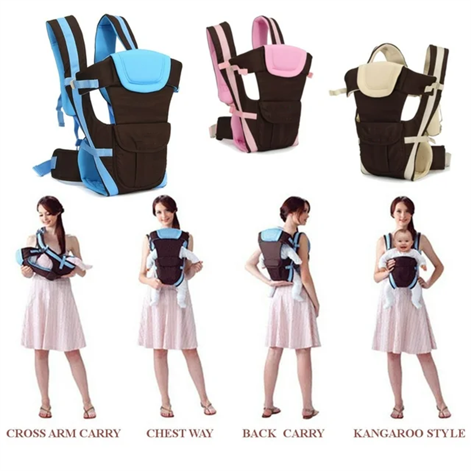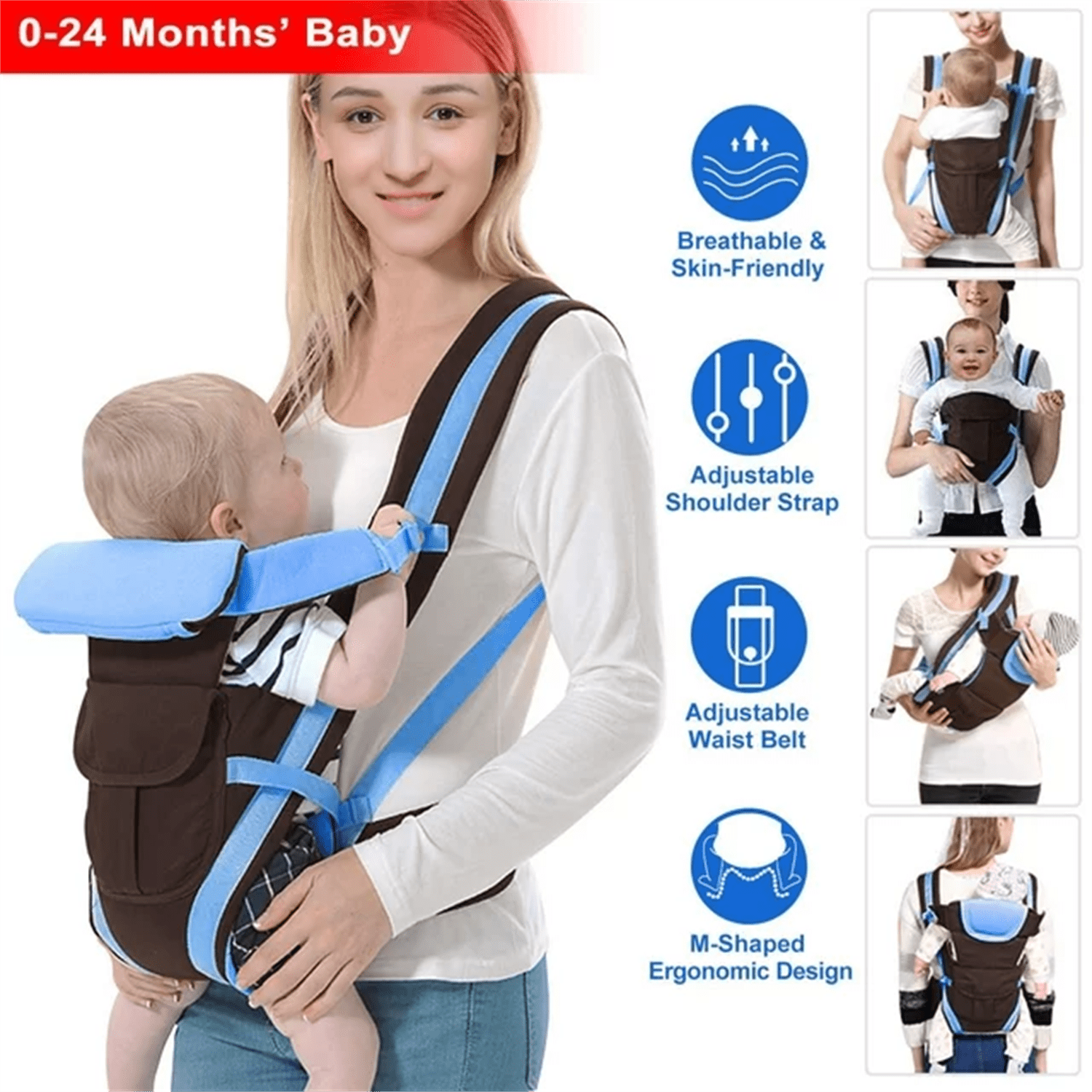 ????All In One Baby Carrier: Adapts to your growing baby from newborn to toddler (26.45lbs and fits babies from 0-24 Months). No separate infant insert required. All carry positions included, face baby in or out. ????Wide Shoulder Straps: According to ergonomics, carefully designed, very labor-saving and increase force area; save much labor after long time wearing. ????Multiple Carry Positions: Front cross hold position for 0-3 months’ old baby, front inward facing position for 6-24 months’ old baby, forward facing position for 6-24 months’ old baby and back carrying type for 3-24 months’ baby. ????Adjustable Shoulder Strap: Coming with two 2.95in wide shoulder straps whose length can be adjusted from 17.7in to 39.3in to snugly fit your shoulder and built-in pressure reduction sponge to release the load of shoulder. ????Safe For Baby: Between the medium of the two shoulder straps come with an adjustable security strap with buckle to prevent the shoulder straps from sideslip. And equipped with a 3.43in adjustable wide waist belt (the length can be adjust from 24.02in to 41.73in) to effectively increase the stability of the baby carrier. Specifications: Material: Polyester Fabric + Sponge + Nylon Suitable for the Baby: 0-24 Months Old Load Capacity: Approx.12kg/26.45lbs Item Color: Pink, Blue, Khaki (Optional) Space of Two Legs: From Left to Right Leg: 15cm/5.9in, from Left Arm to Right Arm: 18cm/7.1in Shoulder Strap Size: Adjustable Length: 45cm-100cm/17.7in-39.3in, Width: 7.5cm/2.95in Waist Strap Size: Adjustable Length: 61cm-106cm/24.02in-41.73in, Width: 8.7cm/3.43in Item Size: 31cm x 5cm x 45cm/12.2in x 1.97in x 17.71in (L×W×H) Item Weight: 417g/0.91lbs Package Contents: 1 x Baby Carrier 1 x Waist Strap Baby Carrier, Infant Carrier, Baby Wrap, Kids Sling Backpack, Child Carrier, Toddler Carrier, Baby Hipseat Carrier, Baby Carrier Backpack, Adjustable Baby Carrier, Breathable Infant Carrier