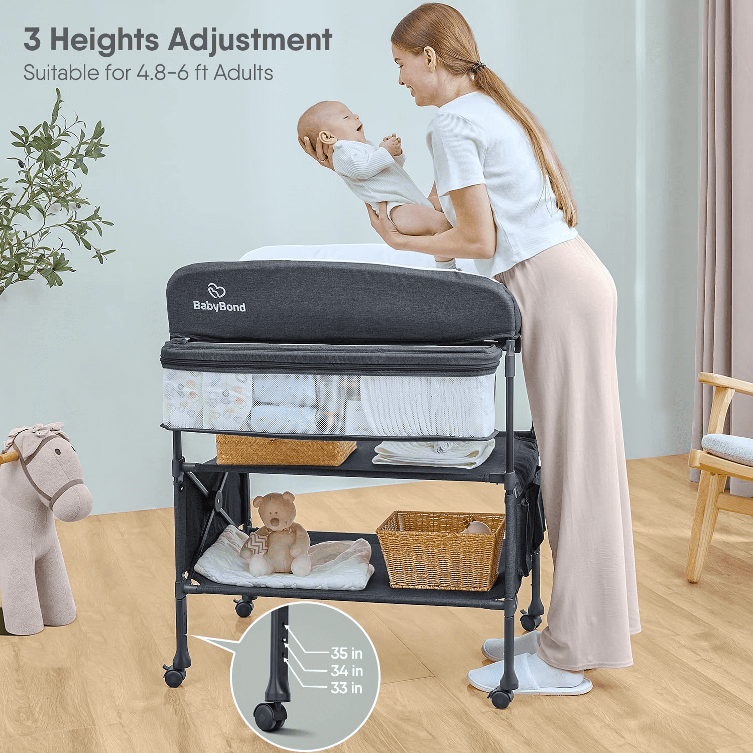 With upgraded storage space:this portable changing table provides ample room for storing diapers, clothes, tissues, and other baby essentials. This ensures that everything you need for a diaper change is conveniently within reach, making the process more efficient. When not in use, simply press one button to fold it, allowing for easy storage in a corner. Even as your children grow older, you can remove the wheels and transform it into a functional cabinet. Easy to clean:Changing diapers has never been easier. The changing table topper is made of waterproof PVC material, which can be easily wiped clean. To keep your baby entertained during diaper changes, two plush toys are included. Additionally, the table features a scale, allowing you to monitor your baby’s growth conveniently. Say goodbye to back pain and discomfort during diaper changes:The BabyBond Portable Changing Table offers three height adjustment options, ranging from 33 inches to 35 inches. This accommodates adults ranging from 4.8-6 feet tall, eliminating the need to bend or kneel. Furthermore, the table is equipped with four removable universal wheels, complete with safety locks. This makes it effortless to move the changing table from one room to another, providing ultimate convenience. Experience the ease and functionality of the BabyBond Portable Changing Table. Say goodbye to strained backs and hello to stress-free diaper changes. Get yours today and make those countless diaper changes a breeze.
