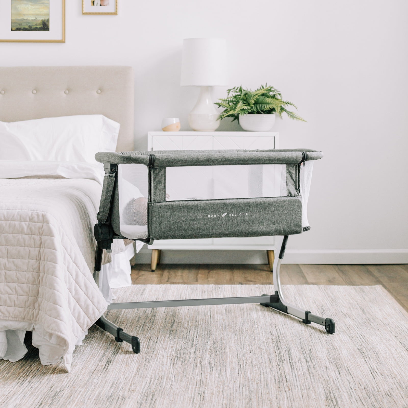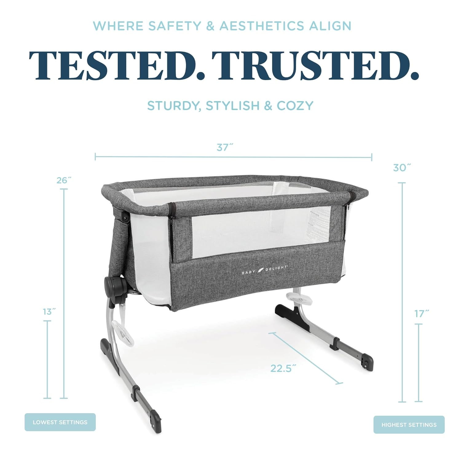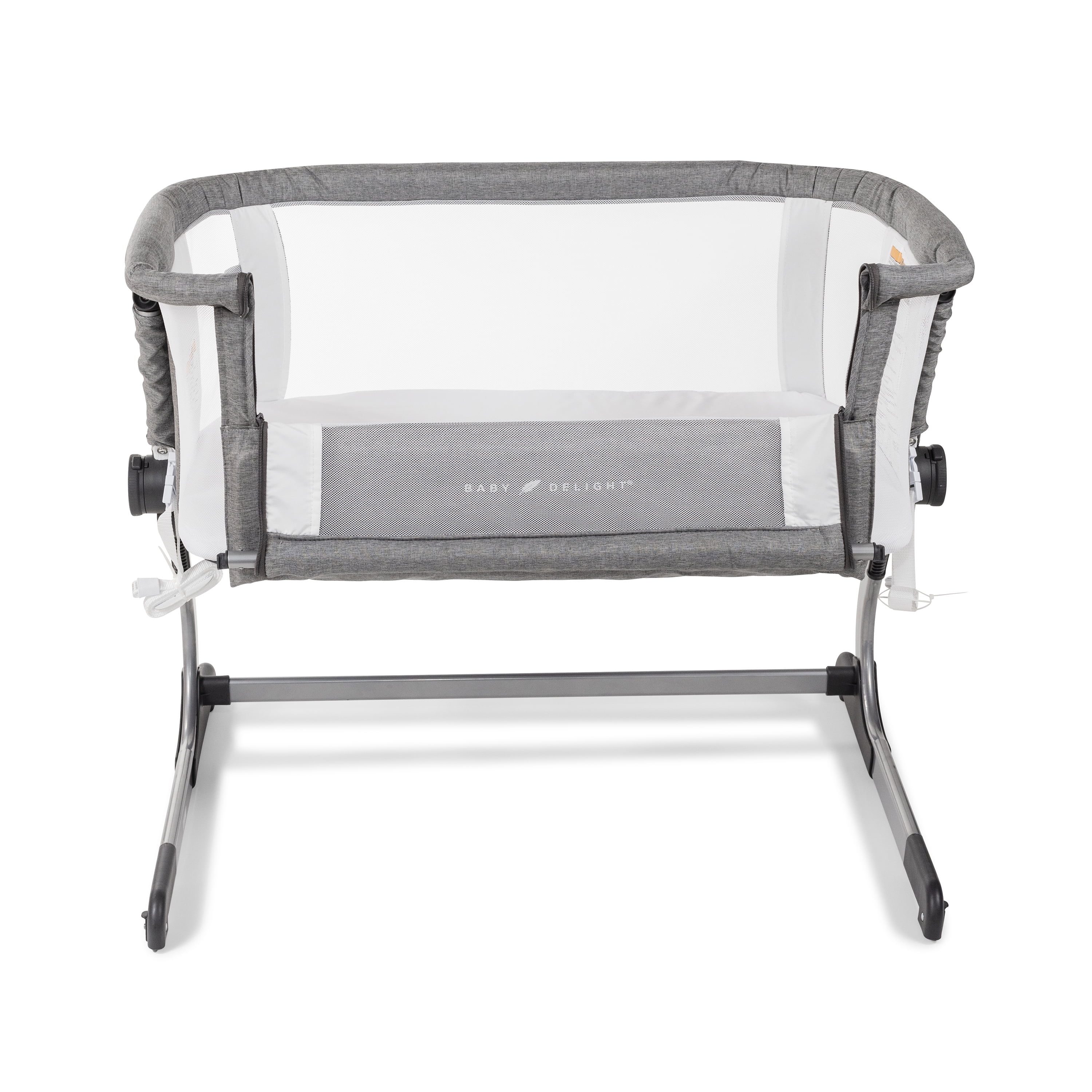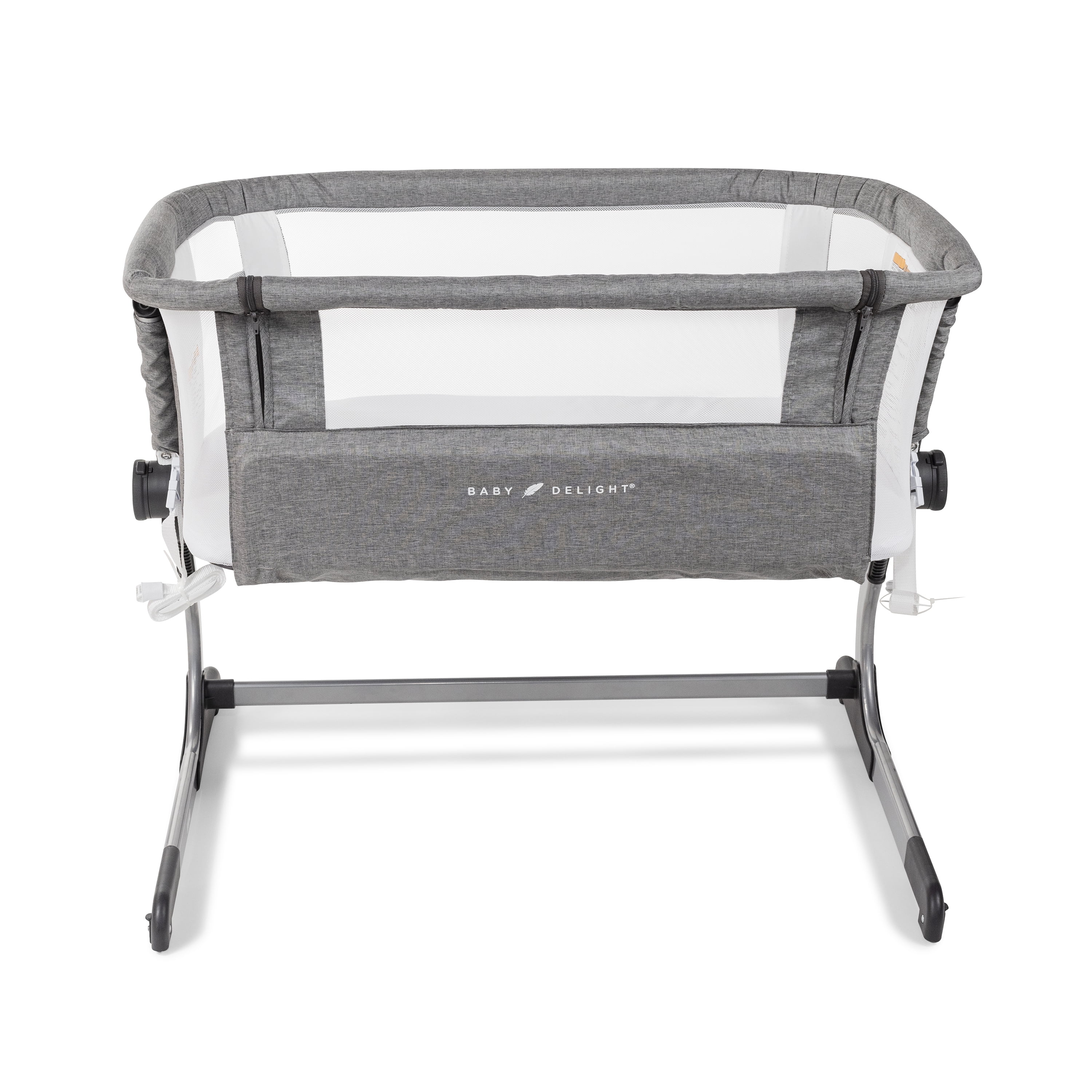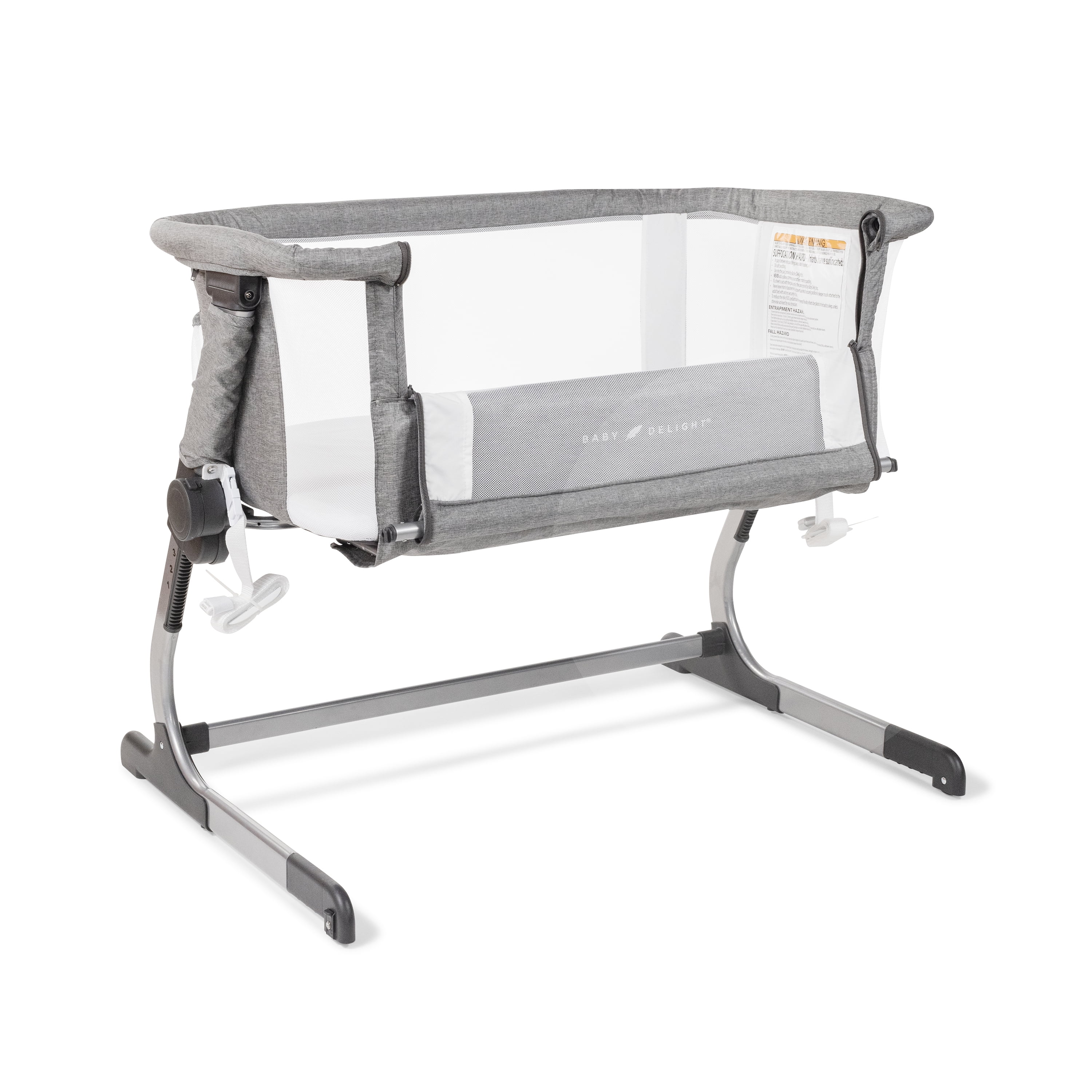 Baby Delight Beside Me Dreamer Bassinet & Bedside Sleeper, Charcoal Tweed, Ages 0-5 Months (Unisex) Breathable mesh side walls 6-position height adjustment Removable and machine washable cover and sheet Panel opens for easy access to baby from bed and bedside sleeper mode Easy, tool-free assembly Storage pocket Anchors to adult bed for added security in bedside sleeper mode According to safety guidelines, this product has no incline.