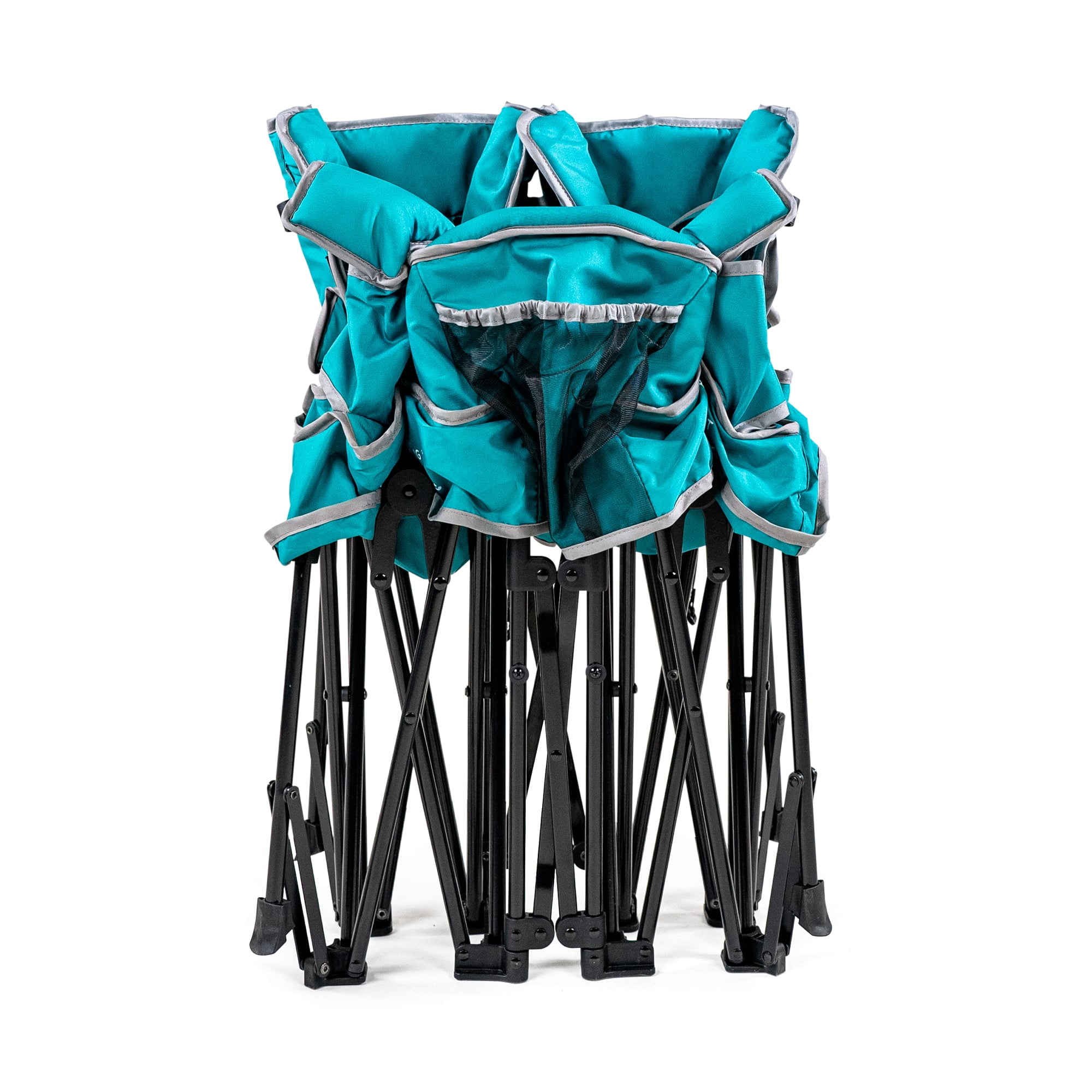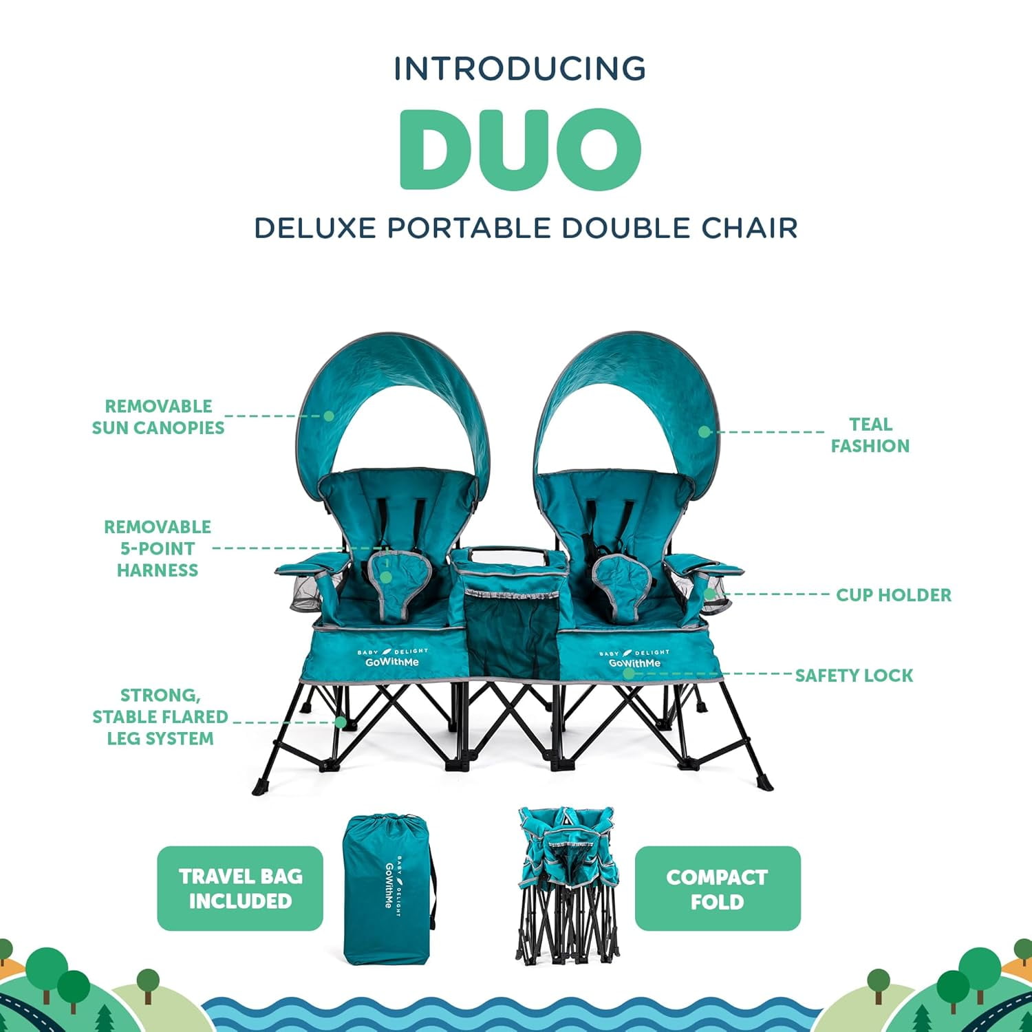 Go With Me™ Duo Deluxe Portable Double Chair – Teal The Go With Me™ Duo Deluxe Portable Double Chair is perfect for twins, siblings, or besties! This one-of-a-kind chair unfolds to reveal two separate seating areas for little ones ages 3 months – to 75 lbs. Added safety features include a strong, stable flared leg system, as well as locking mechanisms and a 5-point safety harness on each seat (which can be removed as the children grow). For outdoor adventures, two removable sun shades can be added quickly and easily. The built-in cup holders are sure to come in handy for bottles as well as sippy cups. And for storing snacks, toys, or books, easily accessible storage pockets are included between the two seats. When it’s time to get up and go, simply fold the Duo up and place it into the included storage bag. Ready? Set. Adventure, together! Unisex product.
