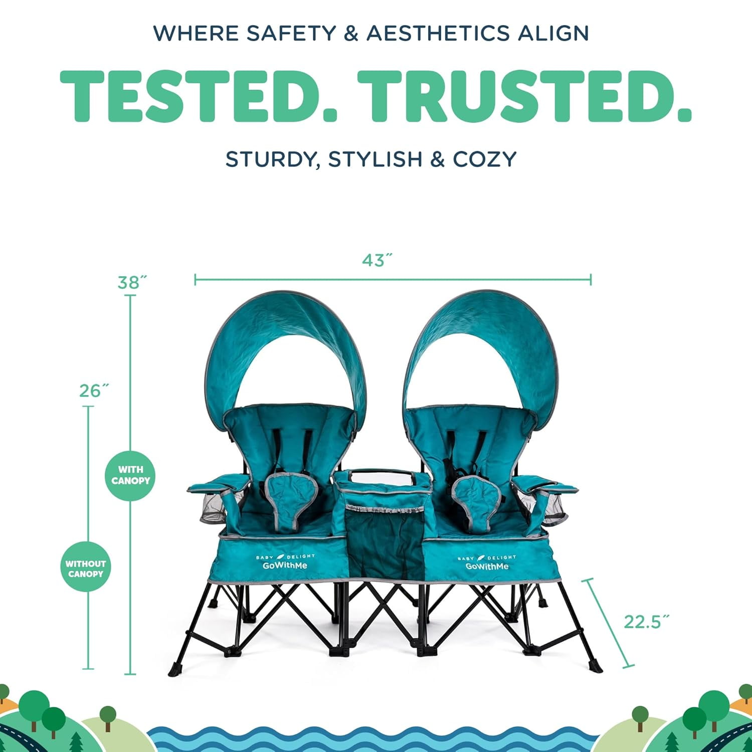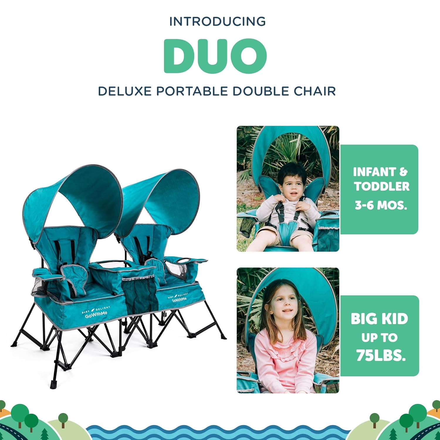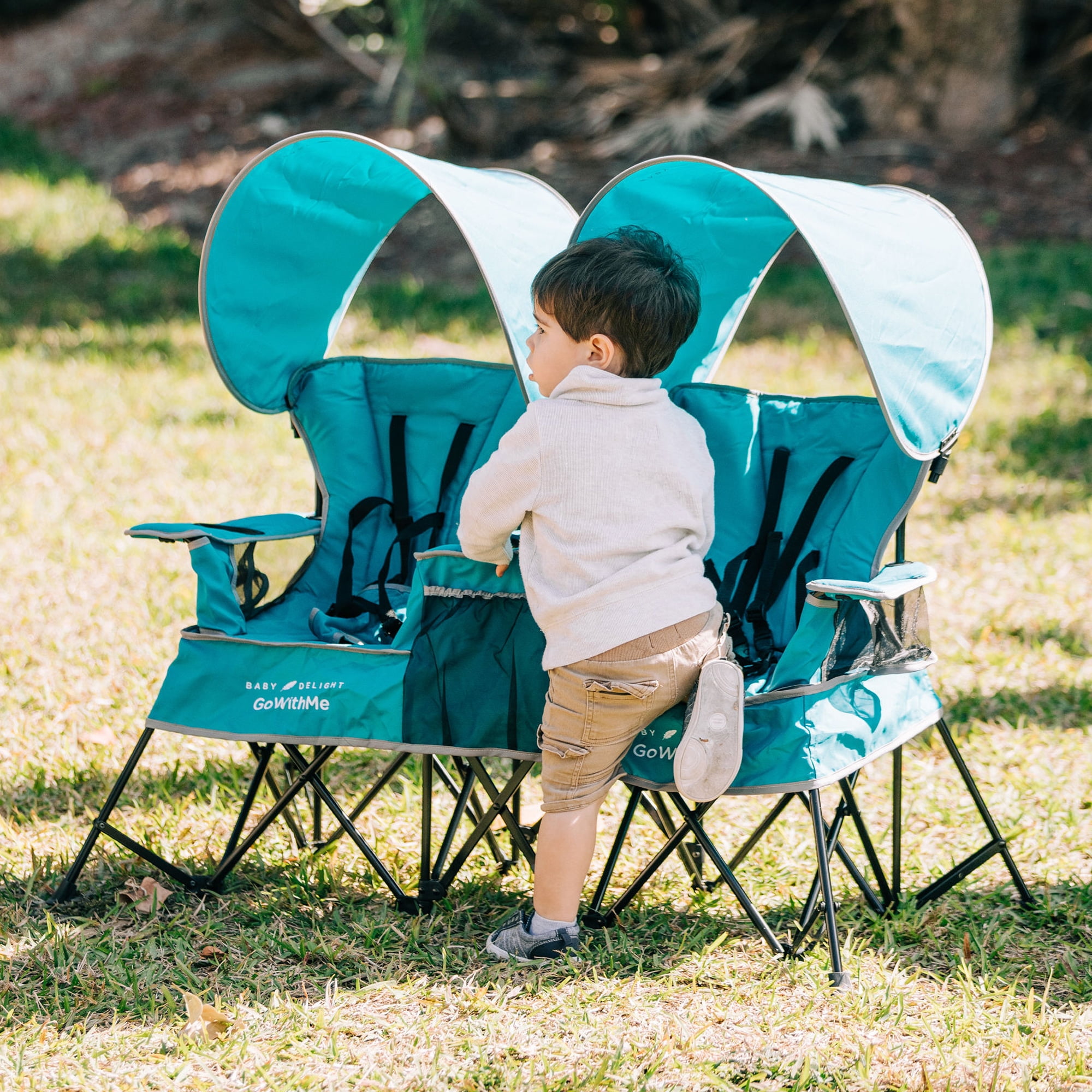 Baby Delight Go with Me Duo Deluxe Portable Infant Chair Double Seat, Indoor Outdoor, Teal (Unisex) Seats from baby (approx. 3 mos.) to 75 lb. child Stable flared leg system and locks for added safety 6 point removable harness keeps the baby secure and comfortable Wide seat and padded back for comfort Removable sun canopies Built-in storage area between two seats Built-in cup holder on each side Indoor/outdoor polyester fabric is resistant to fading, stains, and mold Quick fold design with carry bag