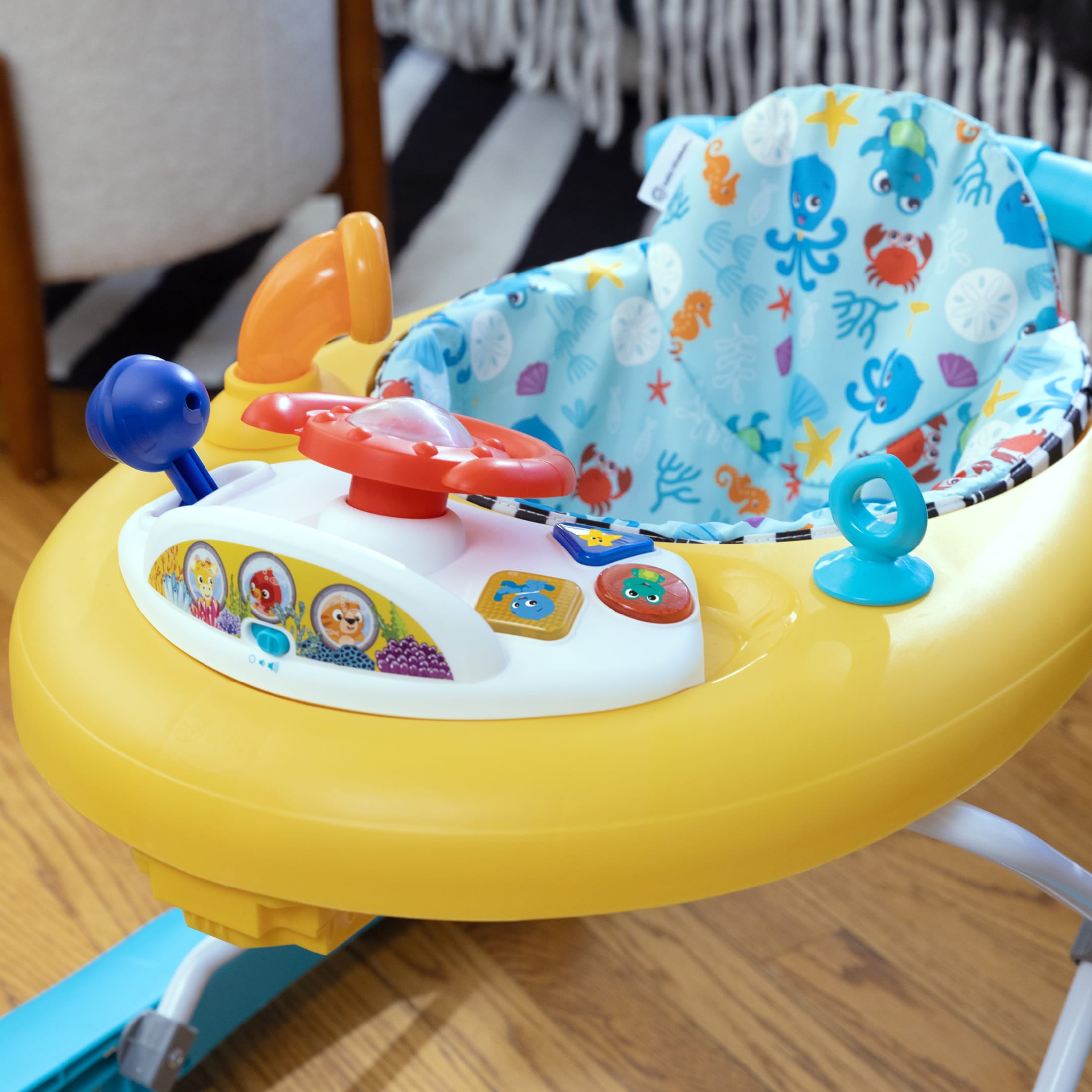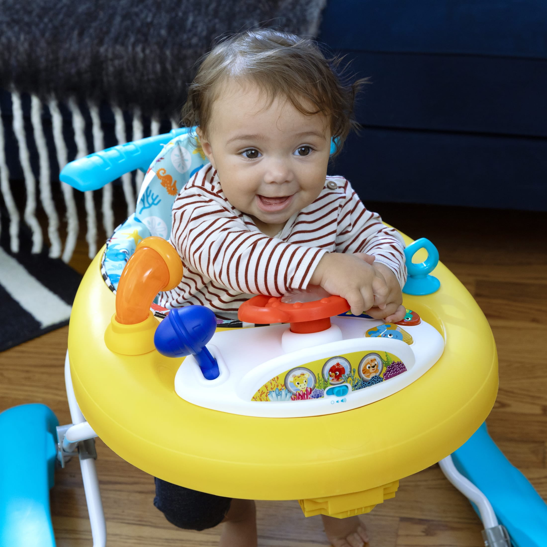 The Dive & Discover 3-in-1 Submarine Walker gives baby 3 ways to play and learn as they explore early walking, colors, shapes, & ocean sounds: Sit-In, Push Behind, and Floor Play. Features 3 adjustable heights to keep baby comfortable as they grow, up to 26 pounds. Older babies can use as a Push- Behind Walker or detach the electronic toy for Floor Play. A detachable, electronic toy station teaches color and shapes names and plays ocean sounds plus melodies. Features a periscope rattle and link loop to attach additional toys. Machine washable seat pad. Hard surfaces wipe clean. Requires 3 AA batteries (not included). Assembled dimensions: 19.5. x 28.6 x 25.4 inches. Supports fine motor skills development, cause-and-effect learning. Teaches in 4 languages: English, Spanish, French, & German. Unisex walker folds flat for easy storage and portability. Includes expert-developed Einstein Way Play Tips to inspire curiosity and foster purposeful parent-baby playtime.