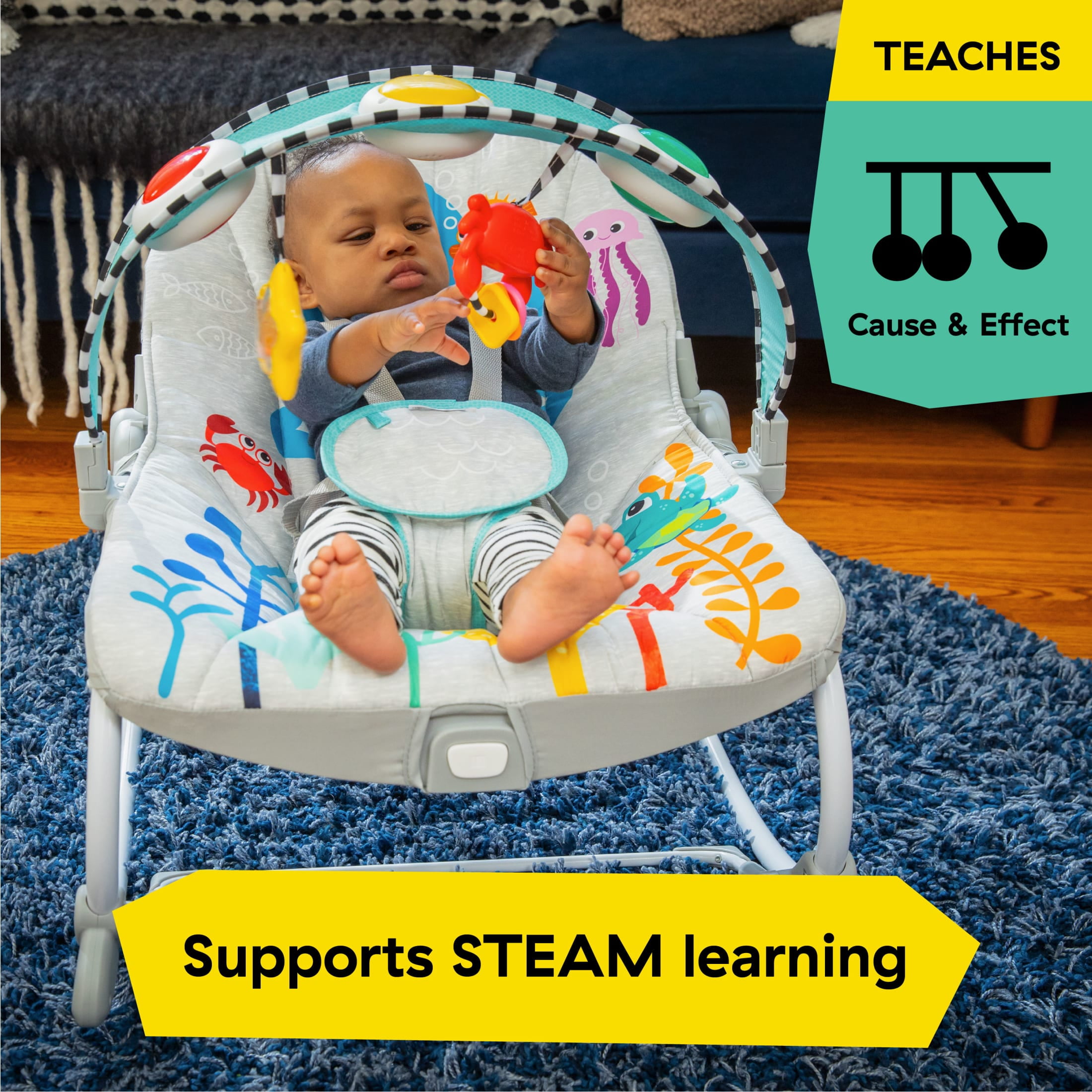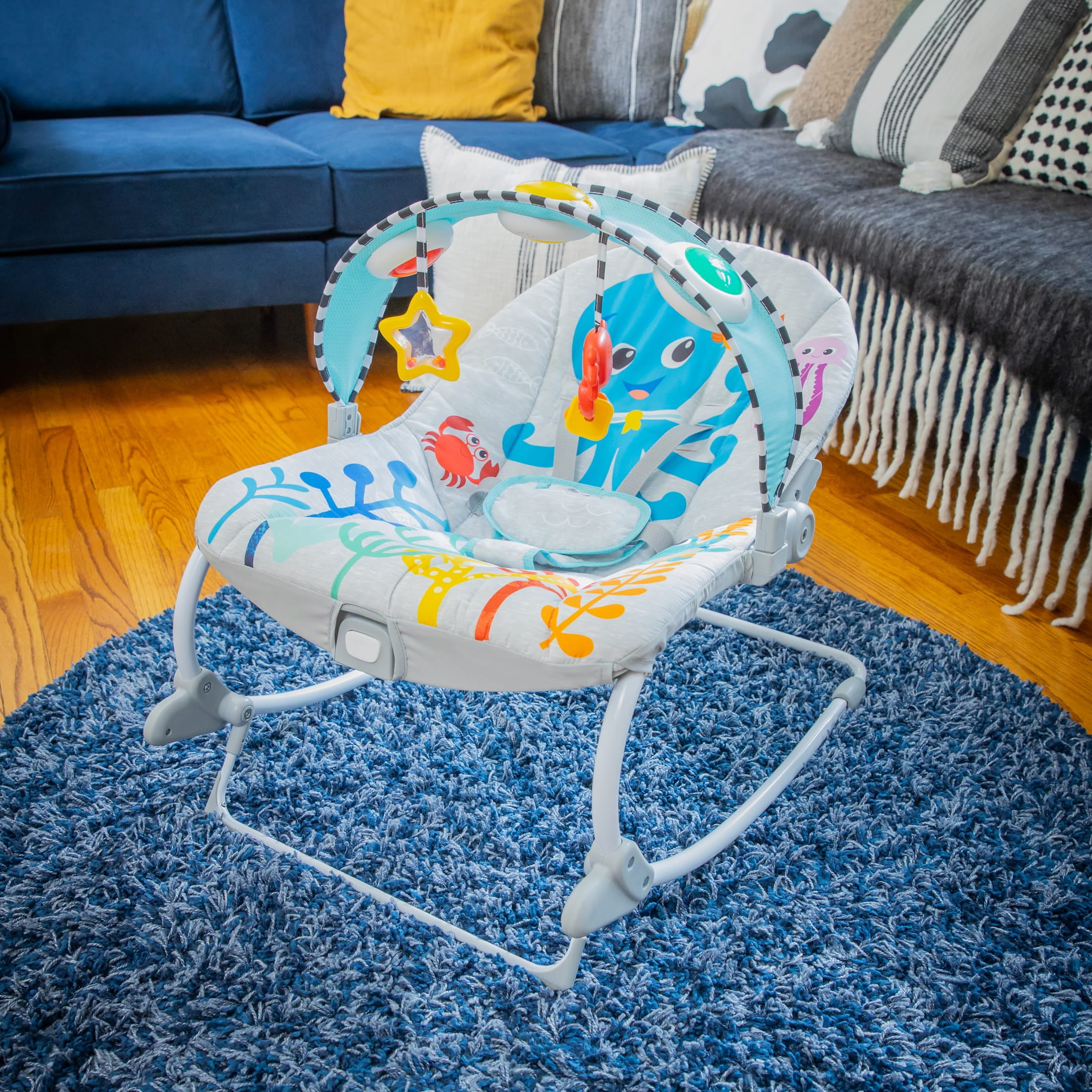 The Baby Einstein Ocean Explorers Kick to It Opus Infant to Toddler Rocker is a unisex, infant rocker and stationary seat that transforms into a toddler rocker as baby grows. 2 settings: In Baby-Activated, baby’s kicks are rewarded with lights and 25+ melodies and sounds. Parent-Activated plays 30+ minutes of music with dancing lights. Features a removable toy bar with lights, music, 2 dangling toys, and vibration setting to help entertain infants. Detach the toy bar to transform the infant rocker into a comfy, stationary seat for older babies, or to convert into a toddler rocker. Maximum weight for use: 40 pounds. Requires two AA batteries (not included). Soft seat pad features an ocean theme fabric and is removable for easy cleaning. Assembled dimensions: 27.3 x 19.7 x 23.3 inches.