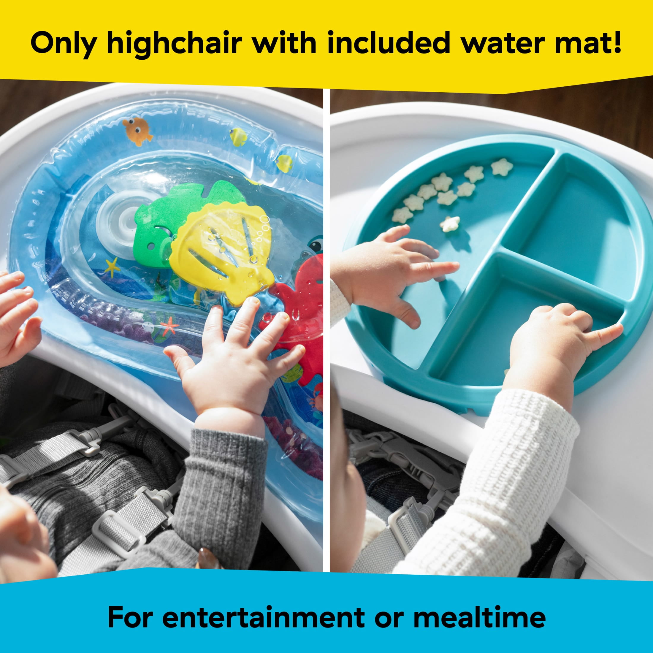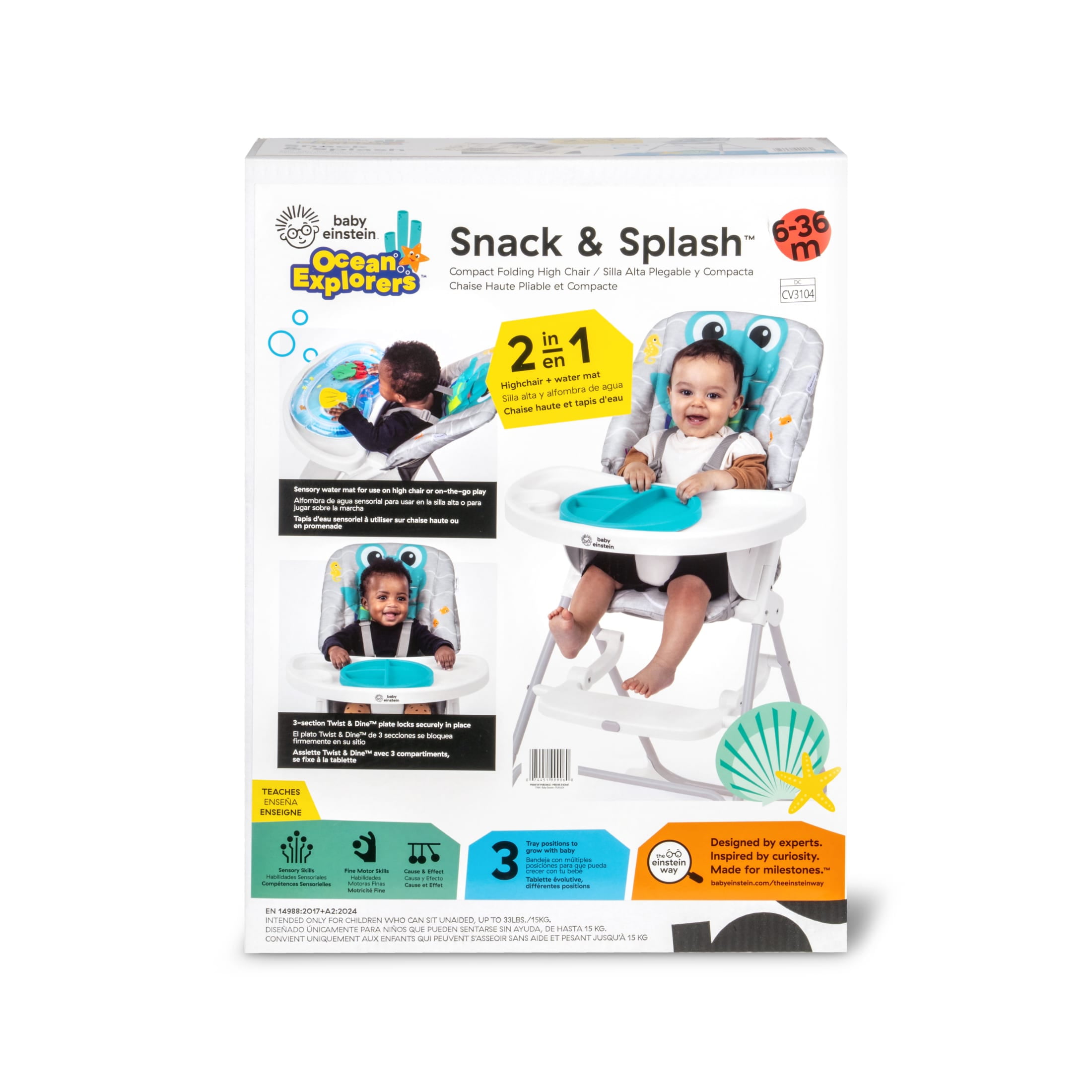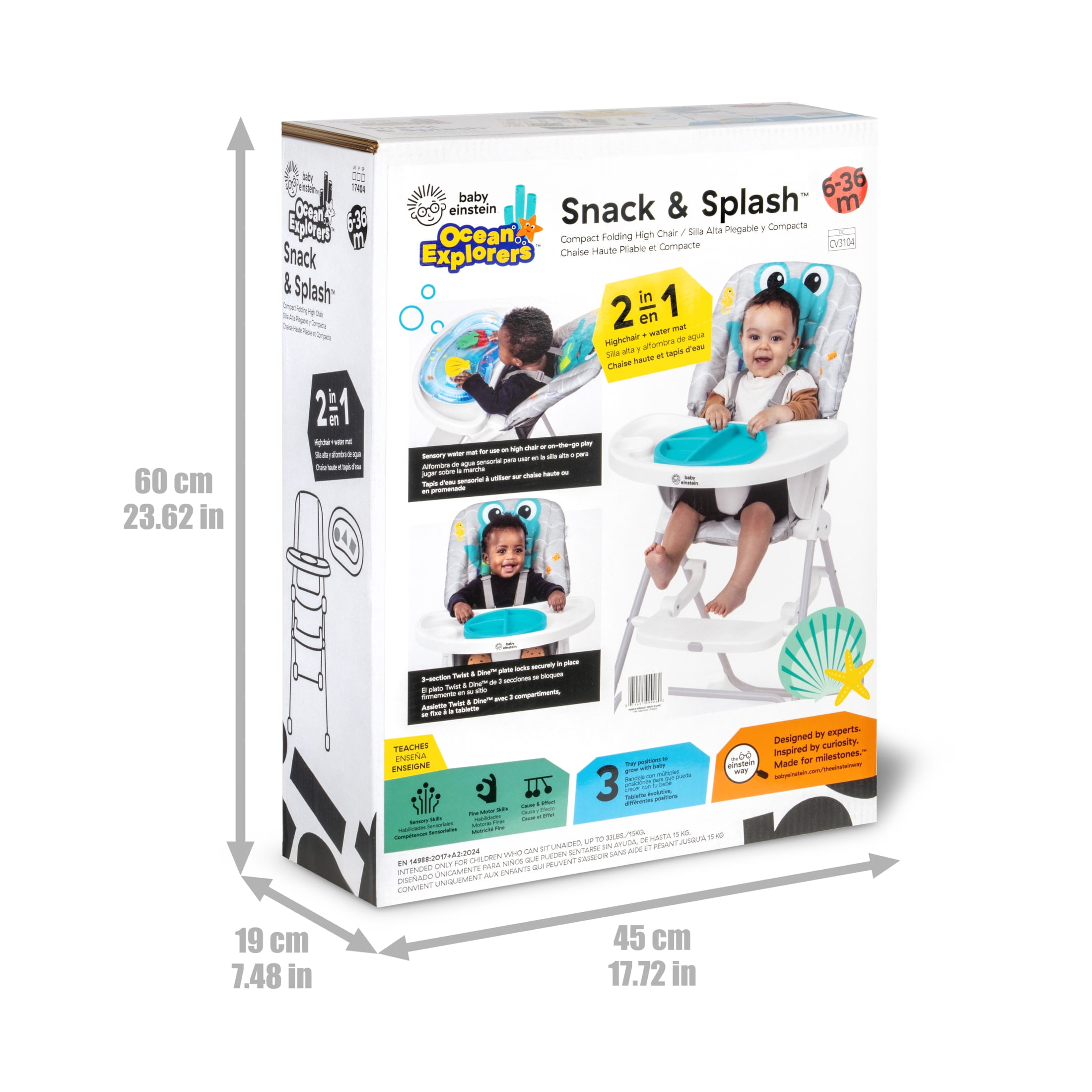 Save space in your home and give baby a comfy spot for mealtime and sensory play with the 2-in-1 Baby Einstein Ocean Explorers Snack & Splash Compact Folding High Chair; Sensory water mat with 3 floating animal shapes engages baby during meal-prep To keep water fresh in the water mat, add 1 TBSP white vinegar to the water and replace the water once a week; remove water mat for floor play to inspire baby’s discovery and fine motor skill development at home or on the go Twist & Dine 3-section plate is microwave-safe and encourages self-feeding; plate locks into place to prevent baby from tossing to floor; BPA-free tray and plate are made of food grade materials Large tray with built-in cupholder and 3 positions gives baby a perfect fit; Plate and tray are dishwasher safe and can be stored in bag on back of high chair No tools required for assembly; Machine washable seat pad features a 5-point safety harness; for ages 6 months to 3 years or 33 pounds, whichever comes first; Dimensions: 40.94″ (H) x 22.05″ (W) x 29.92″ (L)