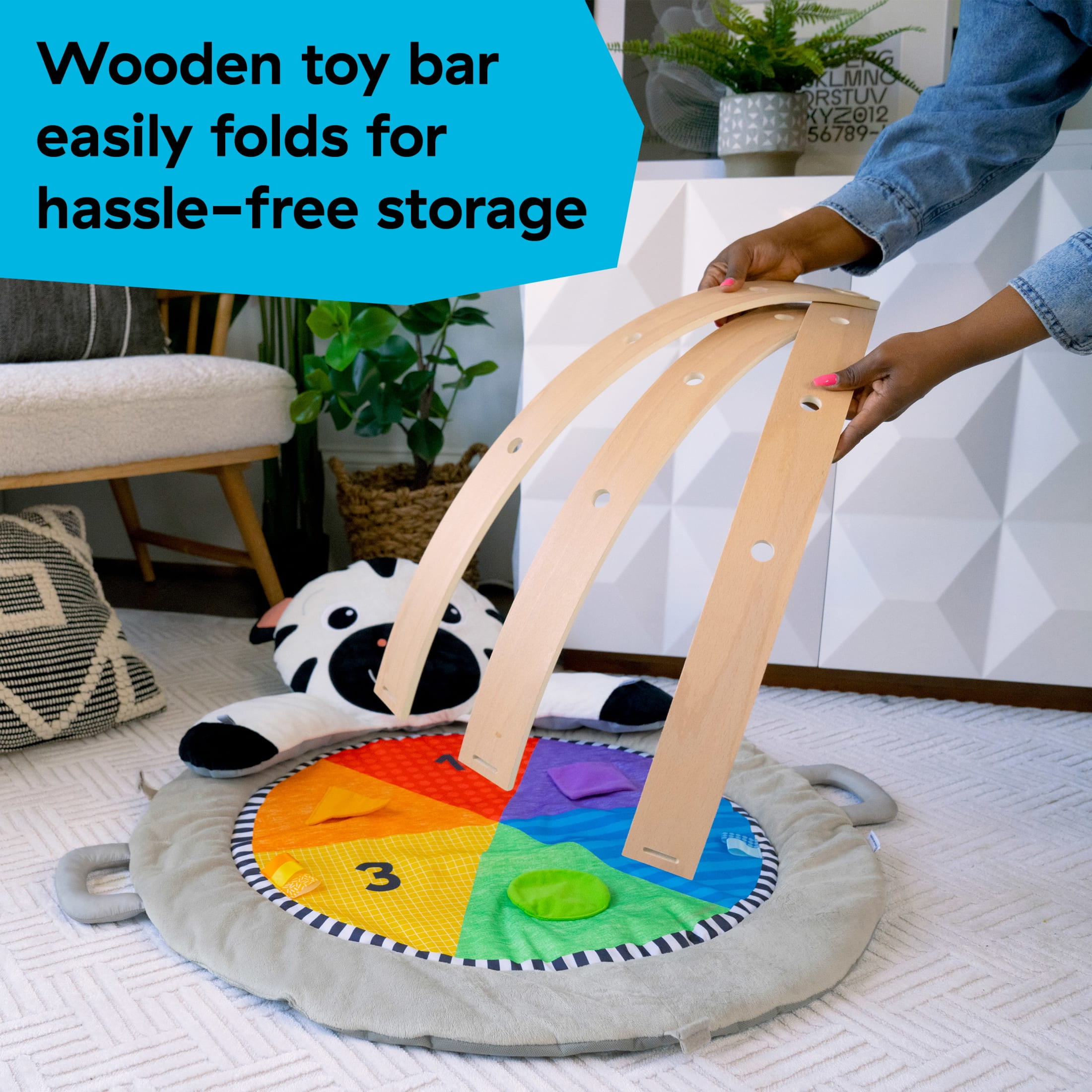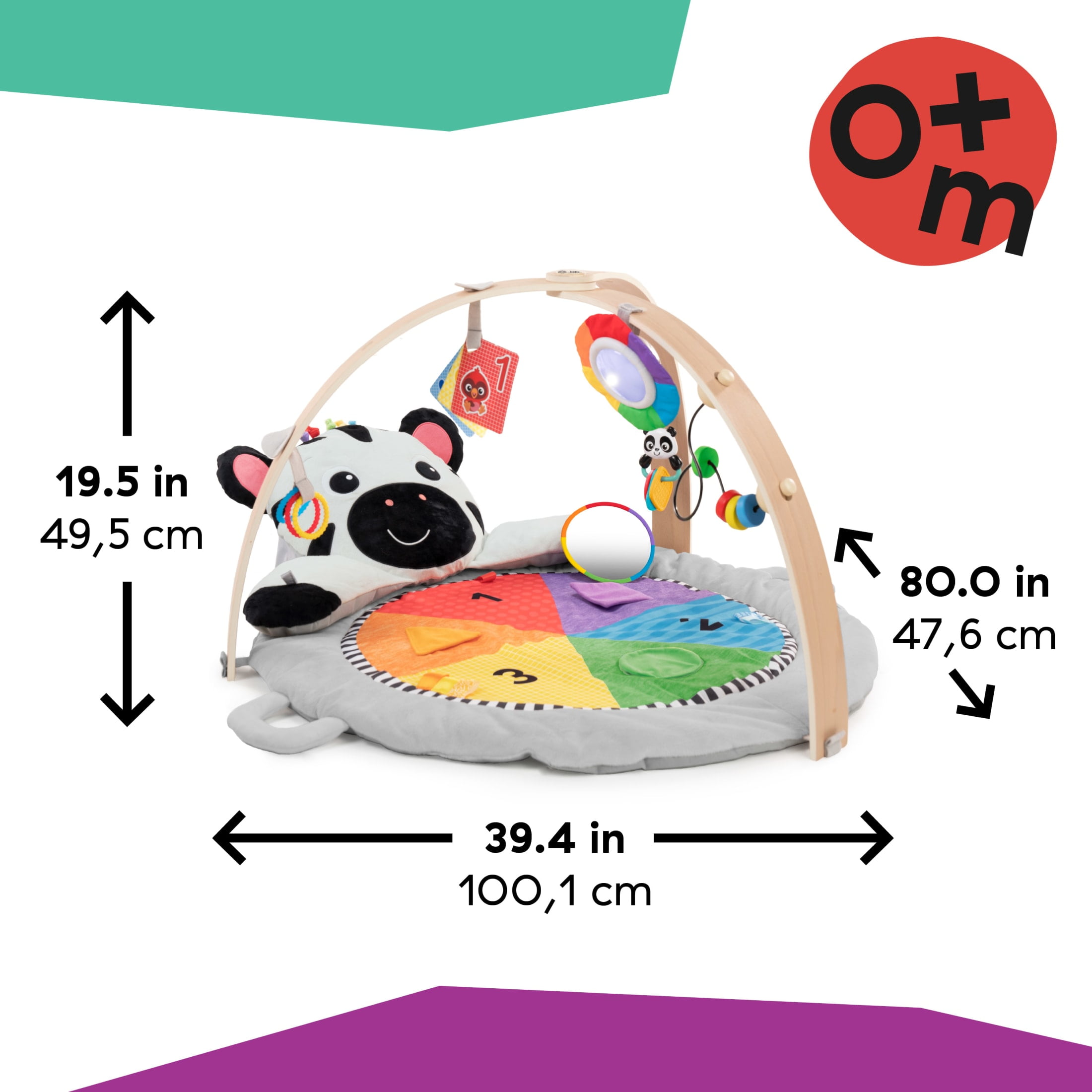 The Baby Einstein Zen’s Activity Milestones Plush Gym helps baby reach important milestones from 0-12 months through multisensory exploration and included play guide. Ultra-plush mat captivates baby with fabrics featuring high-contrast patterns, bright colors, varying textures, shapes, and numbers. 10+ toys & activities support motor skill development and sensory discovery through play with bead chasers, a baby-safe mirror, tummy time pillow, and more. Includes detachable toy with lights, music, and sounds to support color learning in 4 languages – English, French, German, & Spanish. Zen the Zebra prop pillow provides tummy time support and is a detachable plush friend. Assembled dimensions: 39.4 x 31.5 x 19.5 inches. Requires 3 AAA batteries (not included).