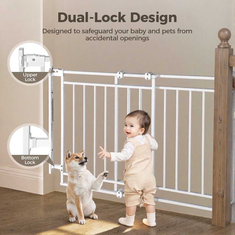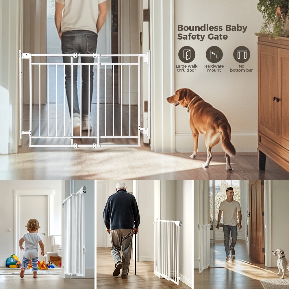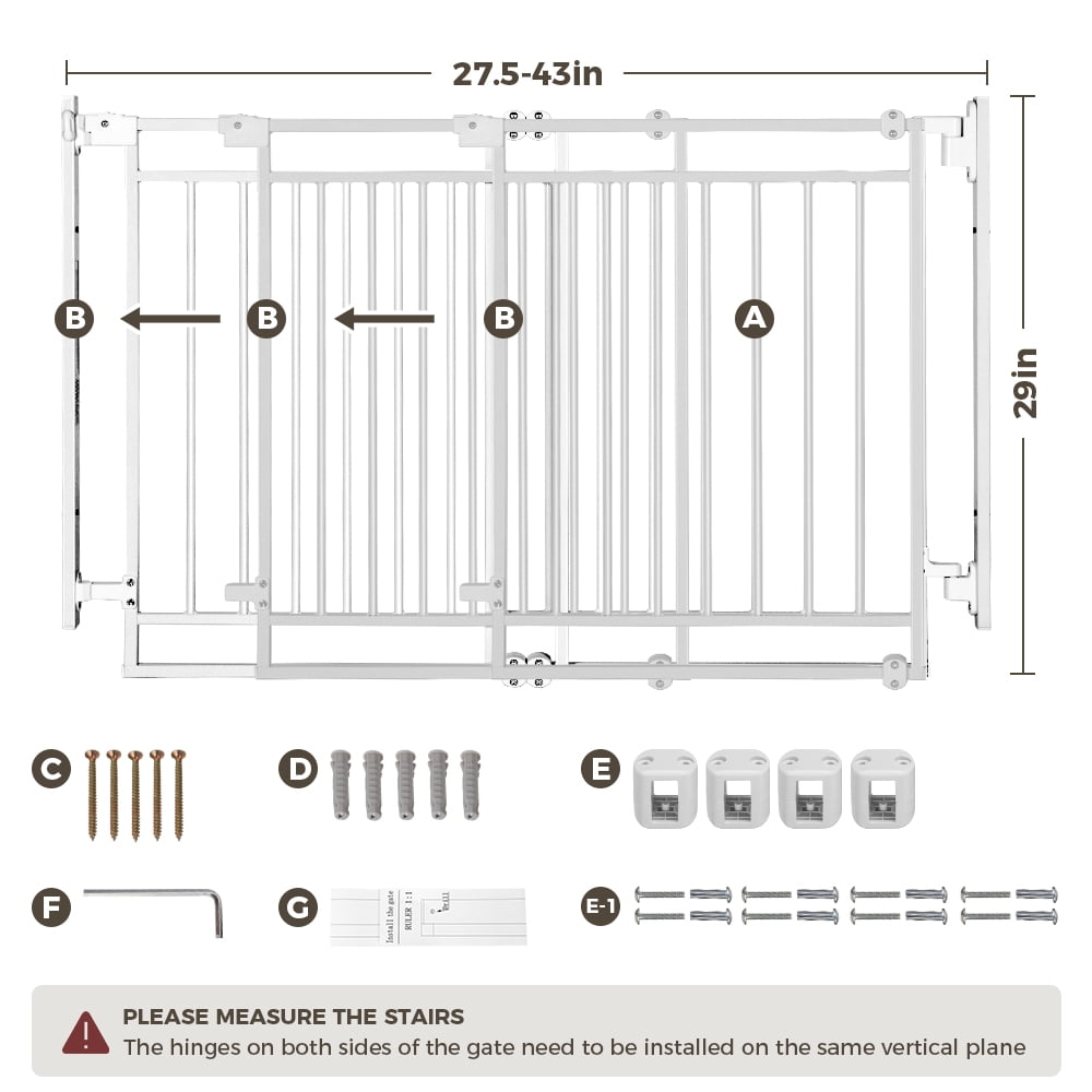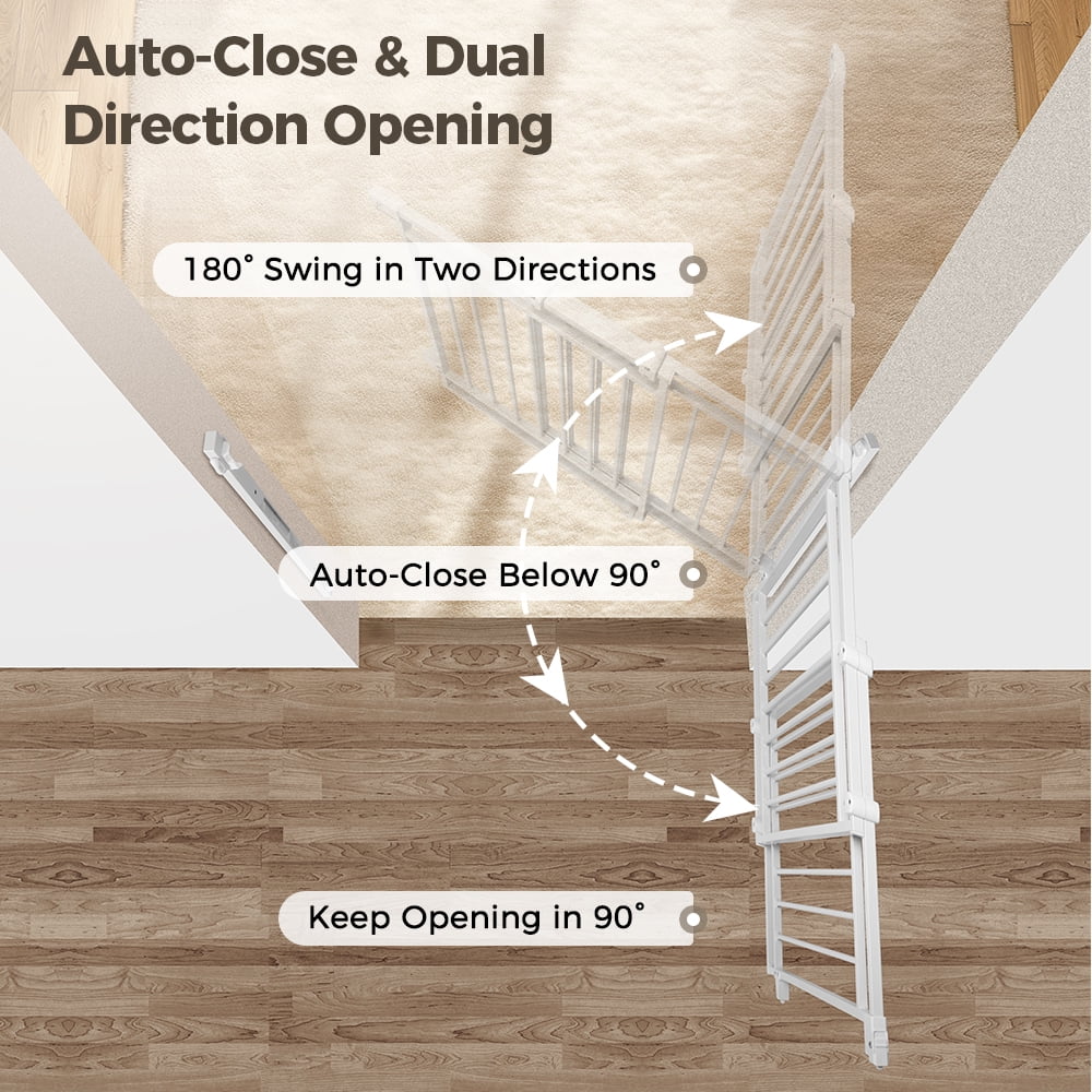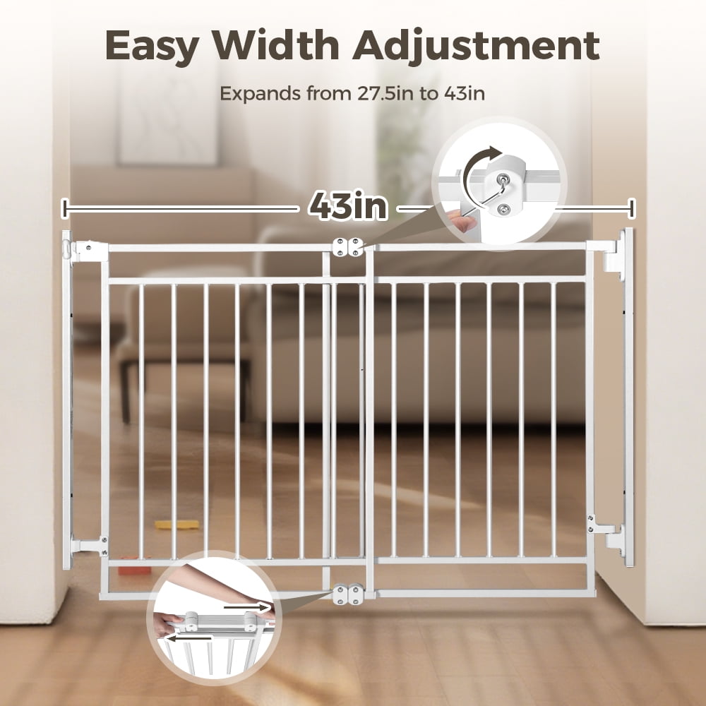 【No Bottom Bar Design】Our sleek, no-threshold baby safety gate eliminates tripping hazards, while the extra-wide opening provides full swing for easy walk-through, accommodating strollers, wheelchairs, and carried items. Ideal for stairs with banisters, this baby gate ensures safety and convenience. 【Auto-Close Feature】Equipped with an auto-close mechanism, this baby gate for stairs closes softly behind you. The stay-open feature is a convenient addition for times when you need the baby safety gate to remain open, and single-handed operation makes it a breeze to use even when your hands are full. 【One-Handed Operation for Convenience】Open and close the baby gate with one hand, making it easy to access while carrying a child or groceries. This baby safety gate feature adds convenience to your busy day. 【Wide & Adjustable Fit】The adjustable width from 27.5 to 43 inches makes this baby safety gate perfect for wide doorways, stairways, and hallways. Designed to fit most openings, it provides secure protection for children and pets. 【Versatility】Crafted for longevity, this high-quality metal baby gate combines strength and style. Whether you need a baby safety gate for stairs, a baby gate without bottom bar, or a baby gate for doorways, this versatile product meets all your needs. More than just a gate, it’s a reliable partner in safeguarding your loved ones.