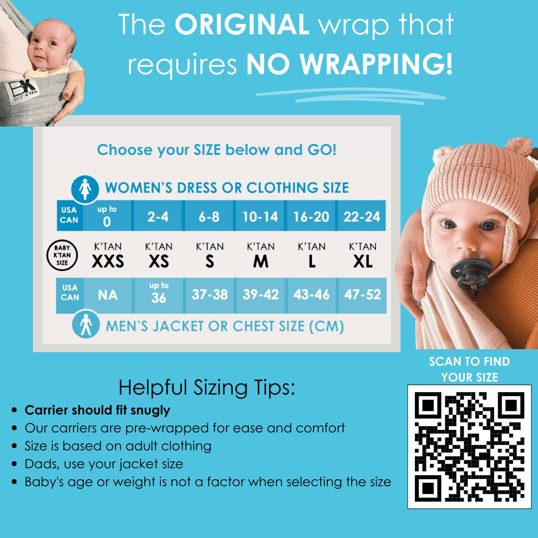 HANDS FREE BABYWEARING: Keep newborn babies, preemies and infants close while you go about your day. Our unique baby wrap design also supports your best position for easy breastfeeding on the go. (If under 8 lbs, consult healthcare professional) SIMPLE DESIGN: The Baby K’tan baby wrap is quick and easy to wear – no rings, belts, buckles or excess fabric. This infant carrier is the no-wrap wrap! Just slip the sling over your head like a t-shirt. COMPLETE COMFORT: Made from 100% cotton, our baby carrier allows even weight distribution, and the breathable fabric is soft against baby skin. Not bulky or frilly – ideal for both moms and dads. SAFE AND SECURE: Our infant holder’s unique double loop design and one way stretch hold your baby securely in place, and the wrap carrier’s natural seated position is Approved Hip Healthy by the International Hip Dysplasia Institute. 5 POSITIONS: Our infant carrier wrap grows with your child – choose the best position from sling wrap for newborn babies & preemies to an upright seated carrier for newborns up to 35lbs. (Under 8 lbs, consult medical professional) Pre Wrapped and Ready to Wear. CHECK SIZING CHART Sized to fit you! Please Check Sizing Chart