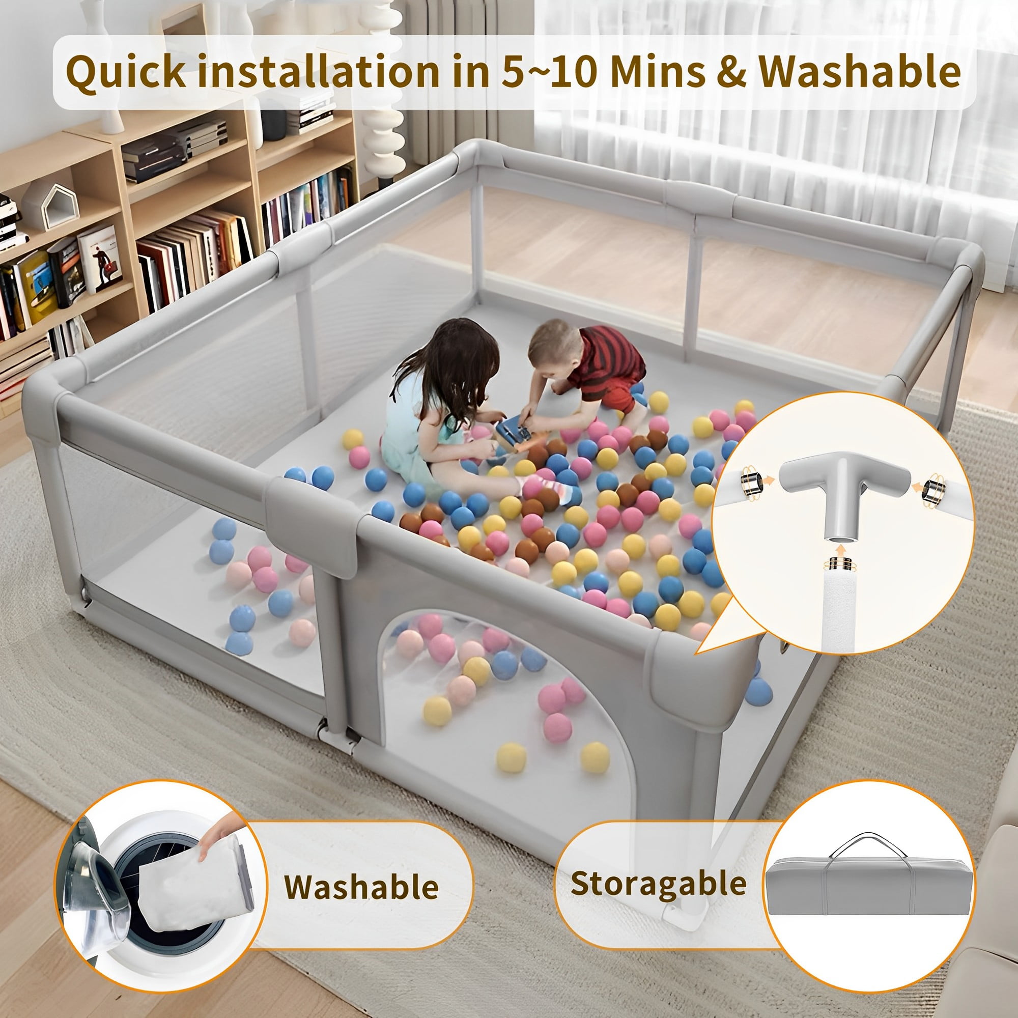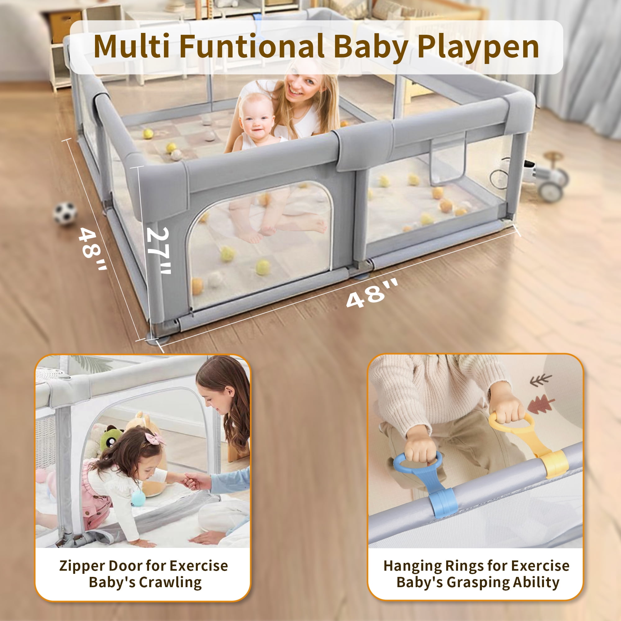 Features: 【Large Baby Playard】 The 48*48*27 inch play yard for unisex is spacious enough for 2 toddlers to play at the same time. Whenever your baby uses this indoor/outdoor play area, they will enjoy immense comfort. The playpen goes with 2 handles and 1 storage bag. The storage bag can put your child’s necessities. 【Safety Play Area】 Baby play fence it is made of oxford fabric. There are 8 sturdy safety non-slip suction cups on the bottom, which are difficult to move or tip over.The bottom is made of non-slip, breathable, quick-drying, fabric. Only need to wipe with wet cloth and soap to clean. 【360° Full Vision Design】The four side walls of the playpen are made of visible and breathable mesh. Children can see their mothers outside the fence from multiple sides no matter sitting or lying down, which will make them feel safe. 【Easy To Assemble & Store】Baby playard use alloy steel pipe and plastic joint connection, easy to assemble and disassemble.It can be removed in minutes (no tools required). With a bag provided, easy to store and carry. (No padding at the bottom, you need to buy an extra baby play mat) 【Parent’s Good Helper】Our baby pens can effectively help children explore the perceived world, play, and learn to move in their own world, keeping them away from being lost or exposed to dangerous areas. Mothers can free their hands to do their own things.Baby Playpen Package Details Baby playpen x 1 Handlers x 2 Storage bag x 1 Carry bag x 1 Suction Cup Three Link x 4 Suction Cup Straight Tree Link x 4 Steel Pipe x 16 Steel Pipe & Foam Film x 8 NOTE: Toy balls and mats are not included
