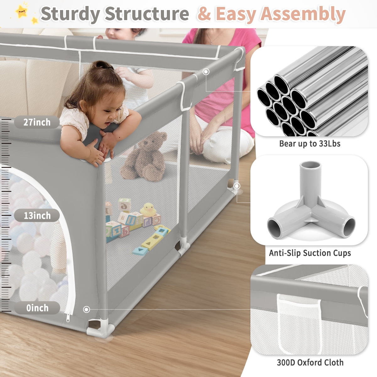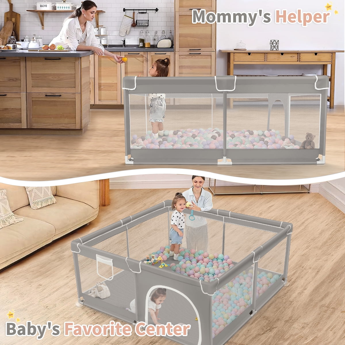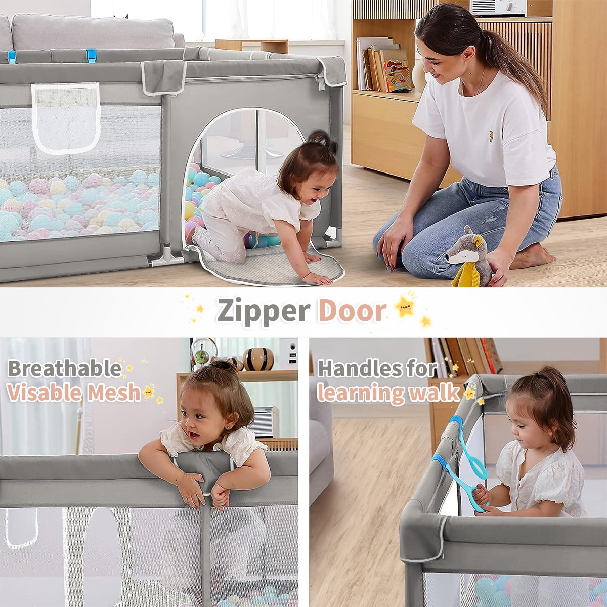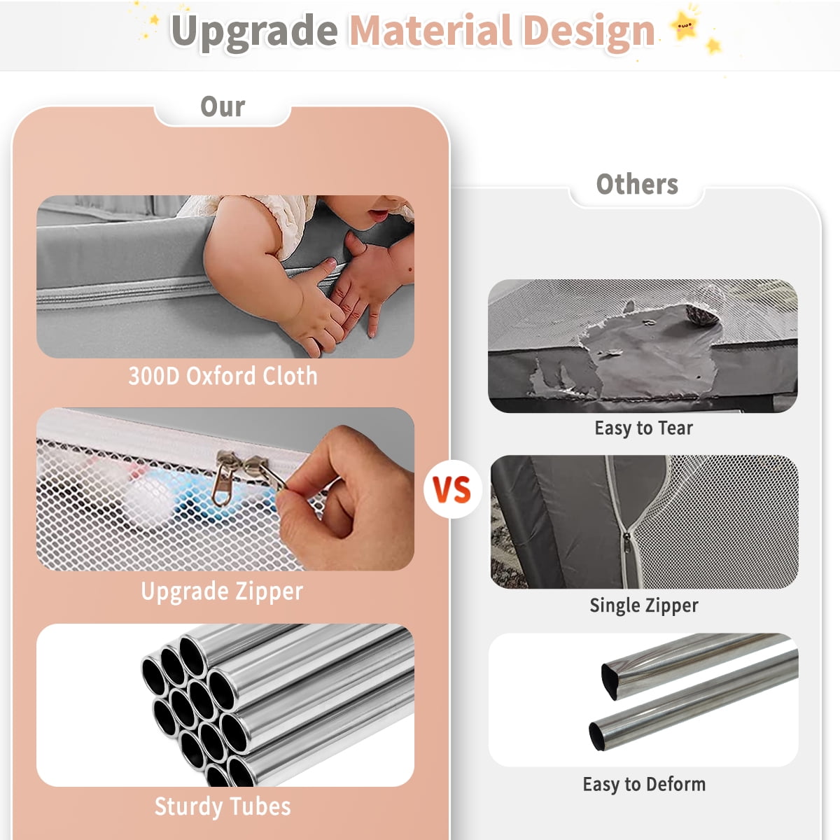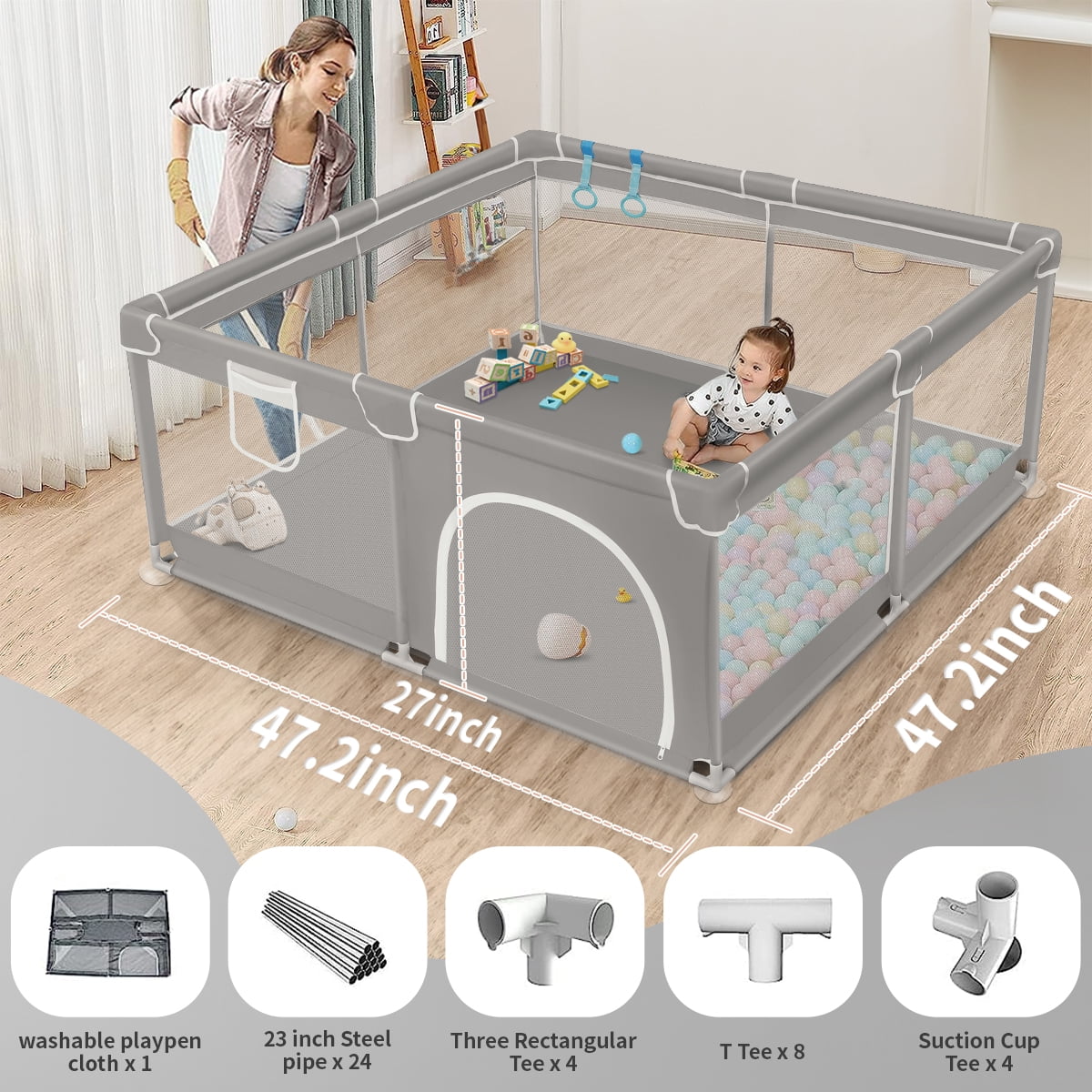 Free Parent’s hands With the help of HDJ Large baby playpen, turns it into a great safe playgrounds for babies! Help kids explore the world of perception, play and learn to move in their own, and keep it away from being lost or exposing to hazard areas as well. Meanwhile, the parents can free their hands to do their own things. Baby’s favorite play space HDJ’s playpen for toddlers, the size is 47.2 * 47.2 * 27inch (the size is the inner diameter of the baby playpen), the height of the baby fence is long enough for toddlers 6 months to 6 years old to stand and walk. The area is large enough, both you and your little one will enjoy immense comfort whenever you use your indoor/outdoor play area. 360° full vision design Visible soft breathable mesh in the side panels. See-through mesh that allows to you sees the baby, and the baby sees you, make them feel comfort and safe. The external gate zipper design, allow to interact with your baby at any time, give your baby a sense of security. Strong and sturdy playpen for babies It is made of oxford fabric and strong steel pipe. There are 4 sturdy suction cups on the bottom, which are difficult to move or tip over. A thicker sponge has been added to prevent children from being hit while playing. At the same time, our fence is entirely wrapped in soft cloth, there is no exposed gap, there is no danger of pinching, and it is safer than plastic baby playpen. Easy to assemble, store and clean The baby fences pipe are made of rust-proof alloy pipes and ABS joints connection, easy to disassemble and assemble. With a bag provided, easy to store and carry. The bottom is made of non-slip, breathable, quick-drying, fabric. Only need to wipe with wet cloth and soap to clean.(Please note: There is no padding at the bottom, You need to purchase an additional baby play mat .)