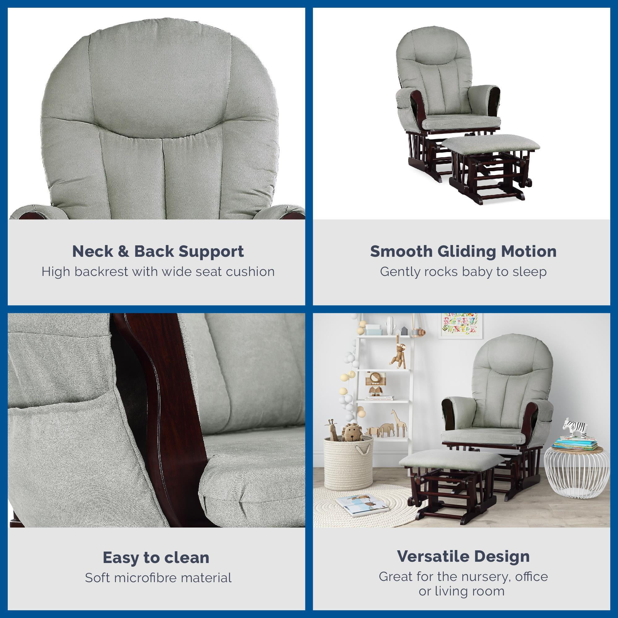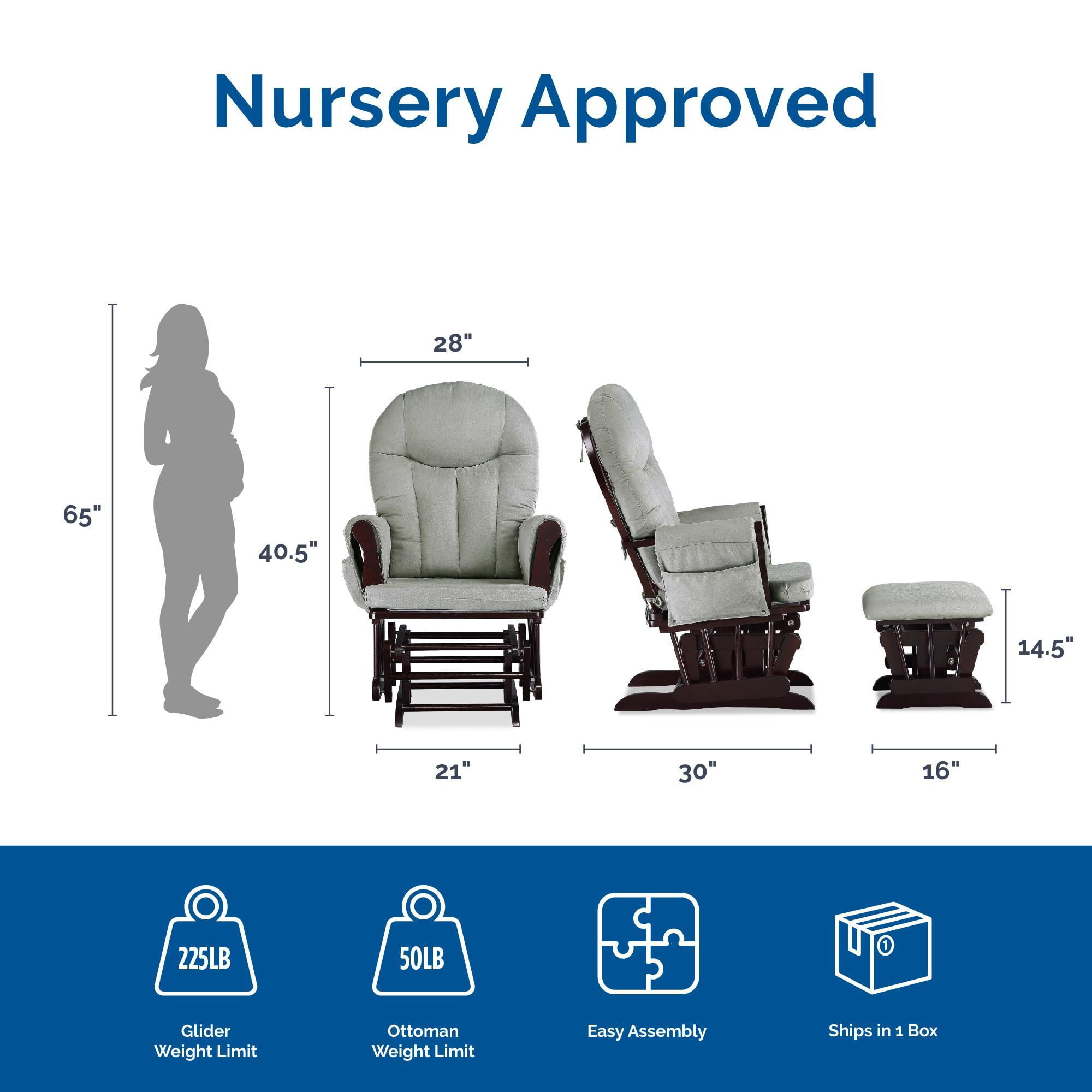 TOTAL PACKAGE: Our 2-Piece Nursery Glider and Ottoman Set offers parents firm support and is a great investment for any baby room. The traditional rocker presents a solid wooden base and a smooth gliding mechanism for super-quiet rocking chair motion STORAGE SAVIOR: Padded armrest covers come with useful outer storage side pockets, letting moms and dads quickly tuck away baby books, bottles, and pacifiers as they sway their infants to sleep, catch up on one-on-one time, or do nightly feedings SUREFIRE QUALITY: The strong accent chair has a handsomely finished wood frame and the high backrest with wide seating, featuring microfiber and foam removable cushions, provide needed breathing room, while the ottoman footrest relieves aching feet PROVEN PRACTICALITY: Ships with all necessary parts, tools, and instructions included in box for hassle-free assembly in 20 minutes or less. Wipe easy-to-clean microfiber with a damp cloth to gently remove spills or stains. 1-year limited warranty SAFETY TESTED: Glider – Size: 28″L x 30″W x 40.5″H. Weight limit: 225 lbs. Ottoman – Size: 21″L x 16″W x 14.5″H. Weight limit: 50 lbs. Meets flammability requirements. Does not contain flame retardant chemicals. TSCA Certified for formaldehyde