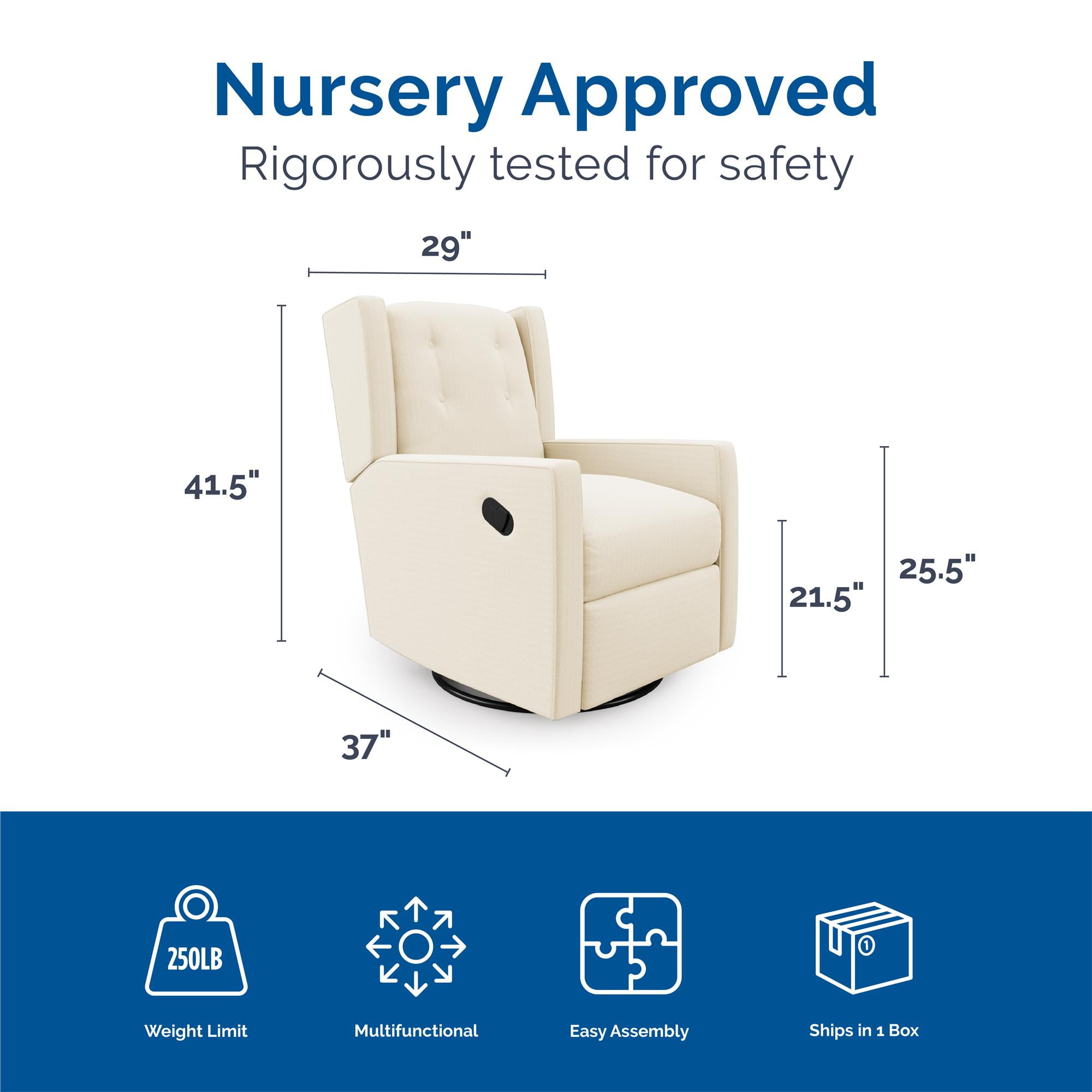 Softly upholstered with contrast button tufting, this modern wingback 4-in-1 swivel glider rocker recliner brings the charm factor to any nursery with relaxing rocking, gliding, reclining, and 360-degree swivel chair activity to help infants sleep Aids moms and dads by offering comfort first features like a high cushioned backrest, padded track armrests, and a cushy pocketed coil foam fill seat with a discreet outer arm handle that cues pushback recline and lift up footrest ease for tired legs Styled for every baby room and kids space, living room, or bedroom, our durable chair construction employs a sturdy plywood frame, no-sag spring foundation, steel recline mechanism, and heavy-duty metal base for infinite support Ships in one easy to handle box with all parts, tools, and instructions included for quick and worry-free assembly in under 15 minutes. Easy to clean 100% polyester linen fabric is resilient and wipes free of spills and stains with a damp cloth Recliner dimensions: 30″L x 37″W x 42″H. Weight limit: 250 lbs. Net weight: 89 lbs. 1-year limited warranty. Rigorously tested to meet safety standards and flammability requirements. Does not contain flame retardant chemicals. TSCA Certified for formaldehyde
